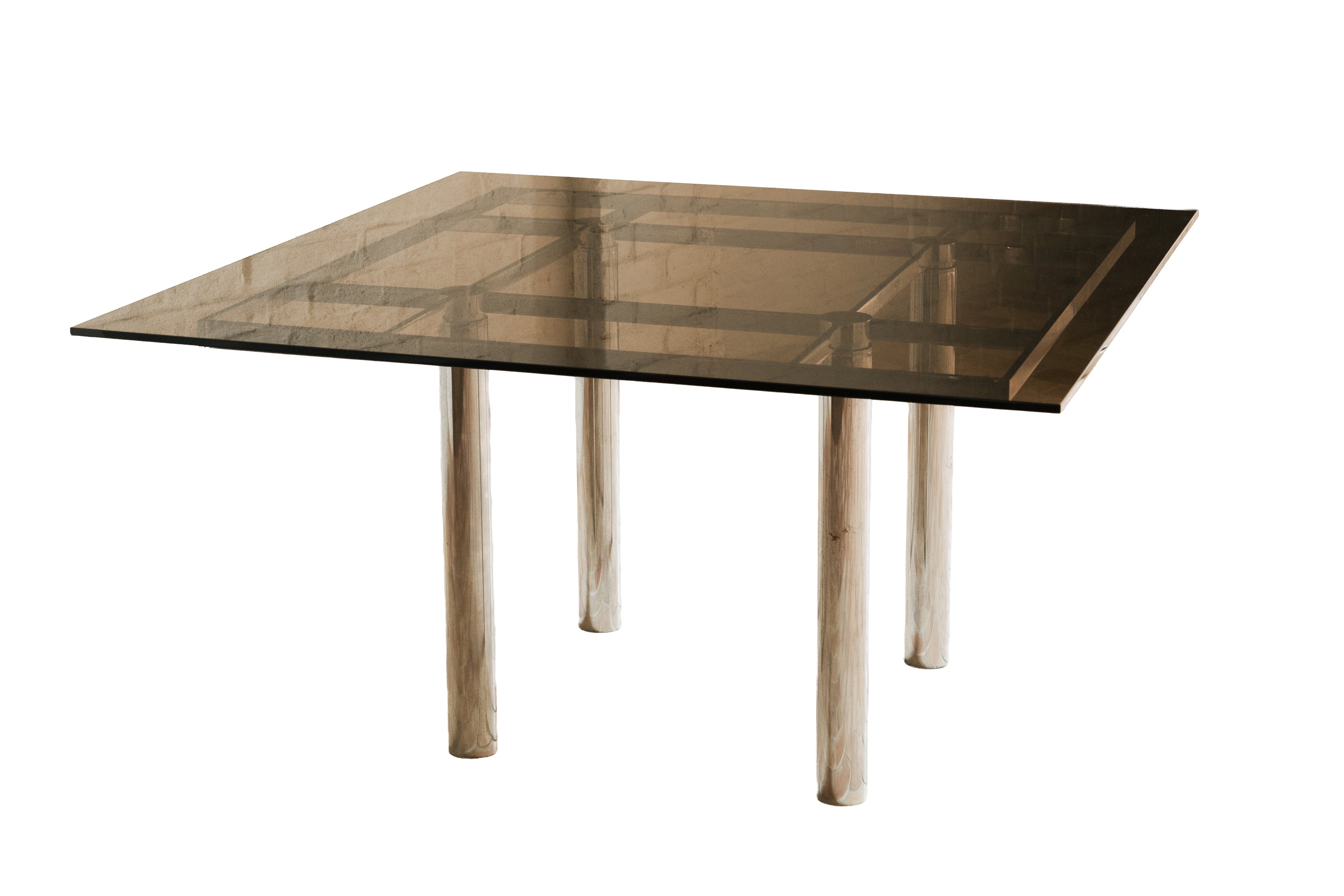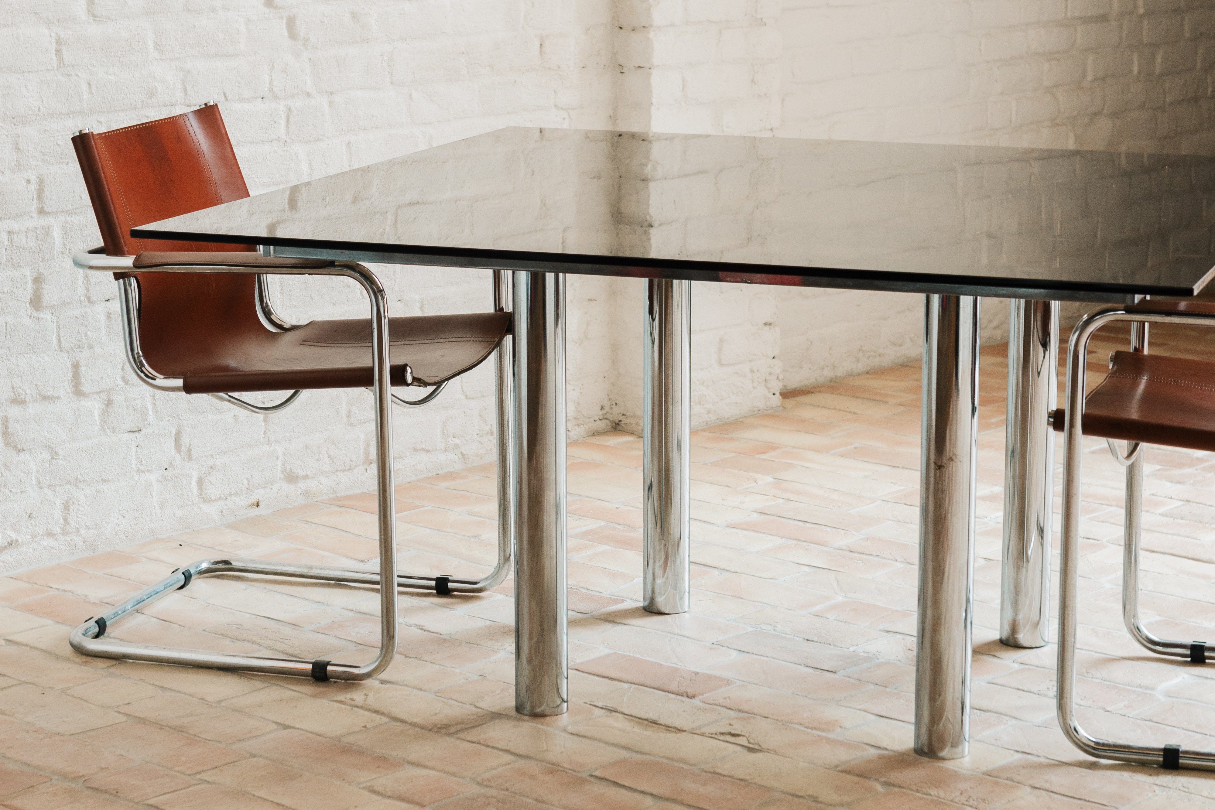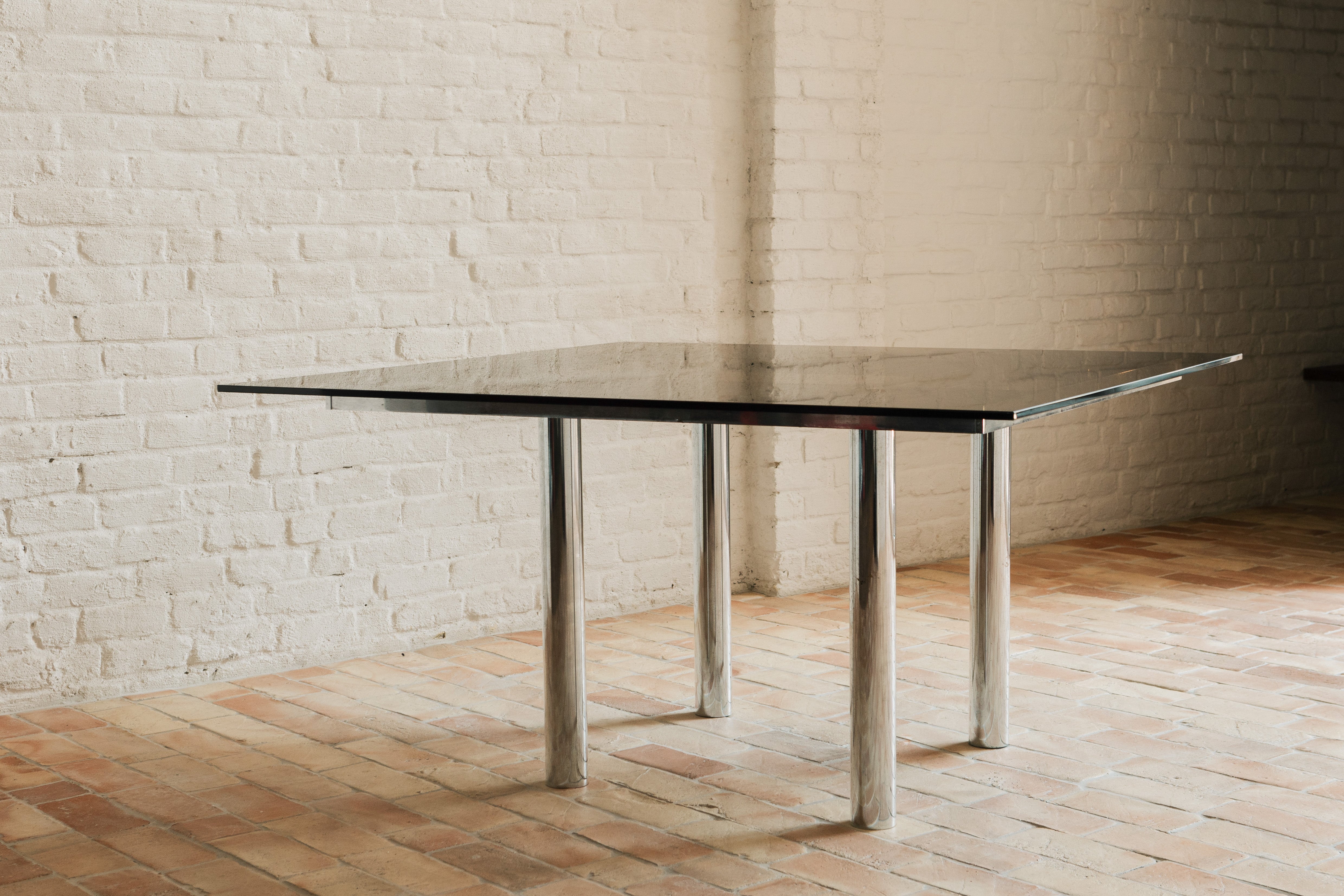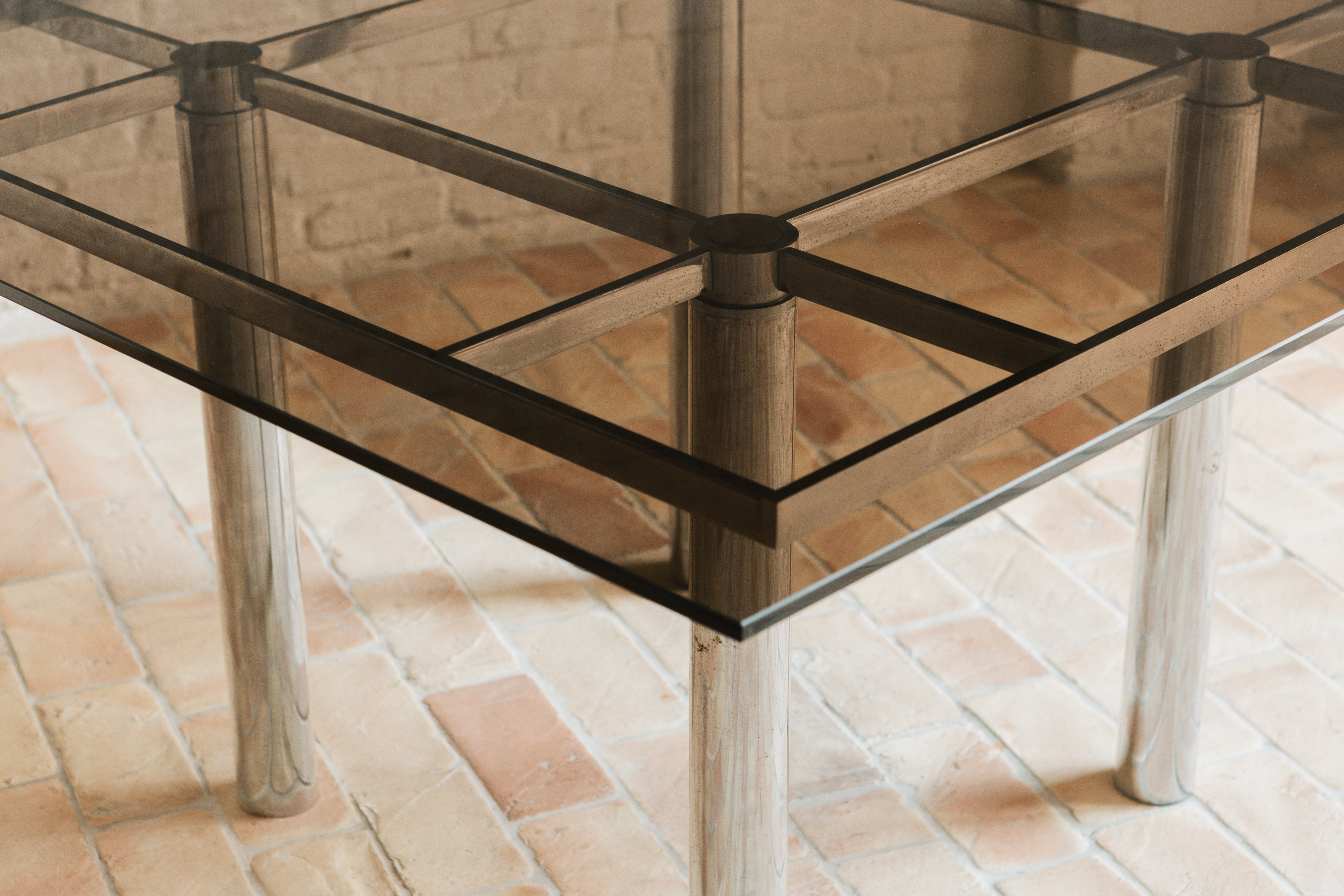 Cette table à manger André, conçue par Tobia et Afra Scarpa pour Gavina à la fin des années 1960, est un exemple raffiné du modernisme italien du milieu du XXe siècle. Faisant partie de la série Ultrarazionale, elle possède des pieds tubulaires en acier chromé reliés à une structure en acier inoxydable brossé, visible à travers le plateau d'origine en verre fumé épais.