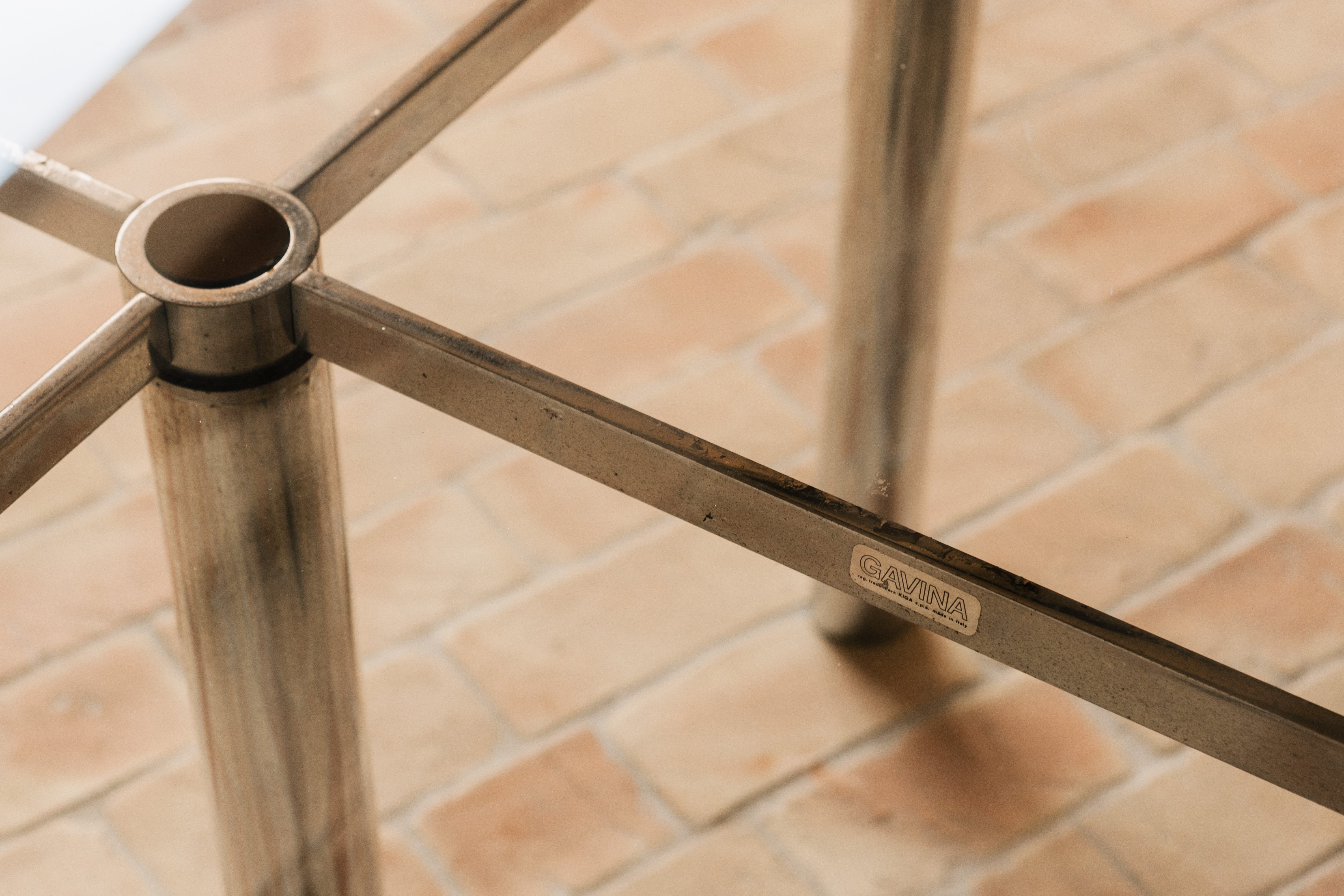 L'alliance du métal poli et du verre teinté foncé confère à la table une présence architecturale sophistiquée qui s'intègre harmonieusement aux intérieurs modernes comme classiques. Signée sur le plateau et portant encore son étiquette Gavina d'origine, C'est une pièce très recherchée.