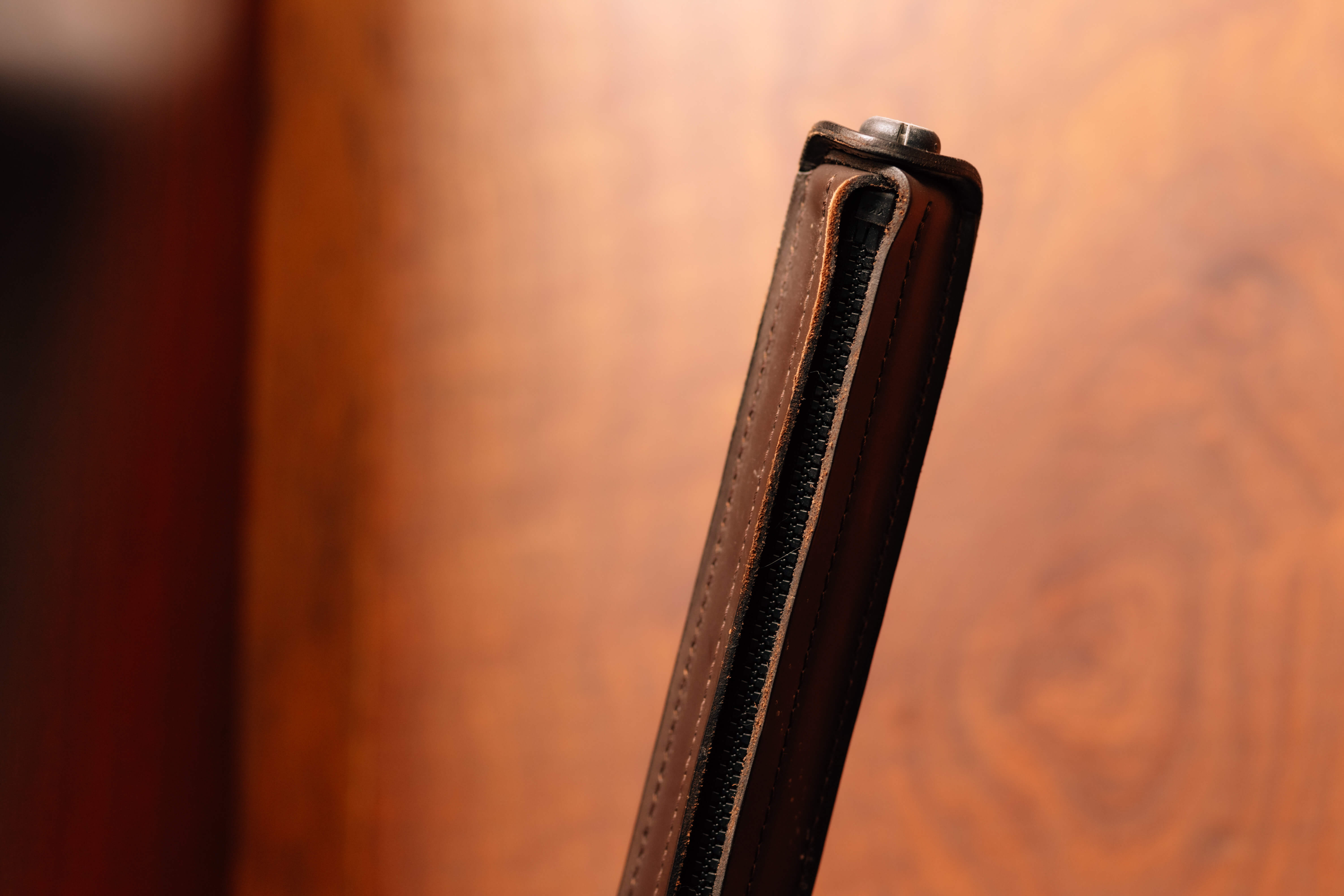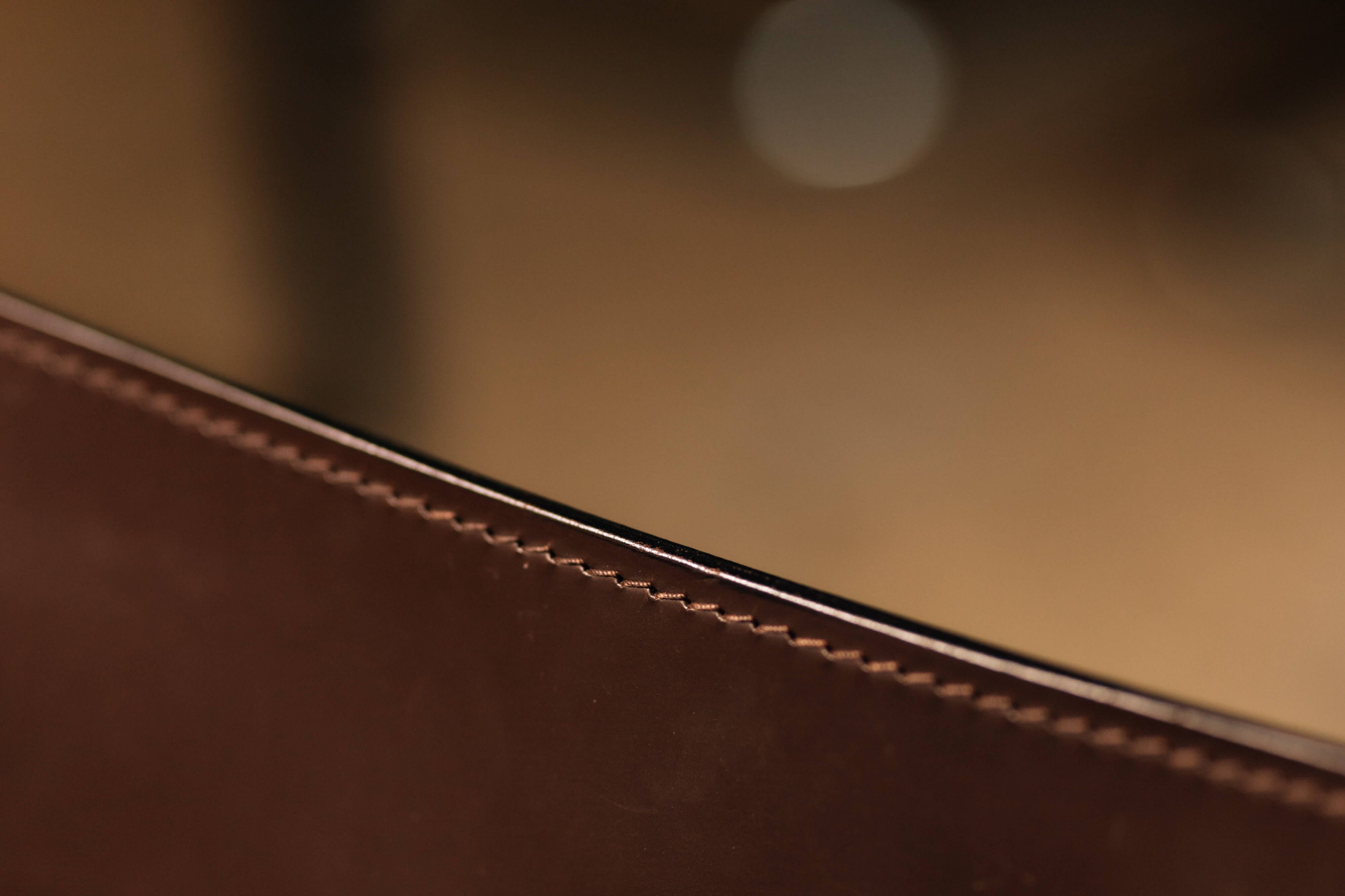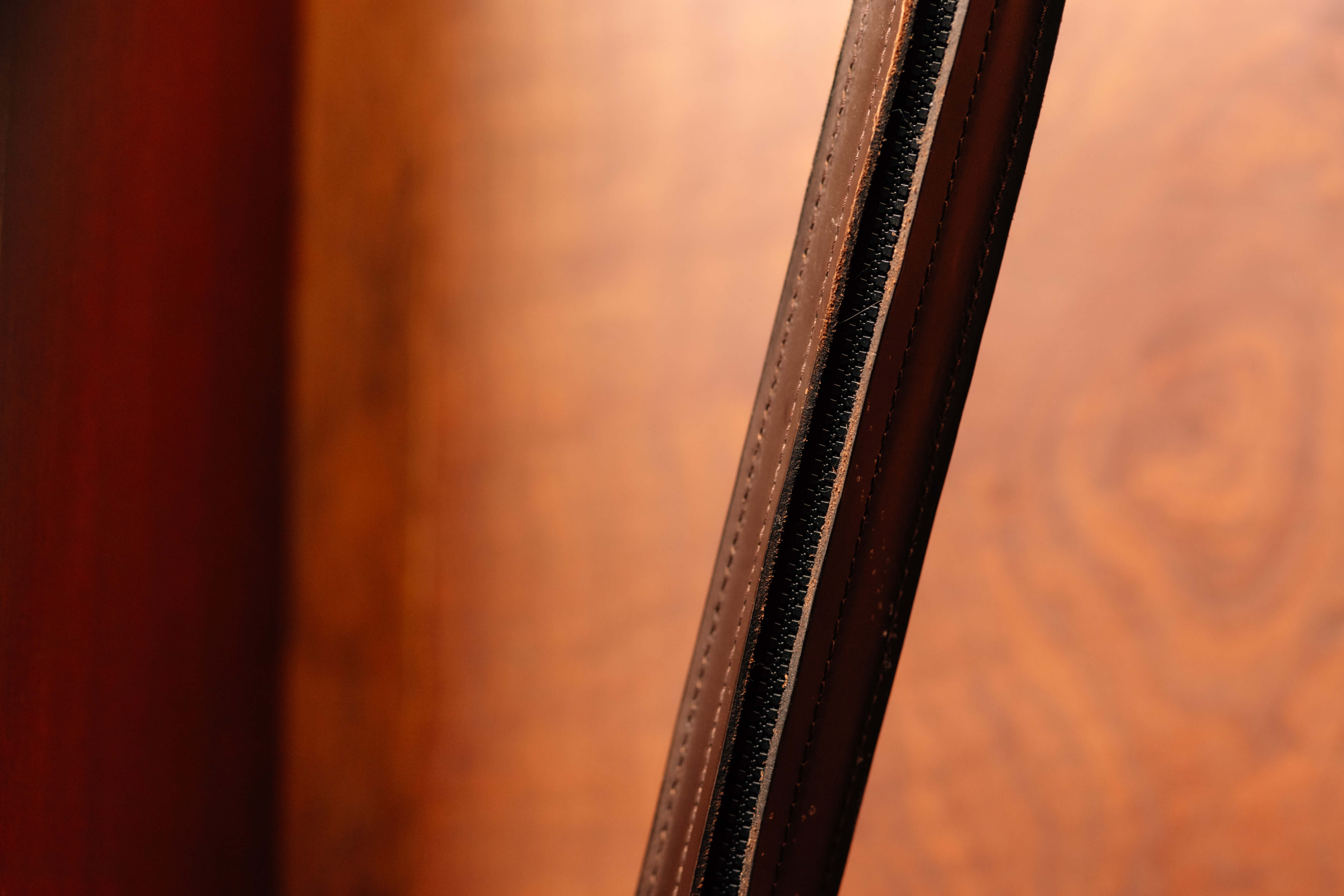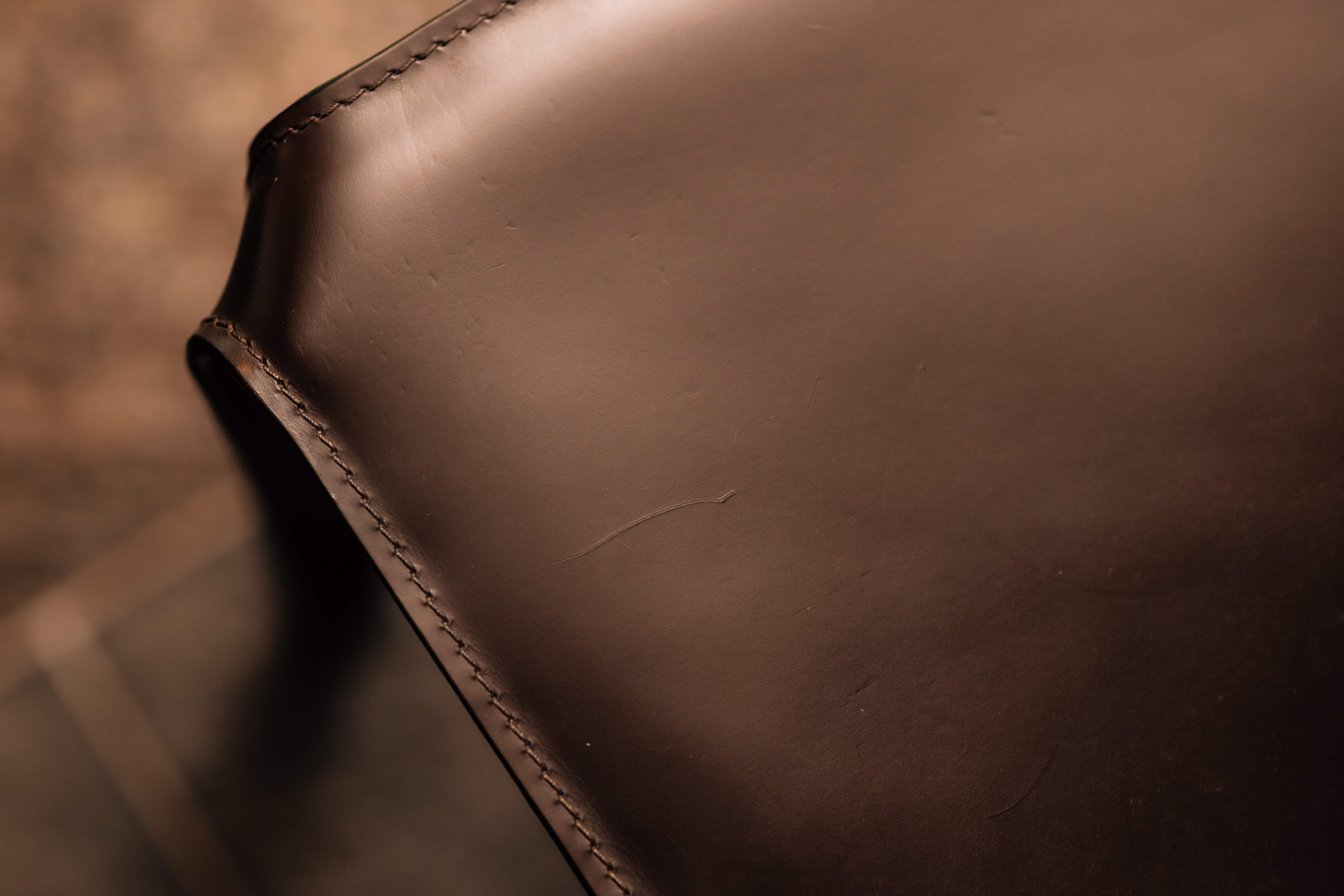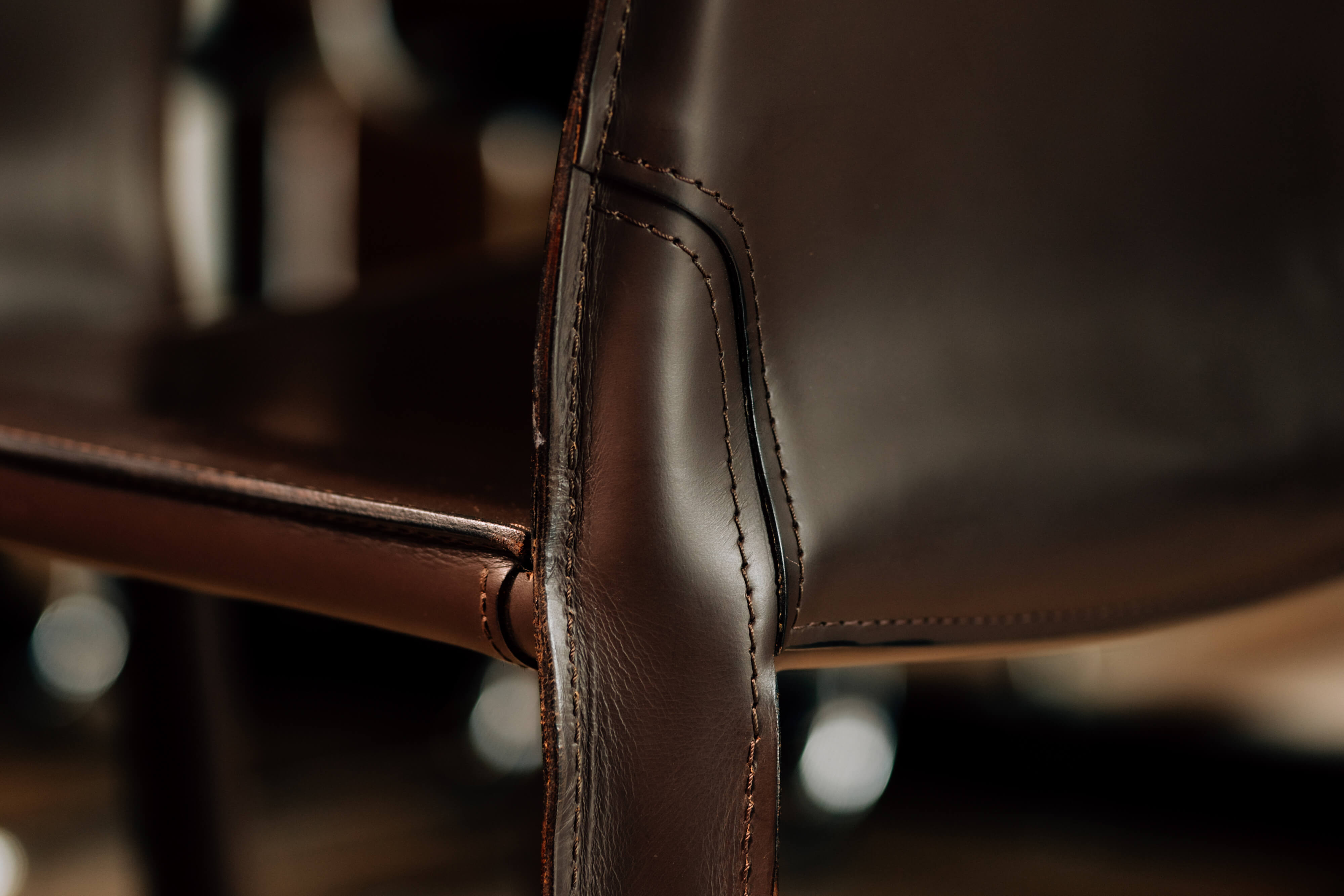 Chaque fauteuil est entièrement revêtu d'un cuir brun foncé de haute qualité, tendu sans couture sur une structure en acier et orné des surpiqûres apparentes caractéristiques. Leur design minimaliste et affirmé leur confère une présence raffinée, les rendant compatibles avec les intérieurs modernes et classiques.