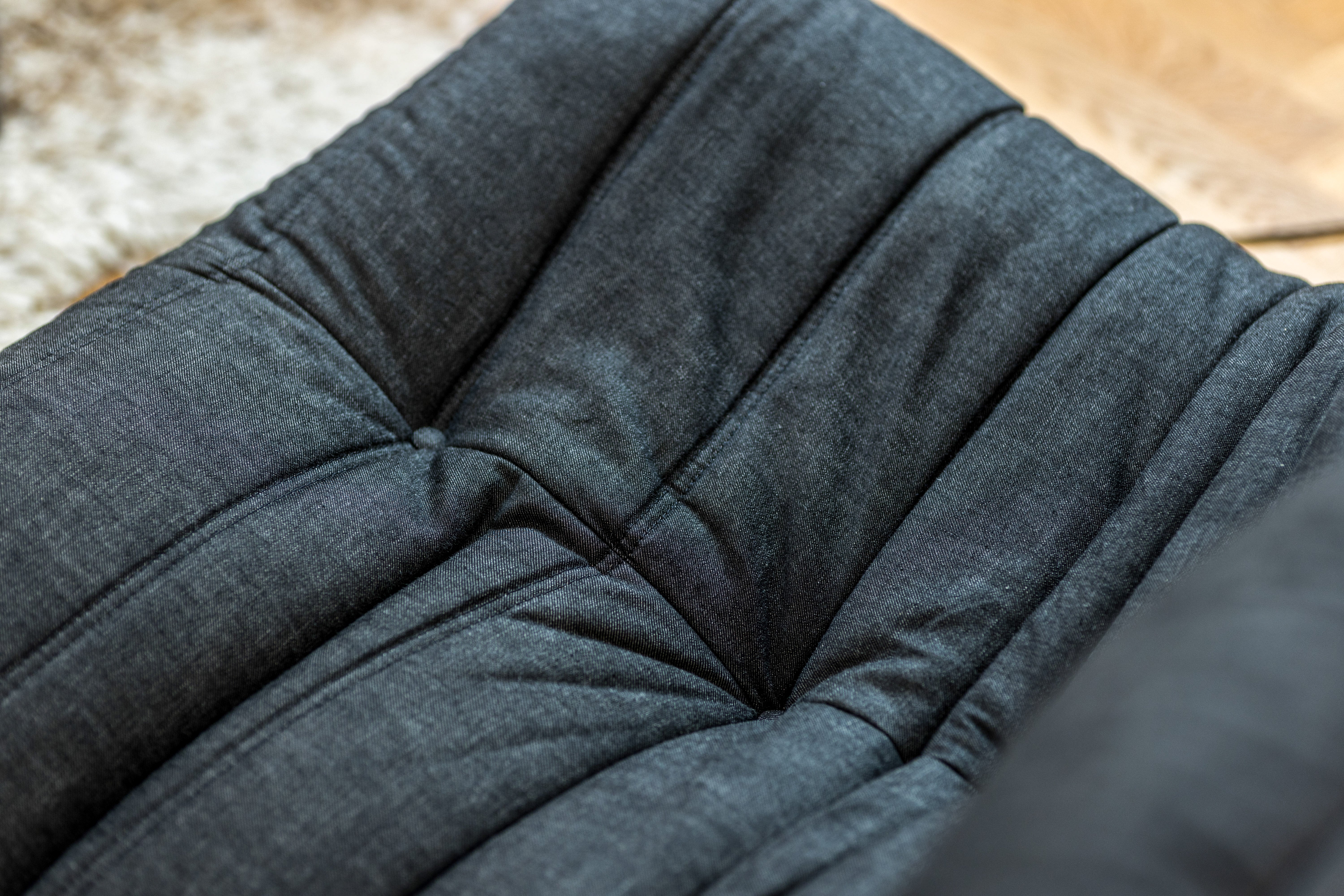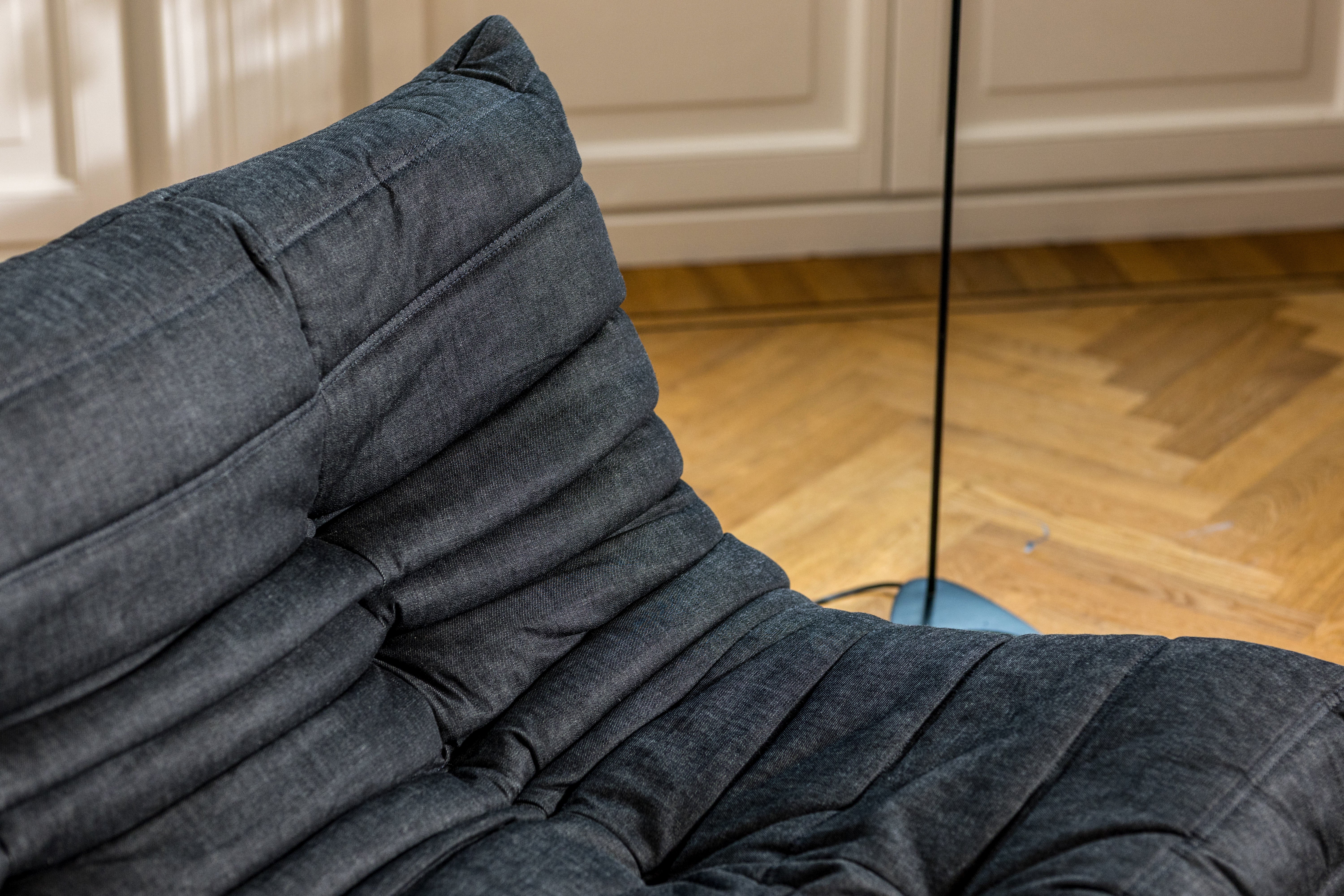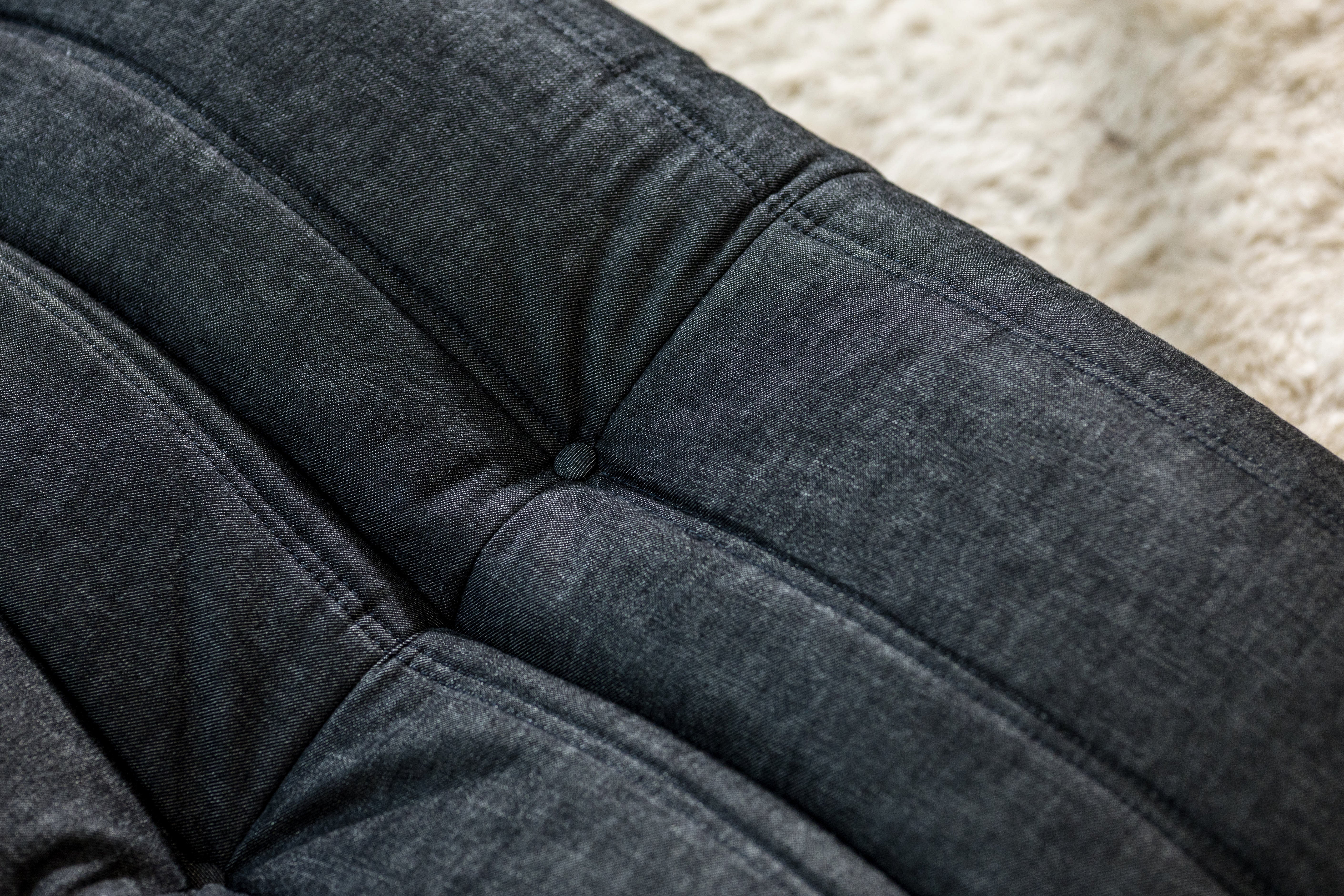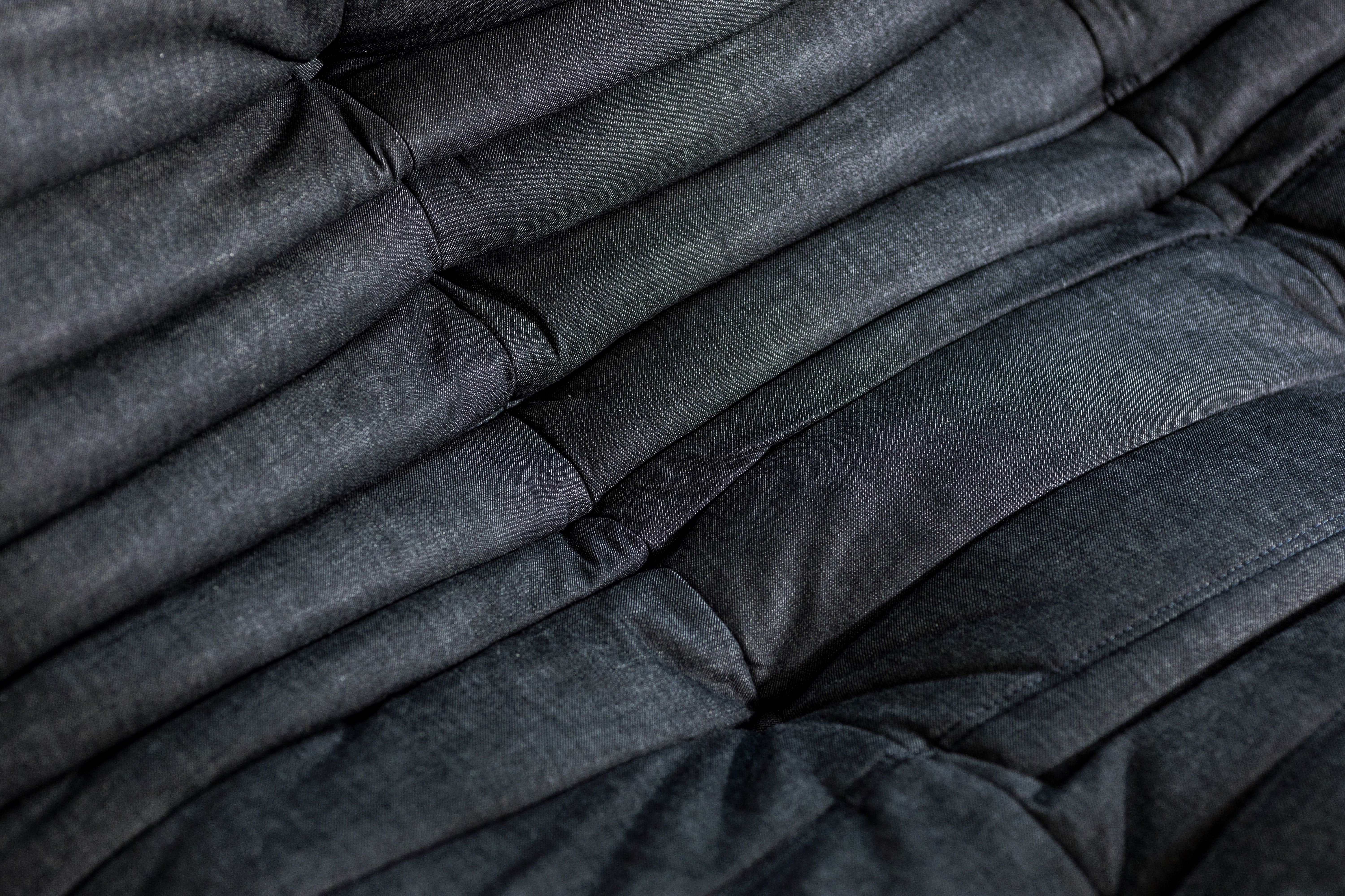 Ce canapé trois places est revêtu d'un tissu jean gris foncé, lui conférant un caractère contemporain et accueillant tout en mettant en valeur sa forme plissée distinctive. Le textile renforce son esprit décontracté et informel. Entièrement réalisé en mousse multi-densité sans armature interne, le canapé, avec sa silhouette ergonomique et son assise basse et profonde, offre une expérience de détente sculpturale et d'un confort exceptionnel.