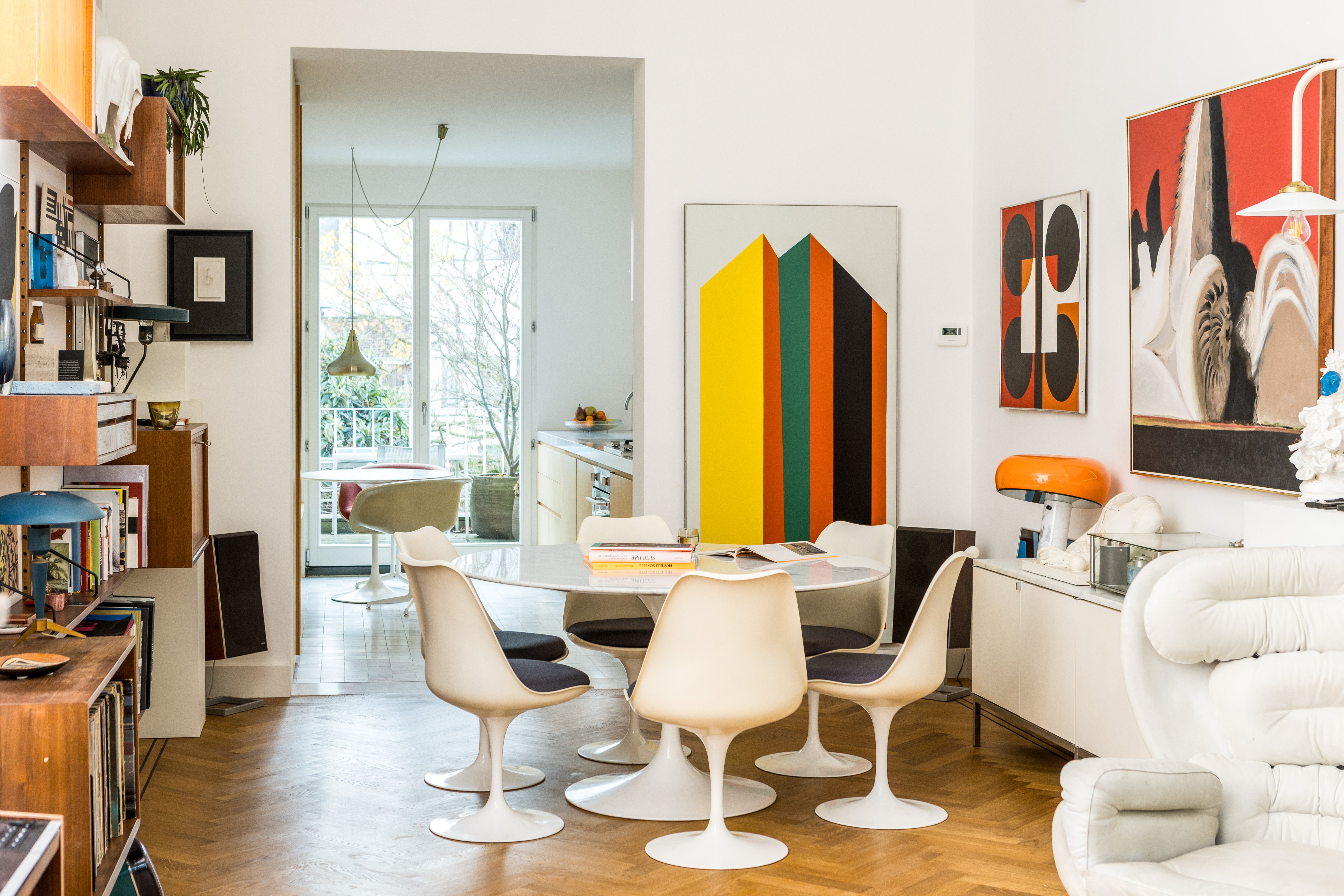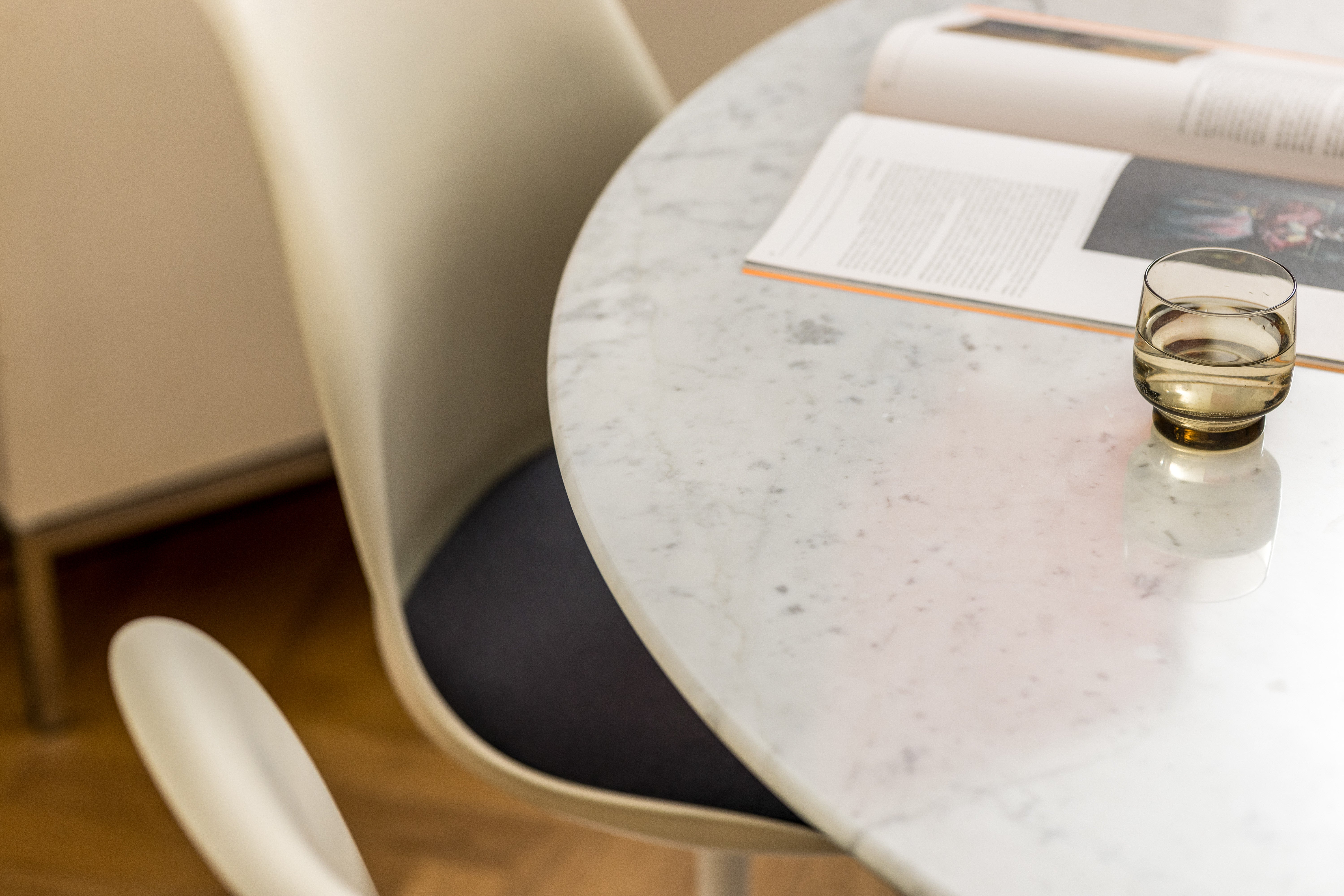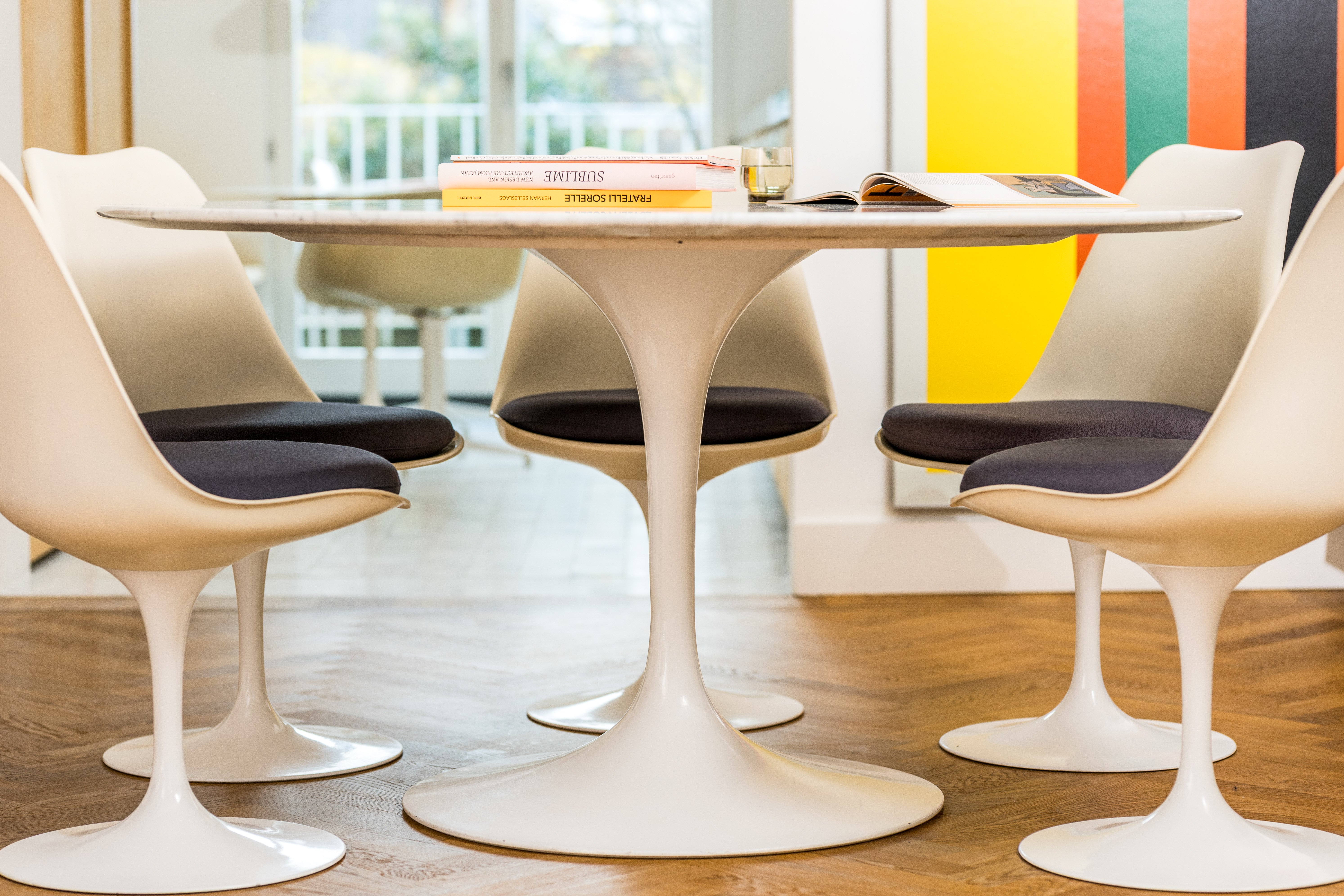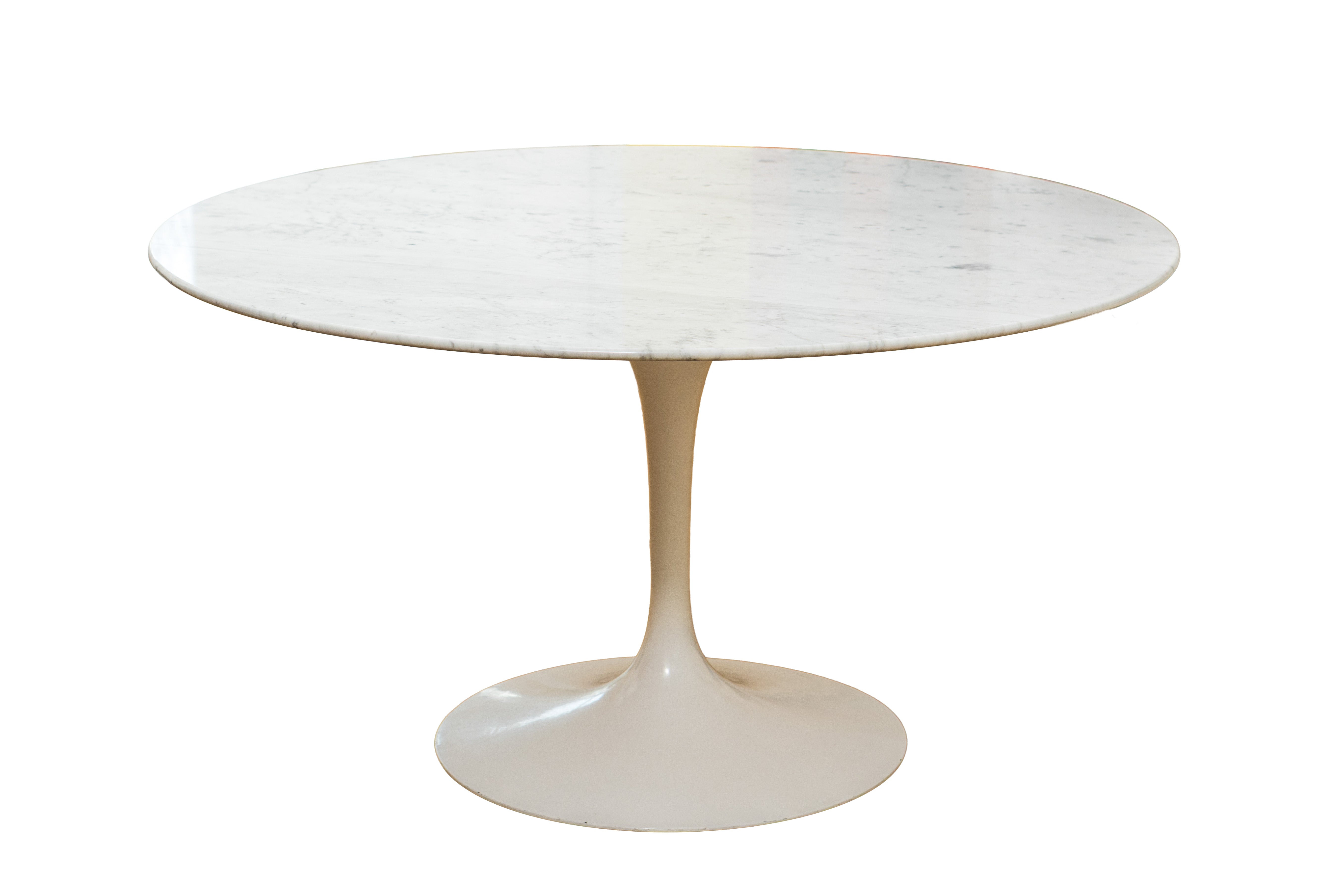 Eero Saarinen, le célèbre architecte et designer finno-américain, s'était donné pour mission d'éliminer ce qu'il appelait le « bidonville de jambes » créé par le mobilier traditionnel. Sa série Tulip constituait une réponse radicale : une forme sculpturale et fluide, distillée en un unique et élégant piédestal.