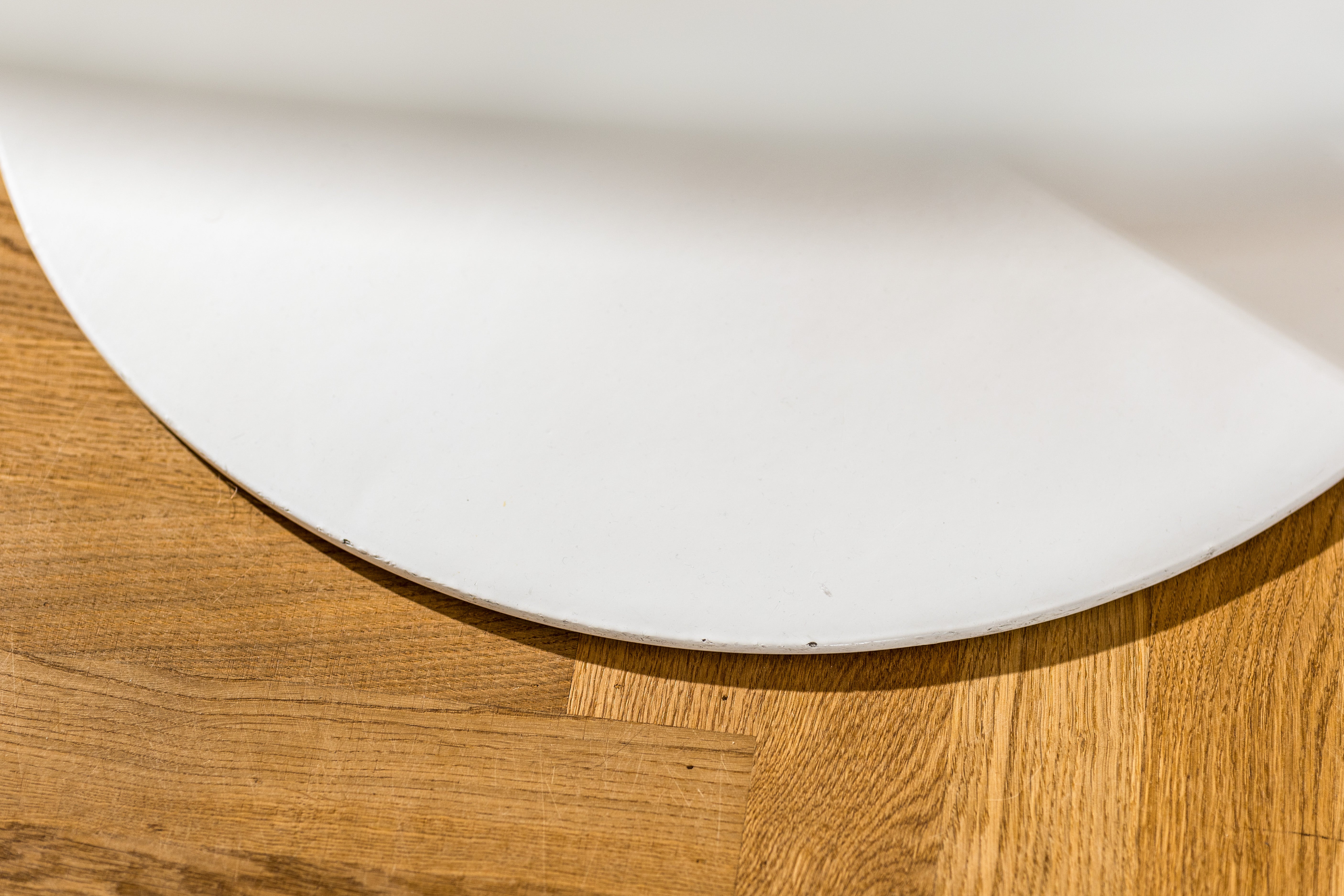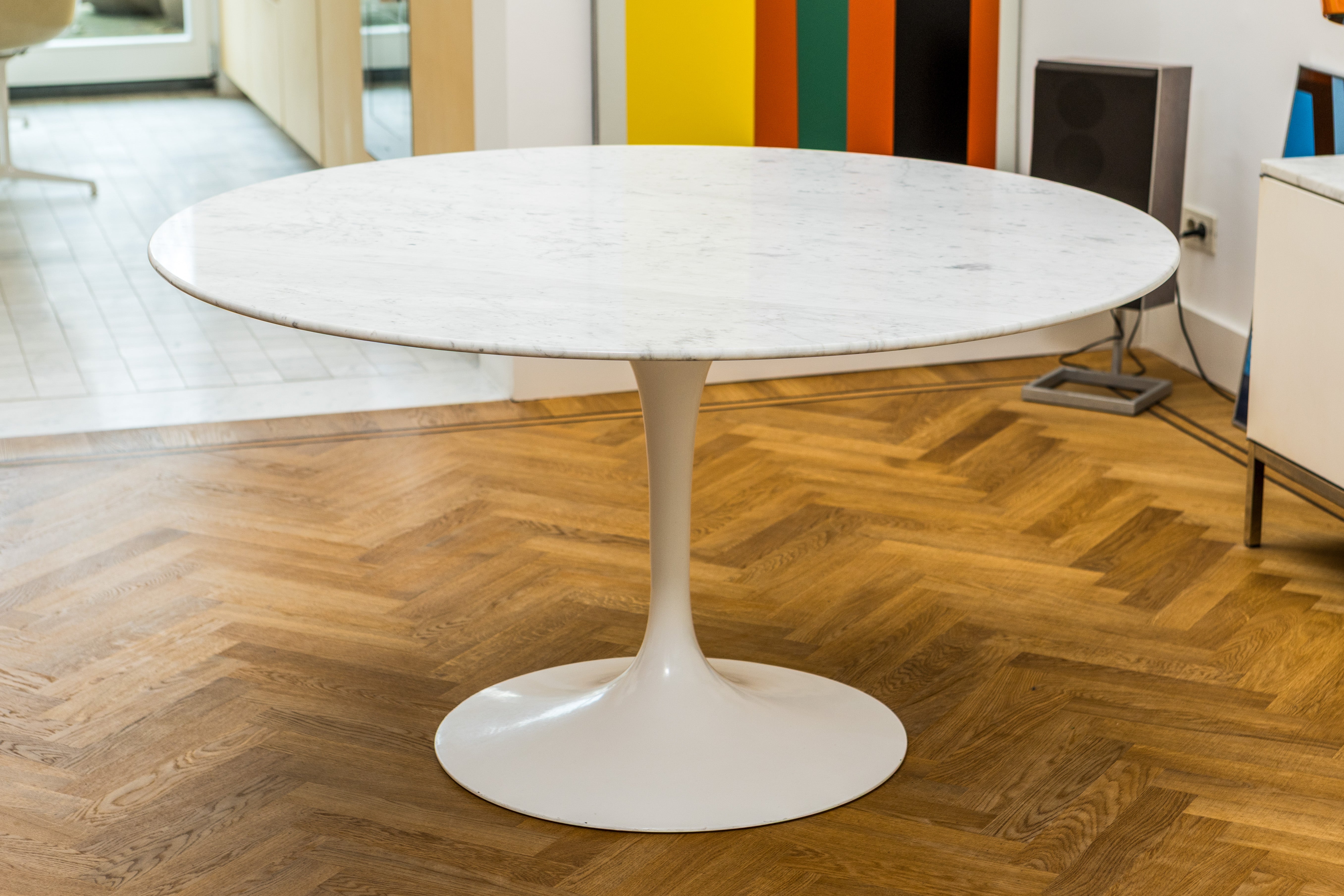 Fabriquée en 1960 et portant la mention « 164 », la table présente un superbe plateau rond en marbre blanc, mettant en valeur ses veines naturelles intemporelles, reposant sur le piétement signature de Saarinen en métal recouvert de blanc.