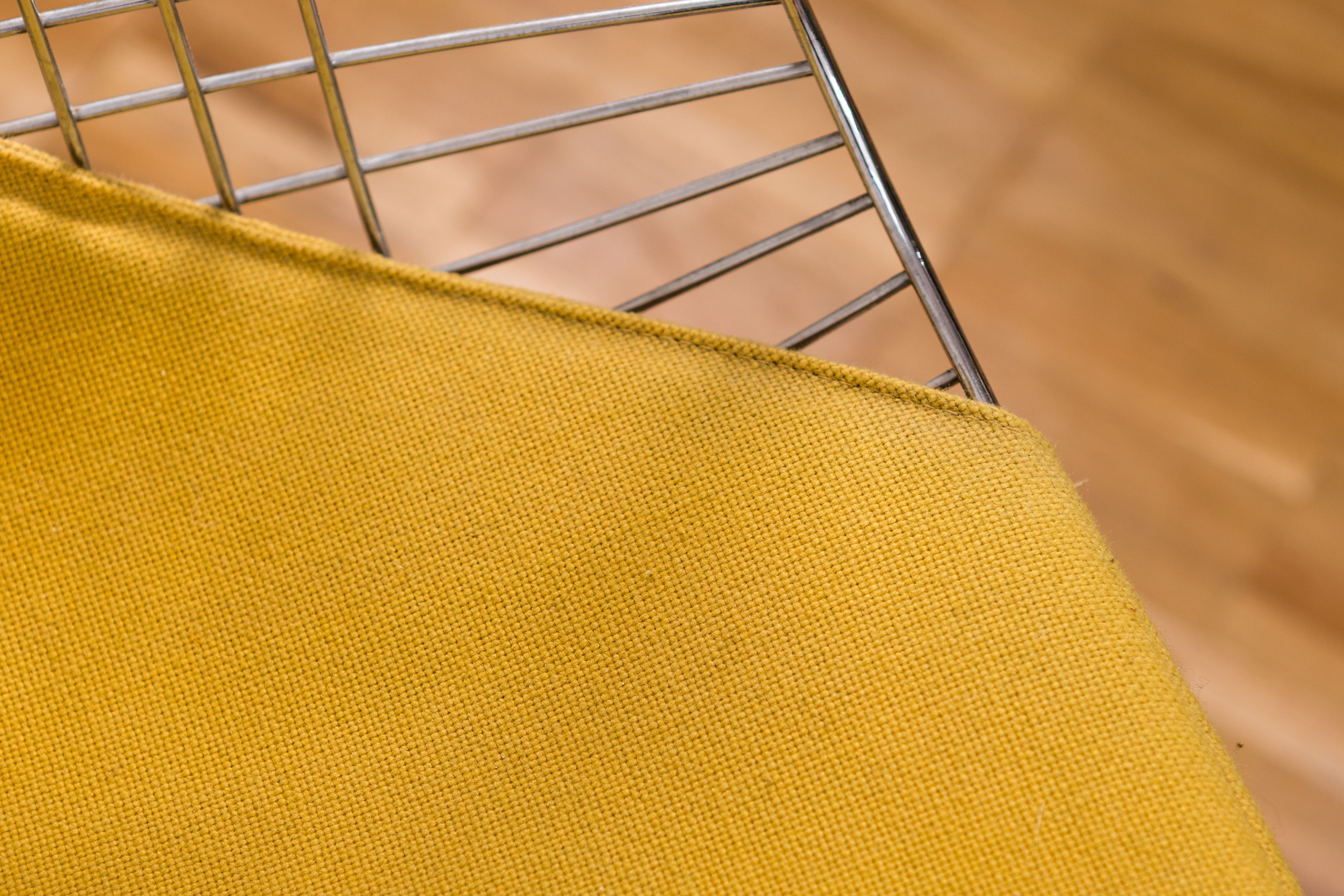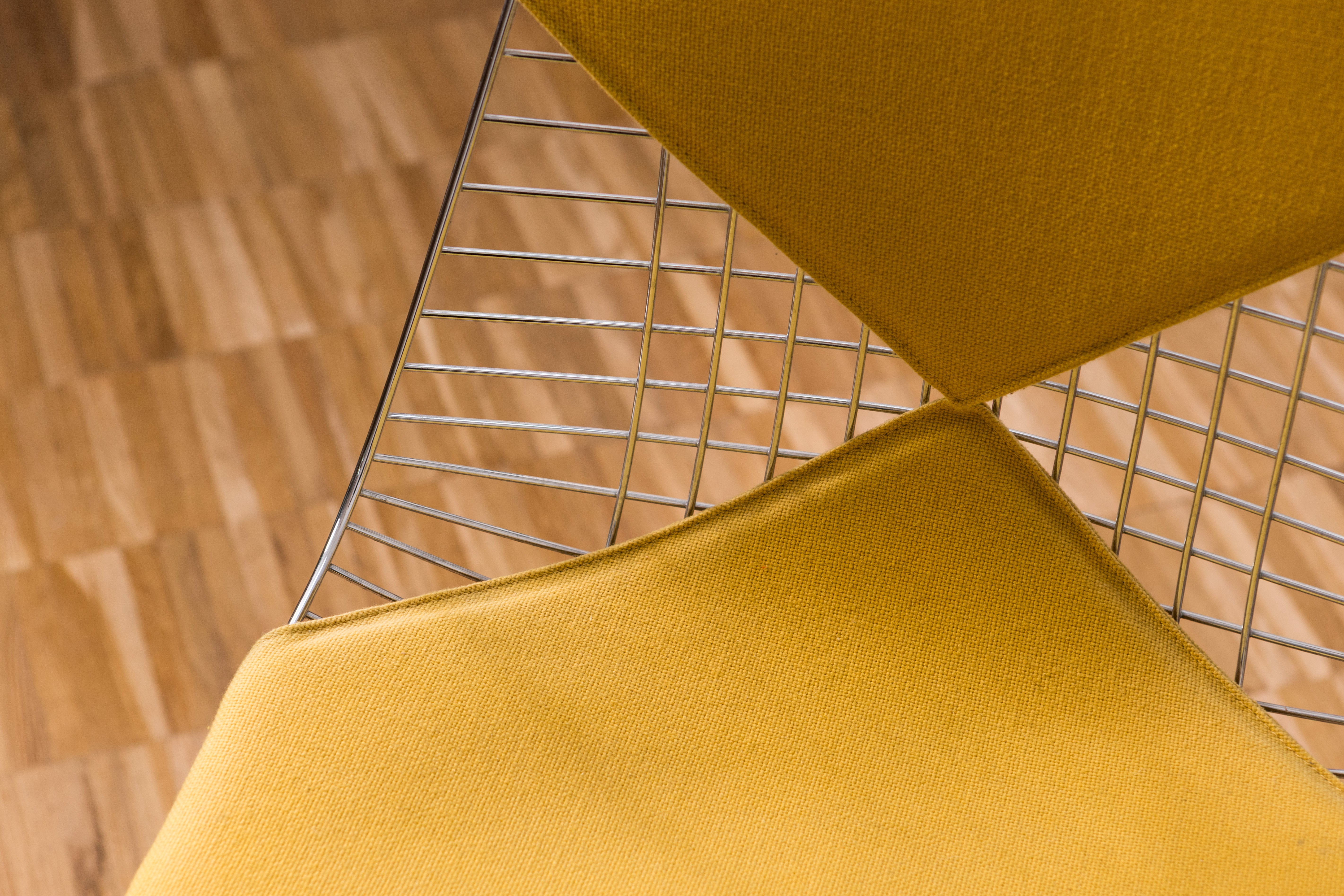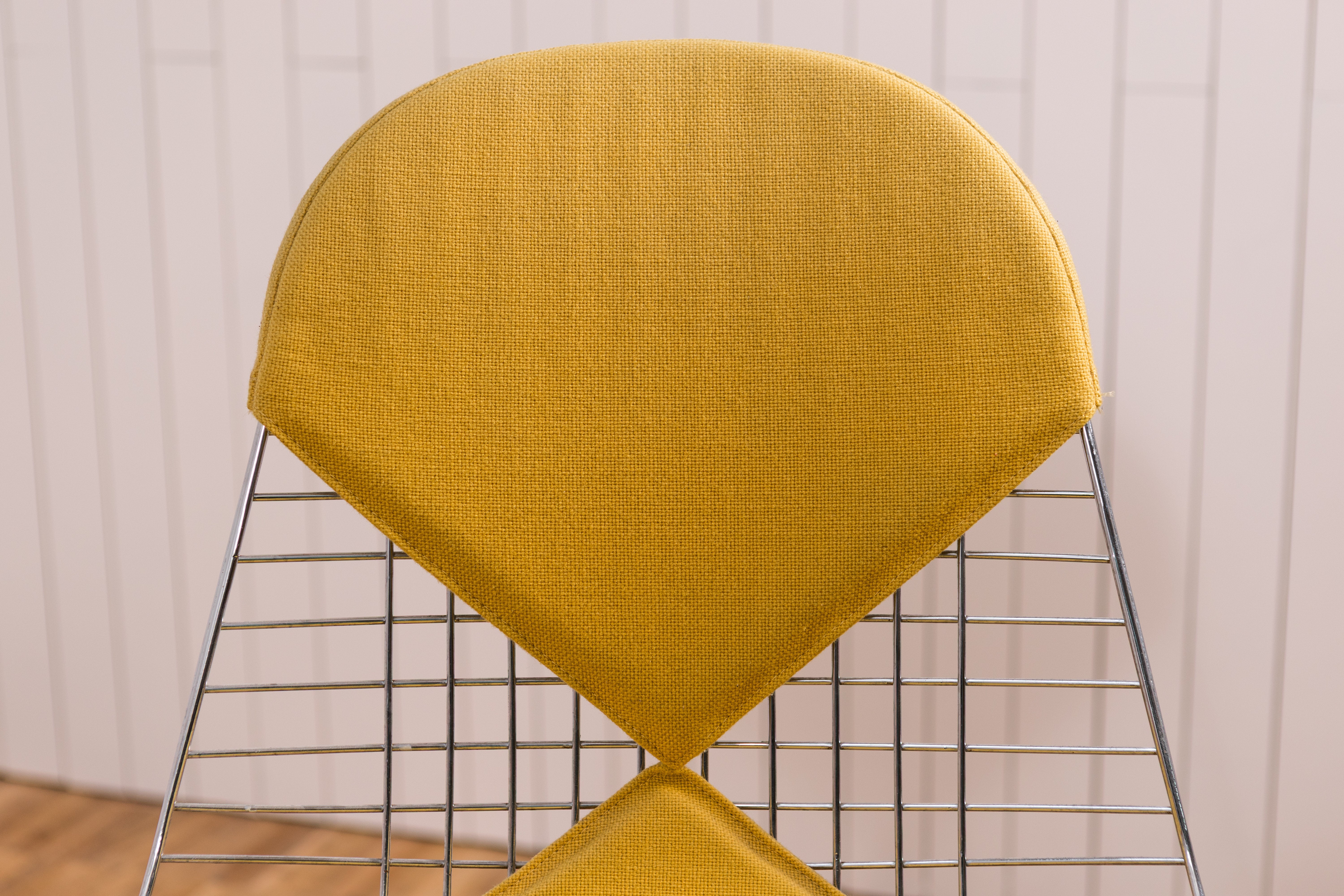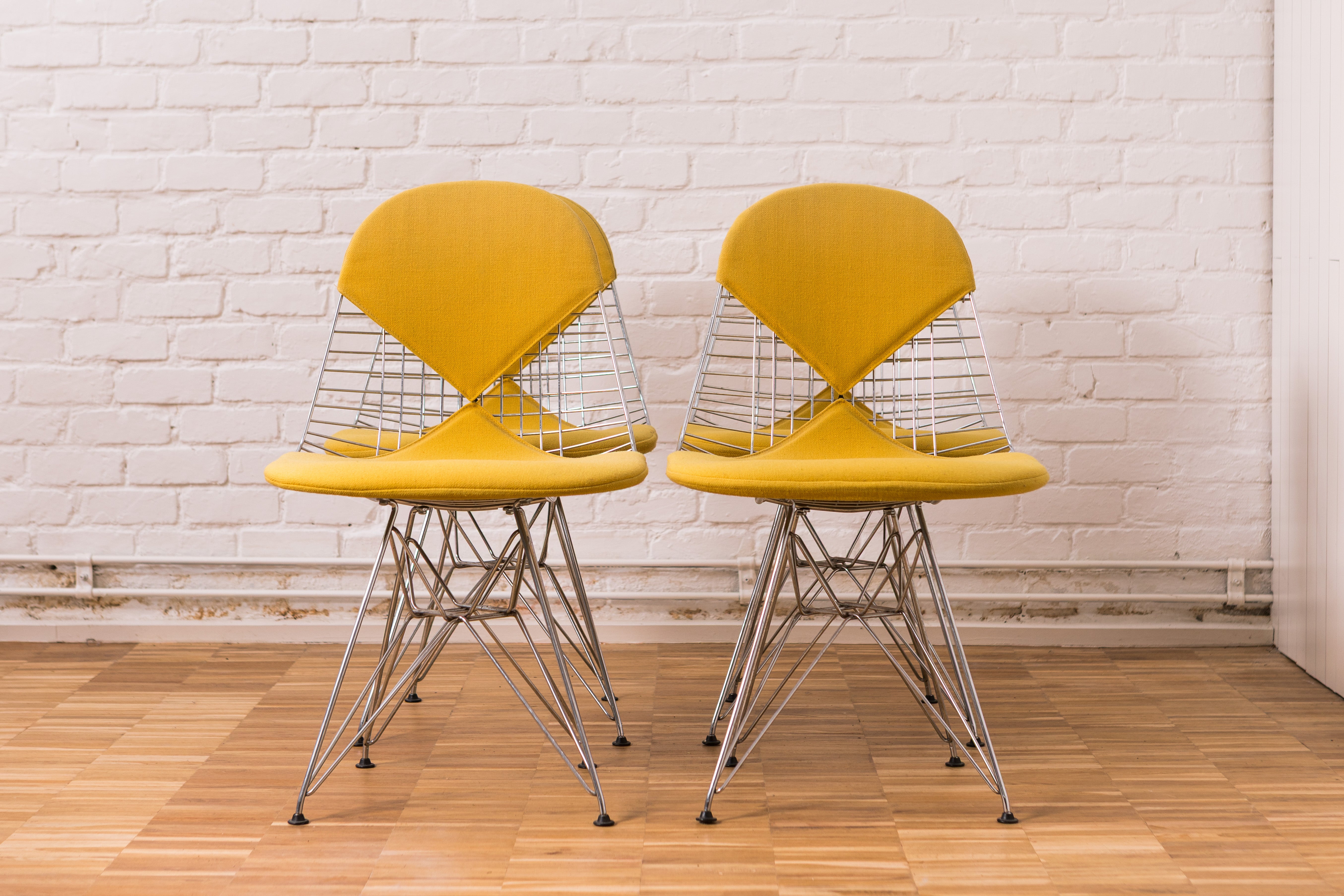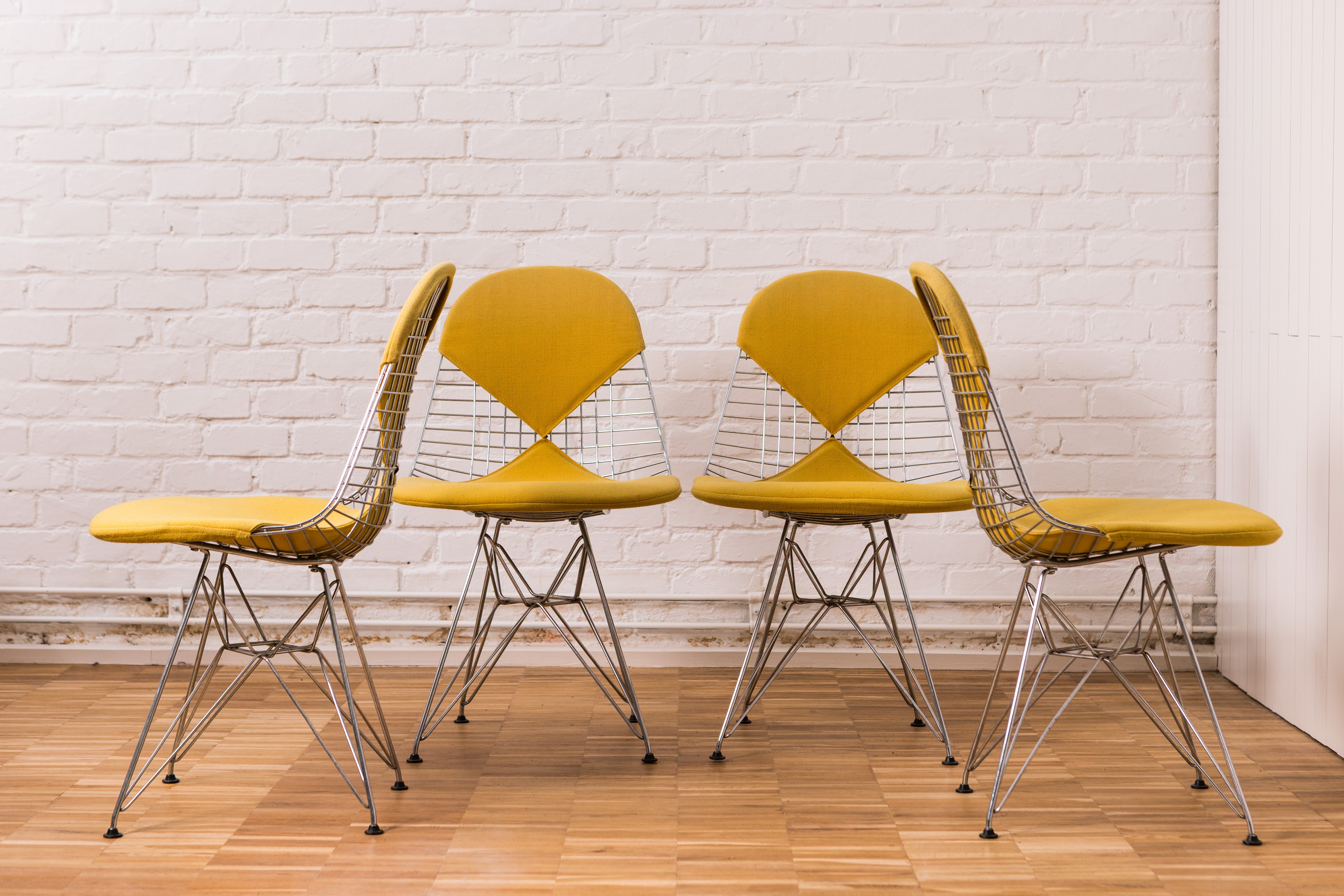 Cet ensemble de quatre chaises présente des piètements en fil d'acier chromé associés à des coussins d'assise jaunes « bikini » originaux, offrant à la fois légèreté visuelle et confort optimal. Charles et Ray Eames, pionniers du design de mobilier moderne, étaient connus pour leur conviction qu'un bon design devait être accessible, fonctionnel et esthétique — une philosophie parfaitement incarnée dans ce modèle.