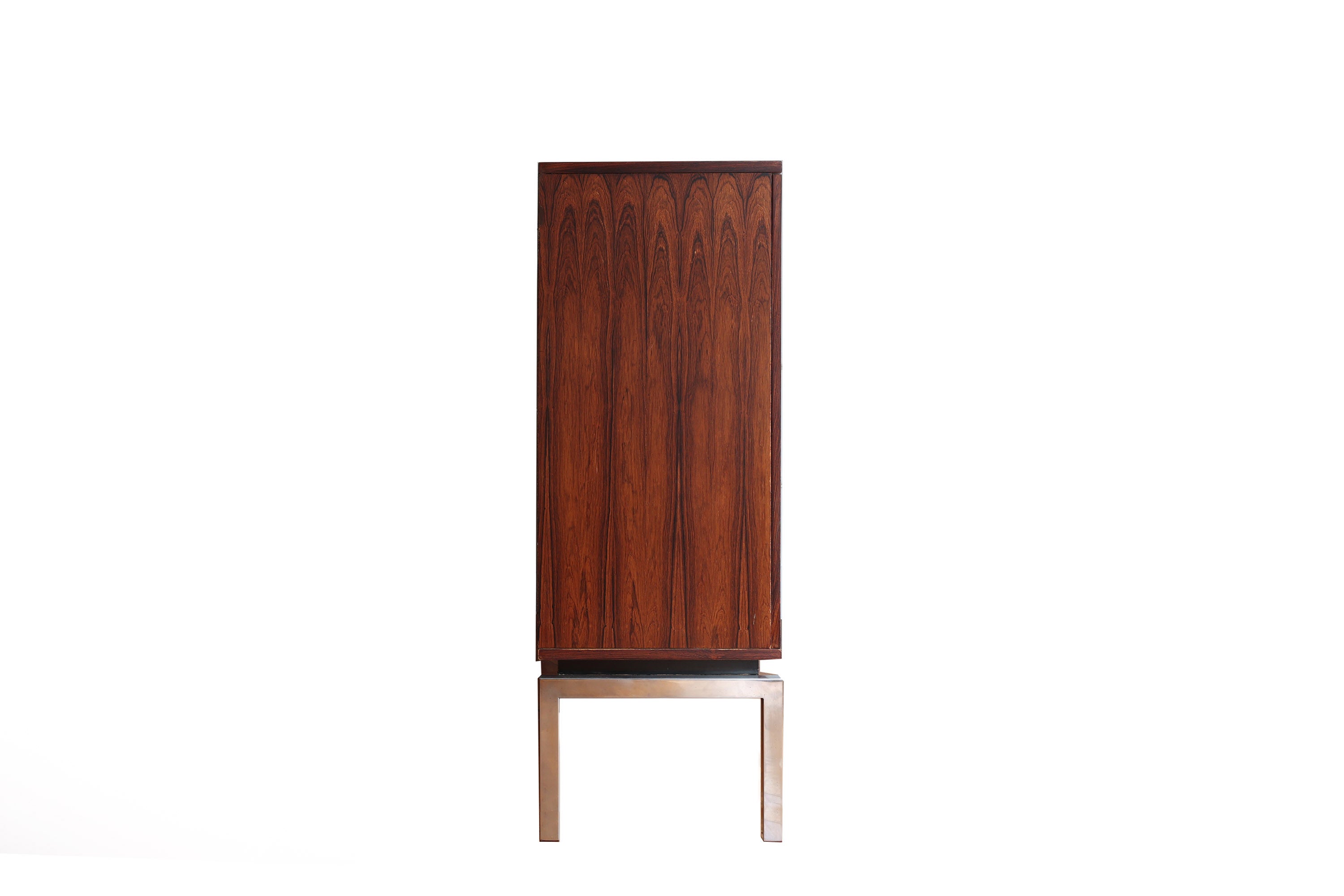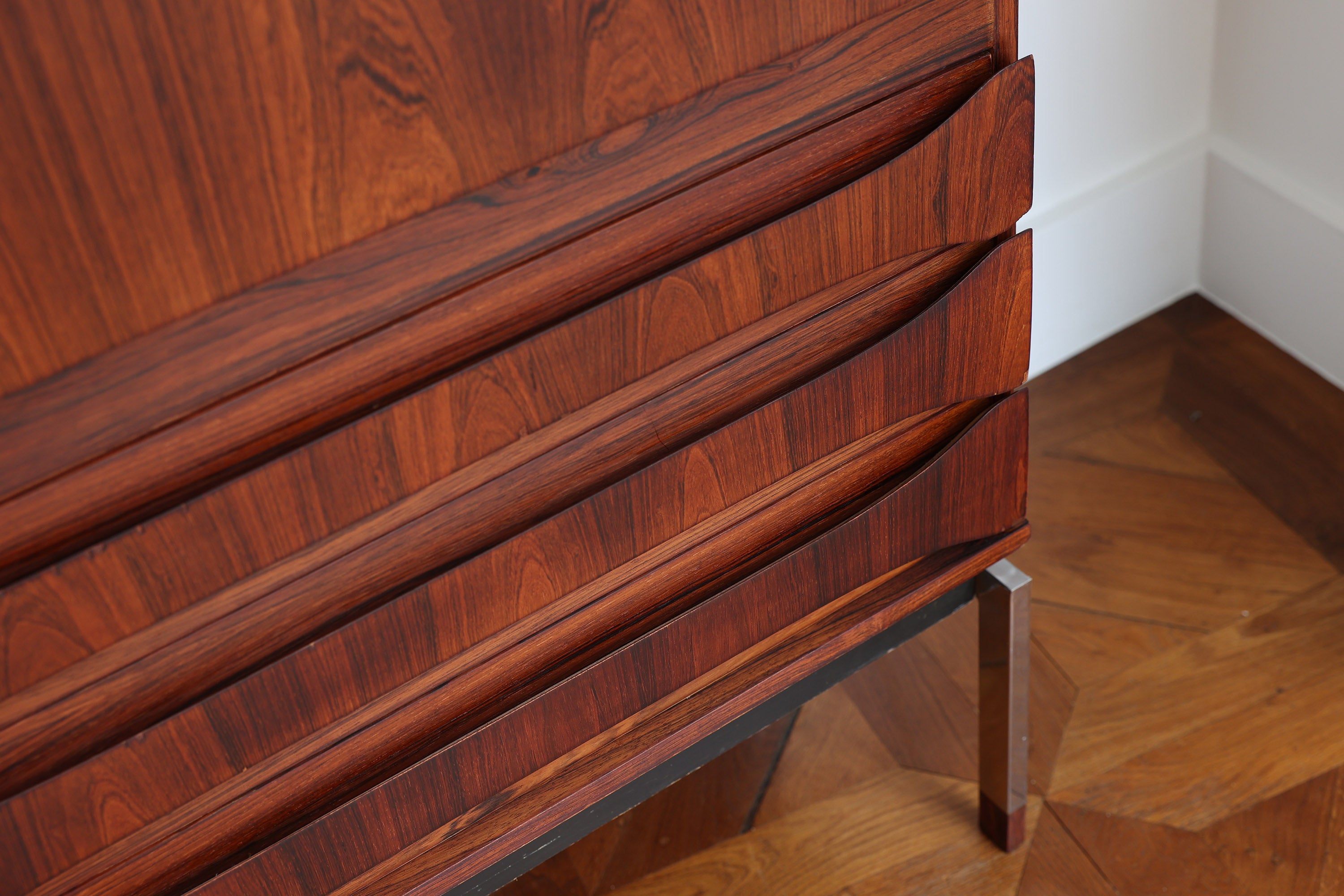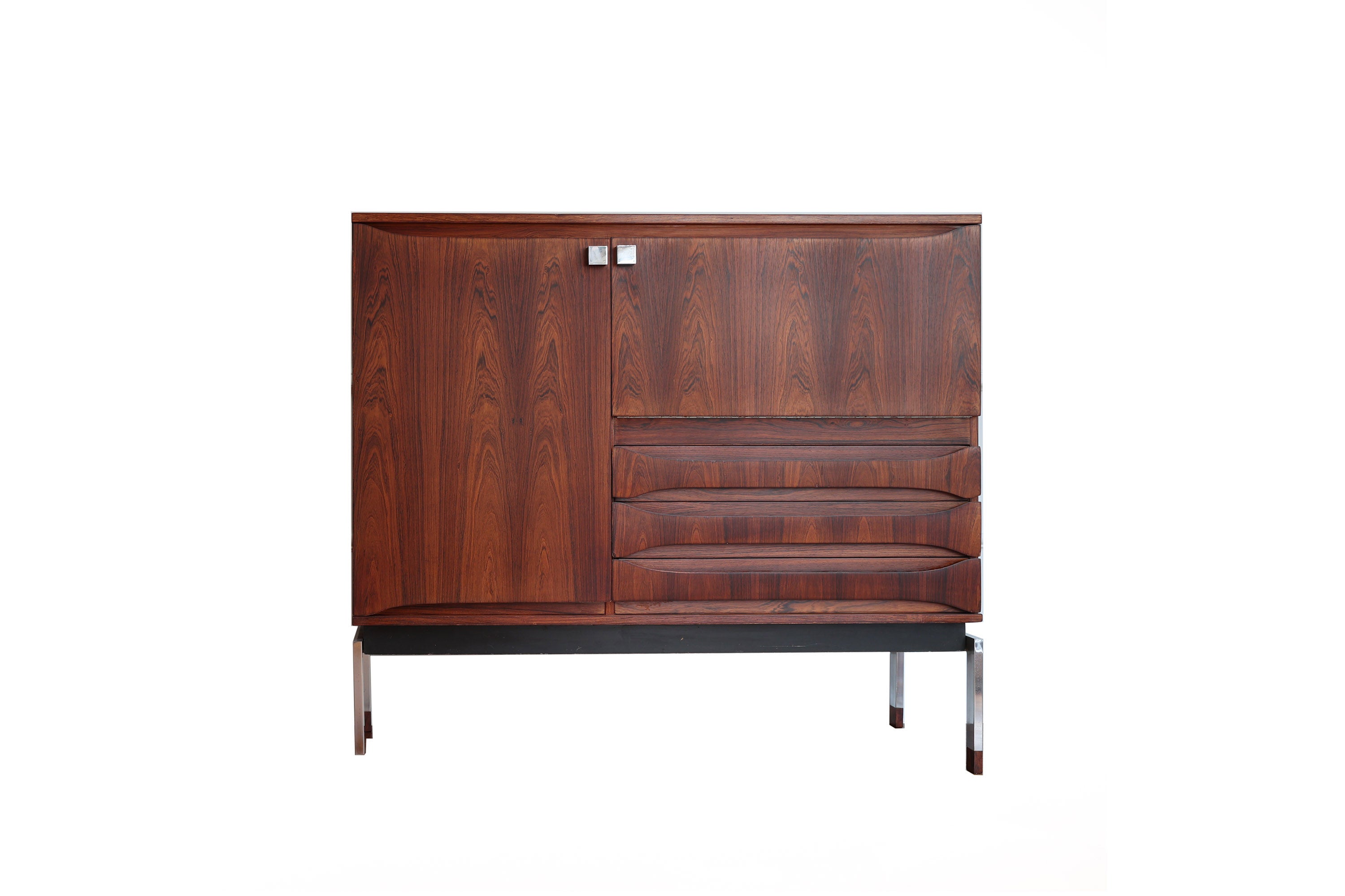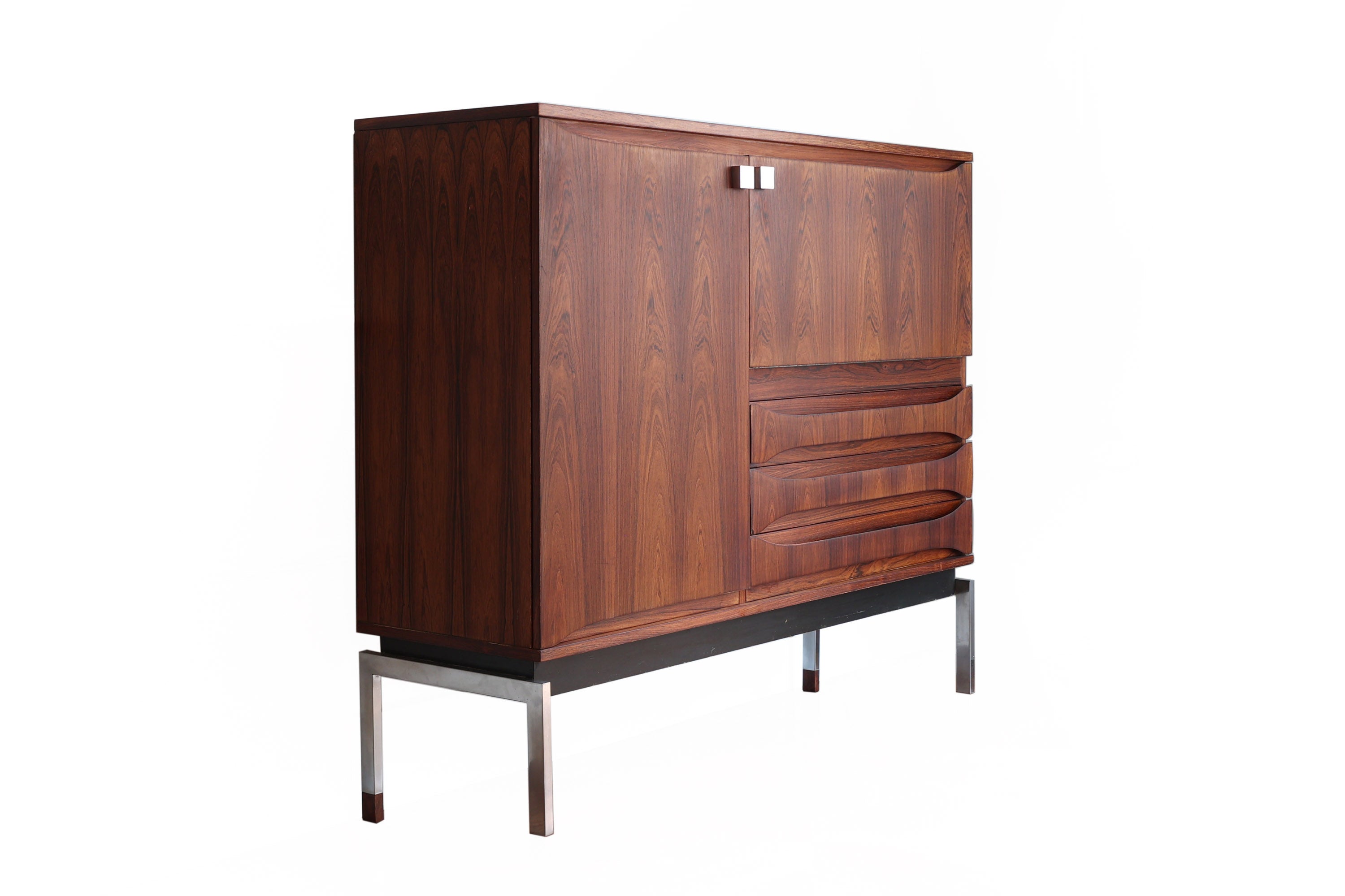 Dit elegante dressoir werd in het midden van de 20e eeuw ontworpen door Oswald Vermaercke voor V-Form. Het meubel, uitgevoerd in prachtig palissanderfineer, rust op slanke chromen poten die subtiel worden geaccentueerd door elegante houten voetjes. De verfijnd gesculpteerde handgrepen en fronten van de lades trekken meteen de aandacht en getuigen van het uitstekende vakmanschap achter het ontwerp.