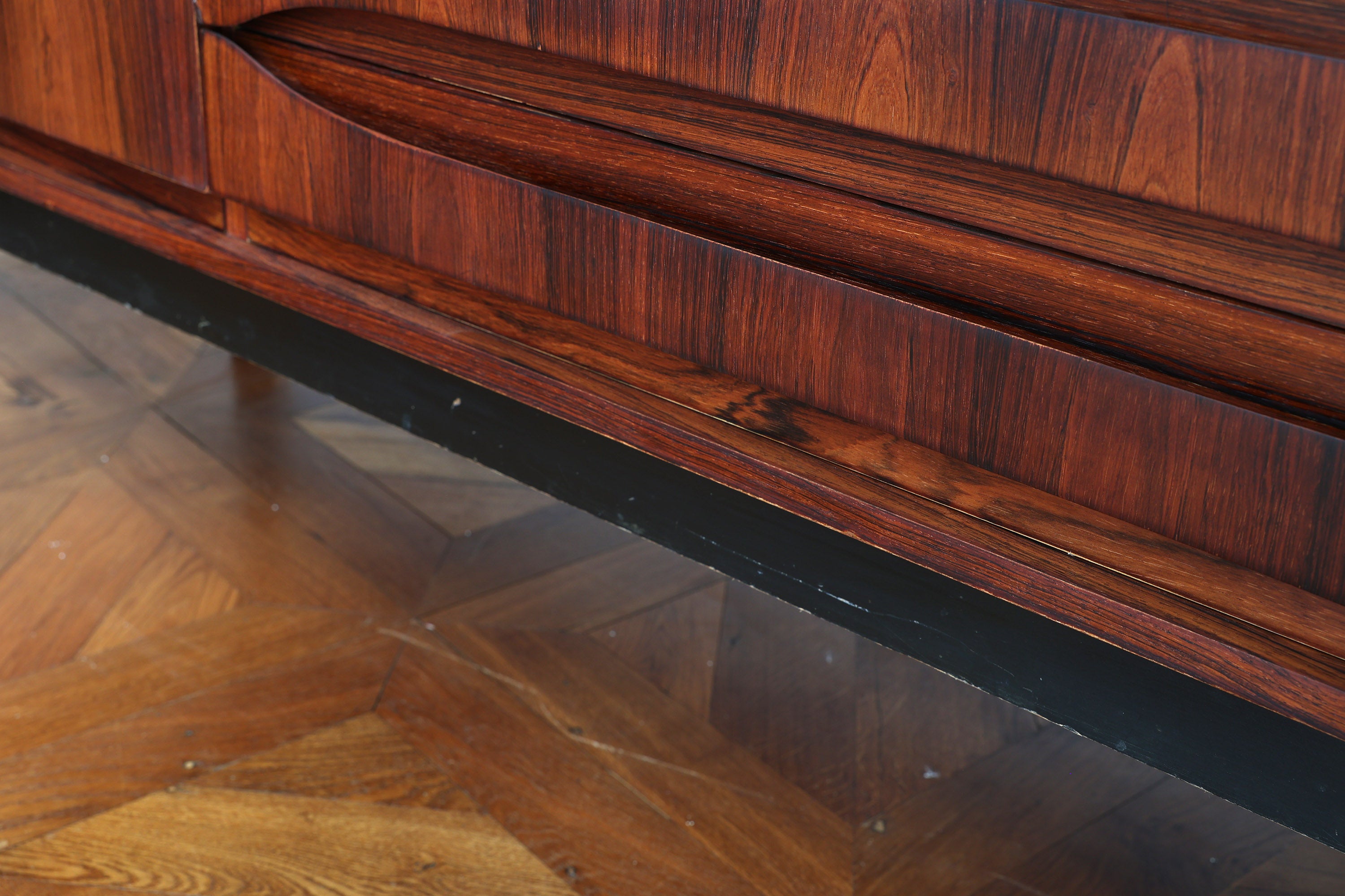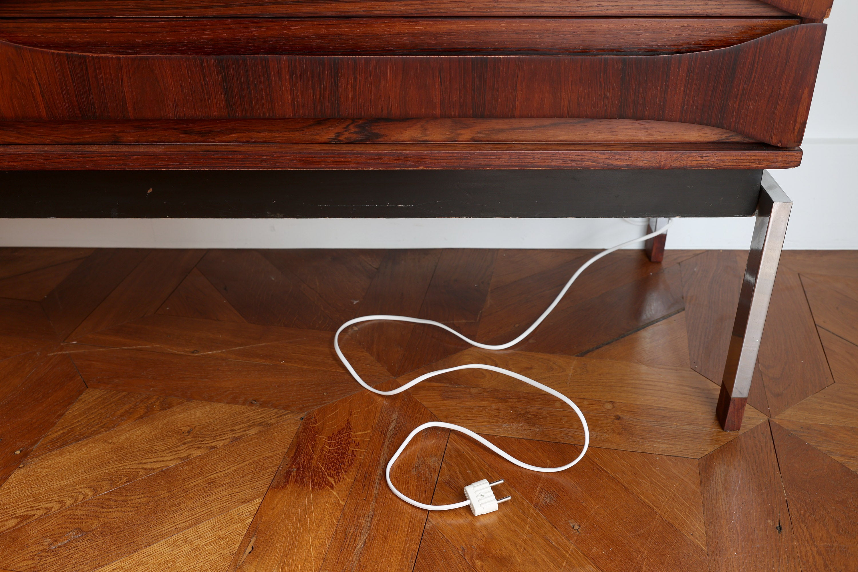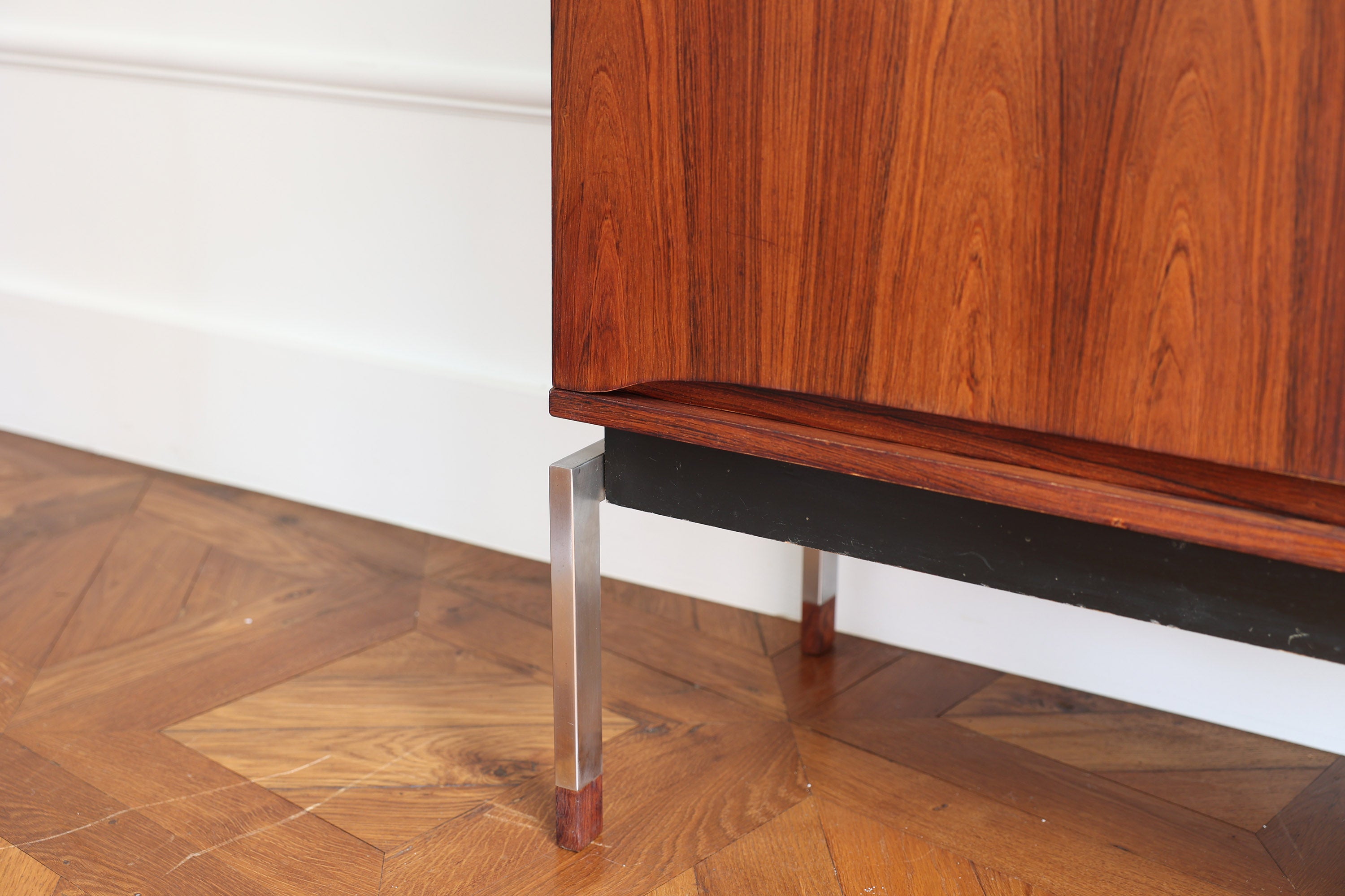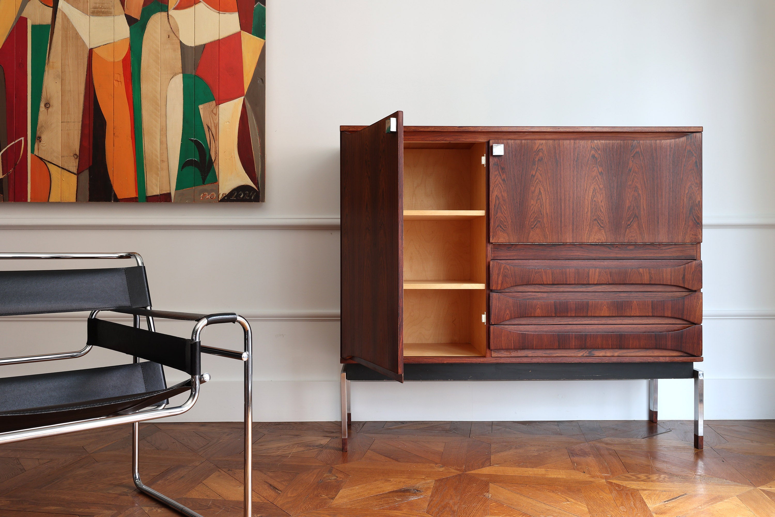 Dit elegante dressoir werd in het midden van de 20e eeuw ontworpen door Oswald Vermaercke voor V-Form. Het meubel, uitgevoerd in prachtig palissanderfineer, rust op slanke chromen poten die subtiel worden geaccentueerd door elegante houten voetjes. De verfijnd gesculpteerde handgrepen en fronten van de lades trekken meteen de aandacht en getuigen van het uitstekende vakmanschap achter het ontwerp.