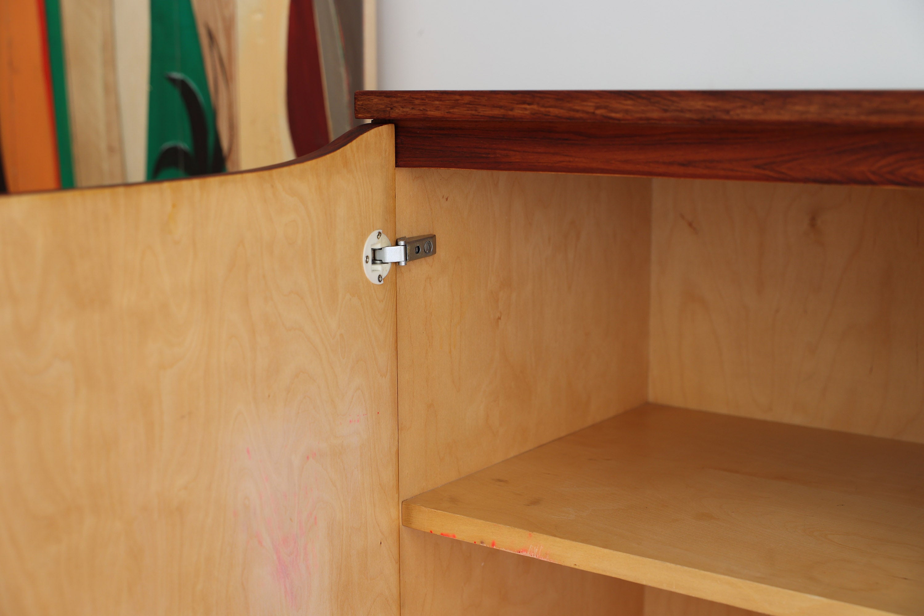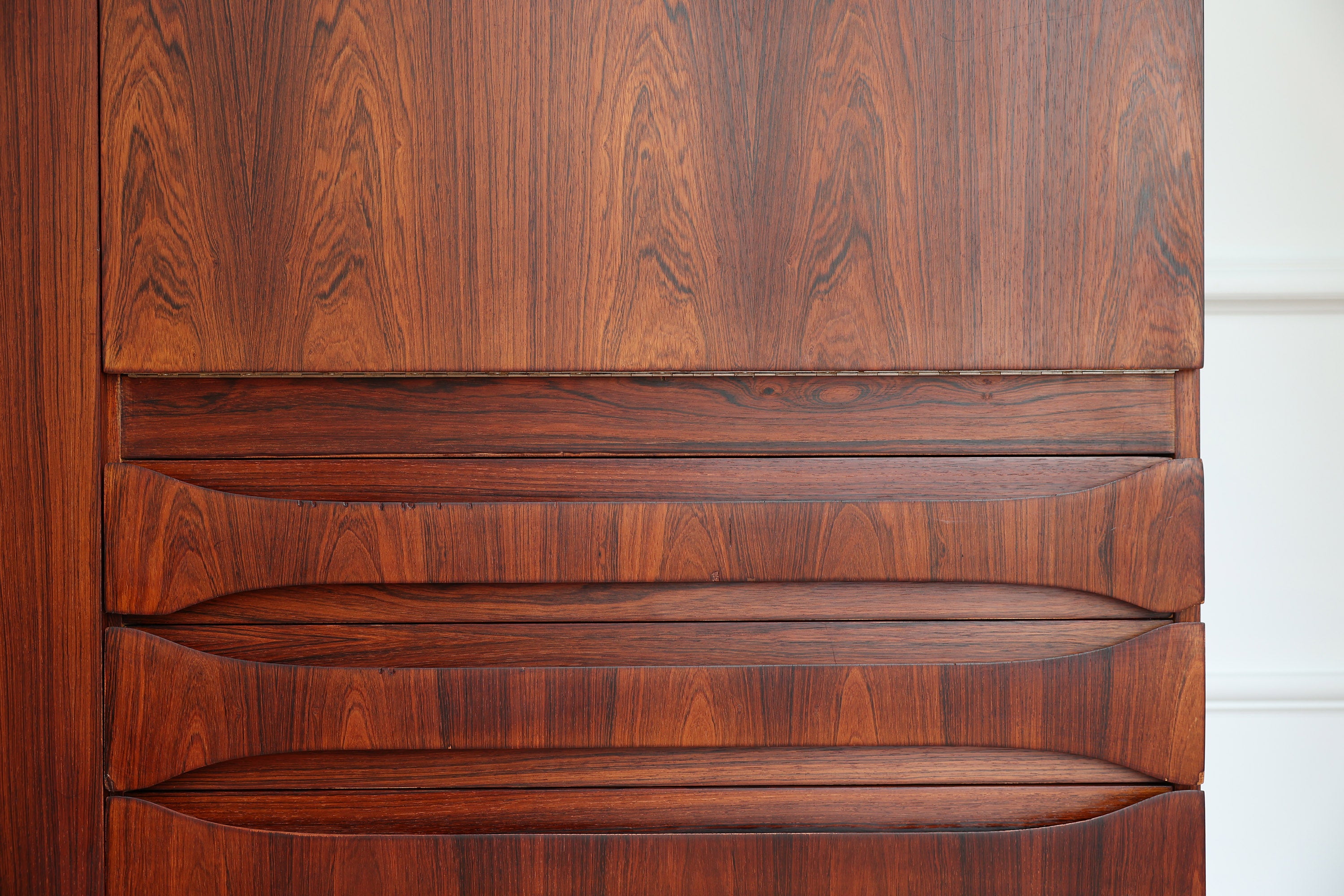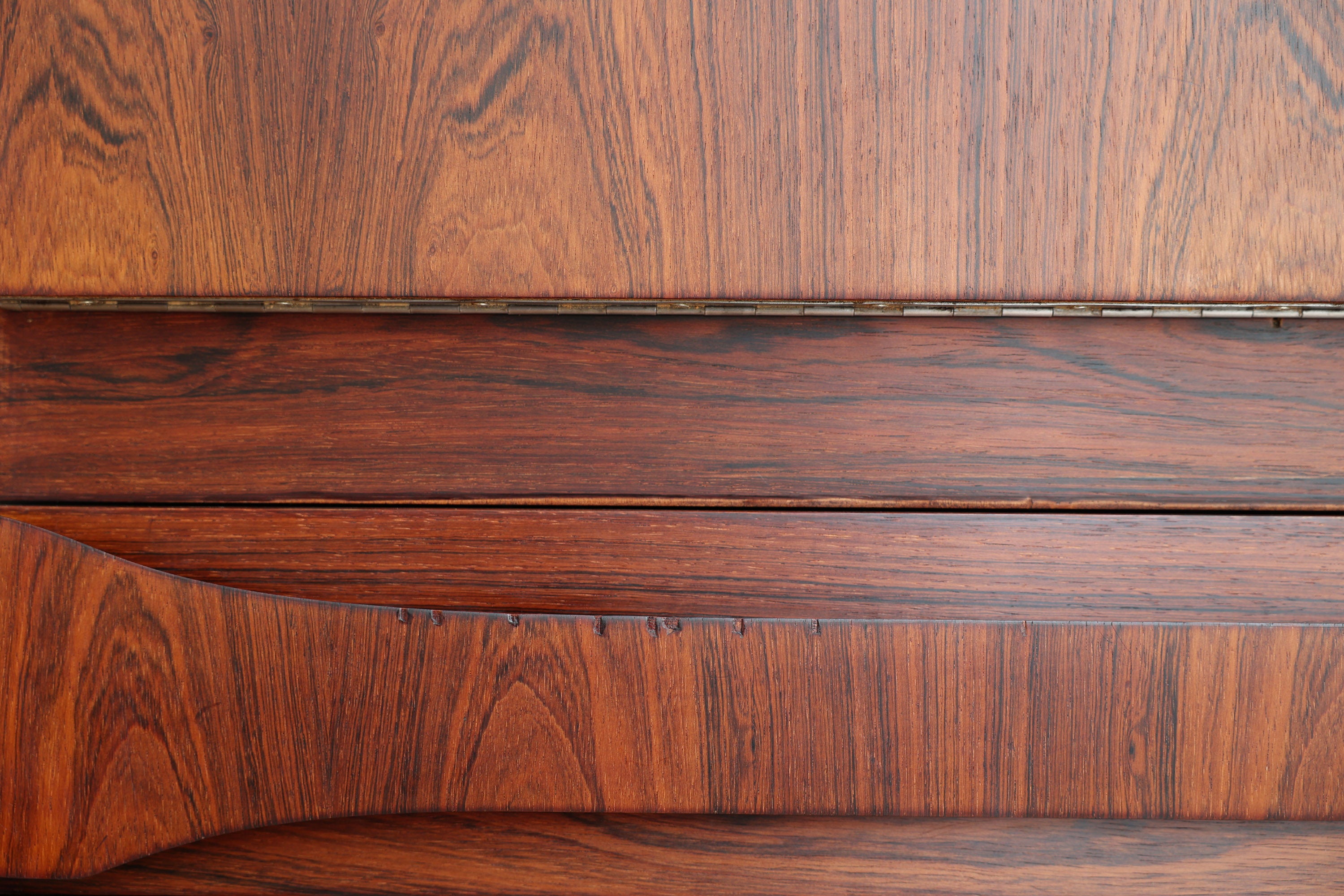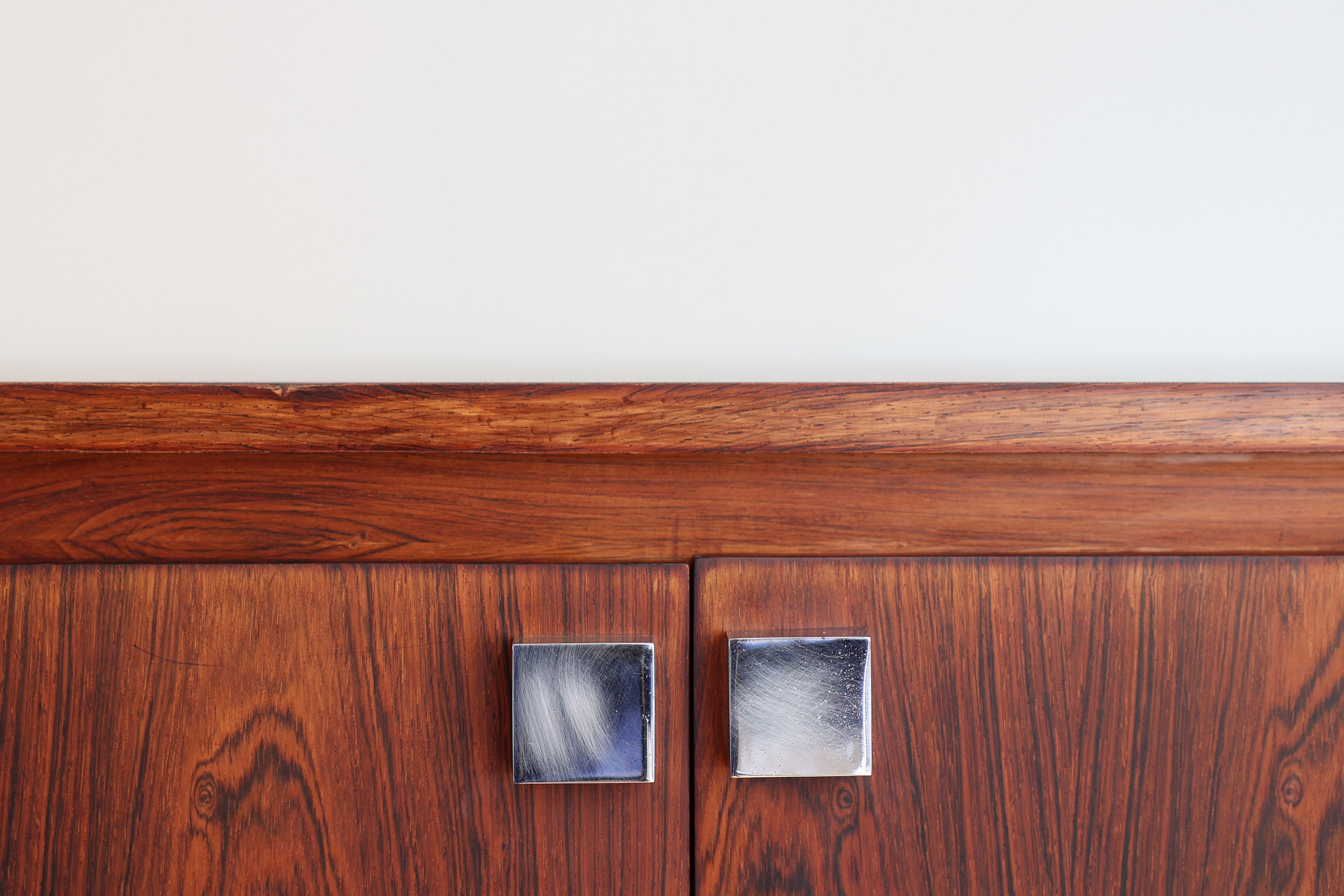 Dit elegante dressoir werd in het midden van de 20e eeuw ontworpen door Oswald Vermaercke voor V-Form. Het meubel, uitgevoerd in prachtig palissanderfineer, rust op slanke chromen poten die subtiel worden geaccentueerd door elegante houten voetjes. De verfijnd gesculpteerde handgrepen en fronten van de lades trekken meteen de aandacht en getuigen van het uitstekende vakmanschap achter het ontwerp.