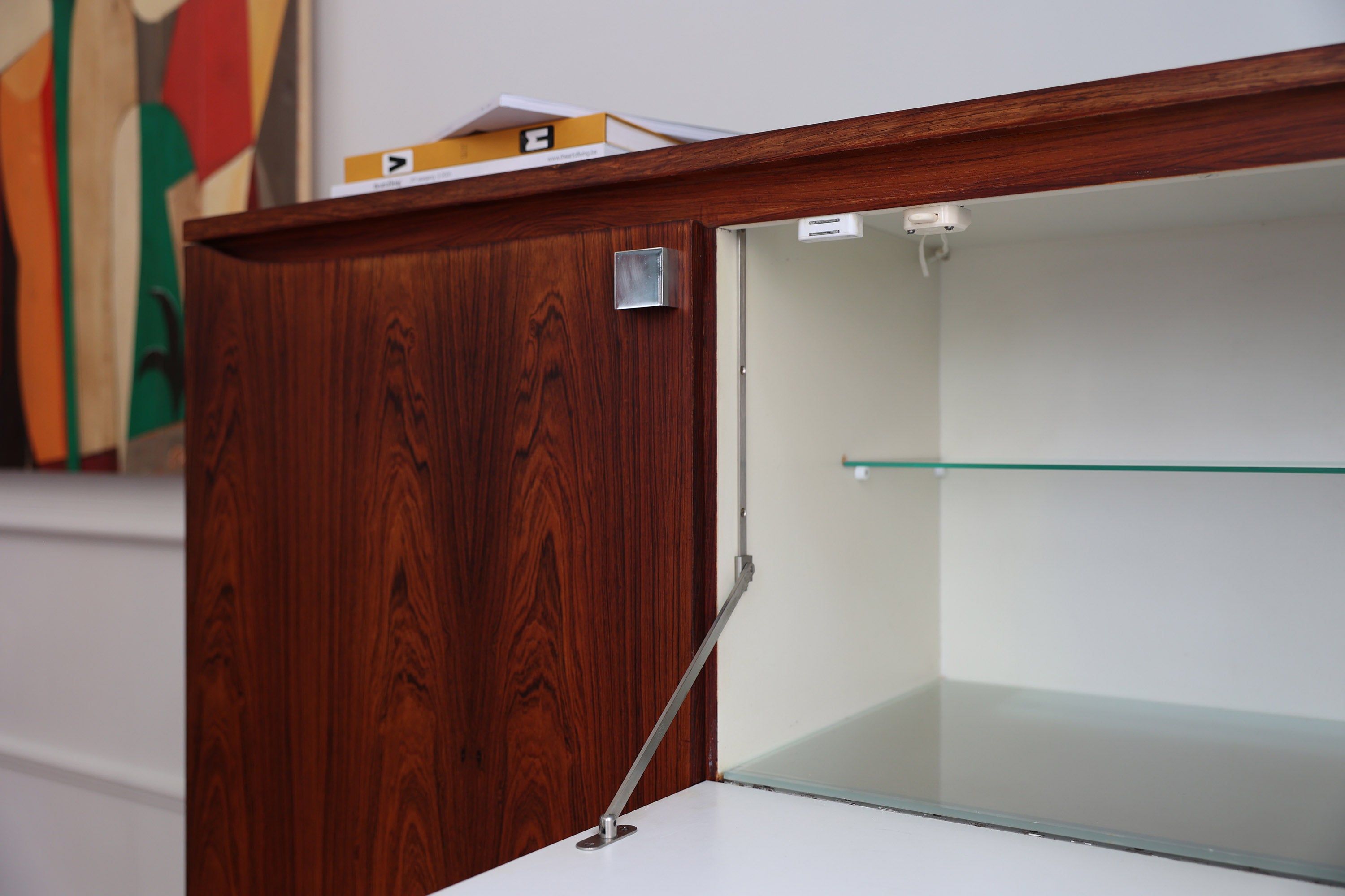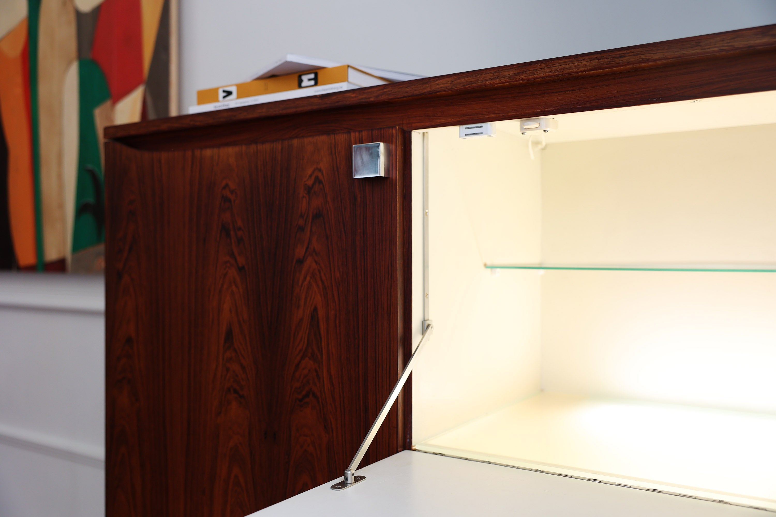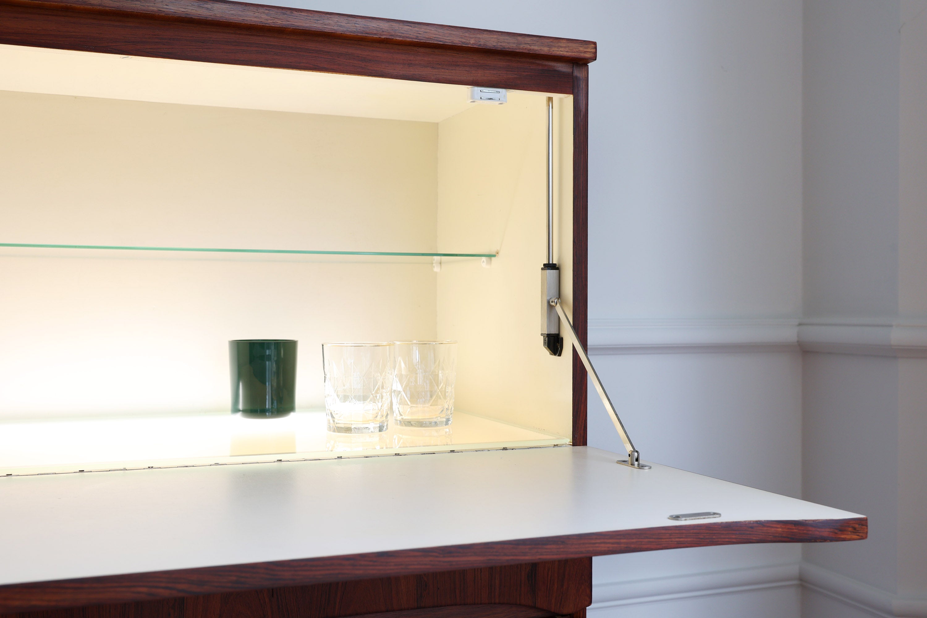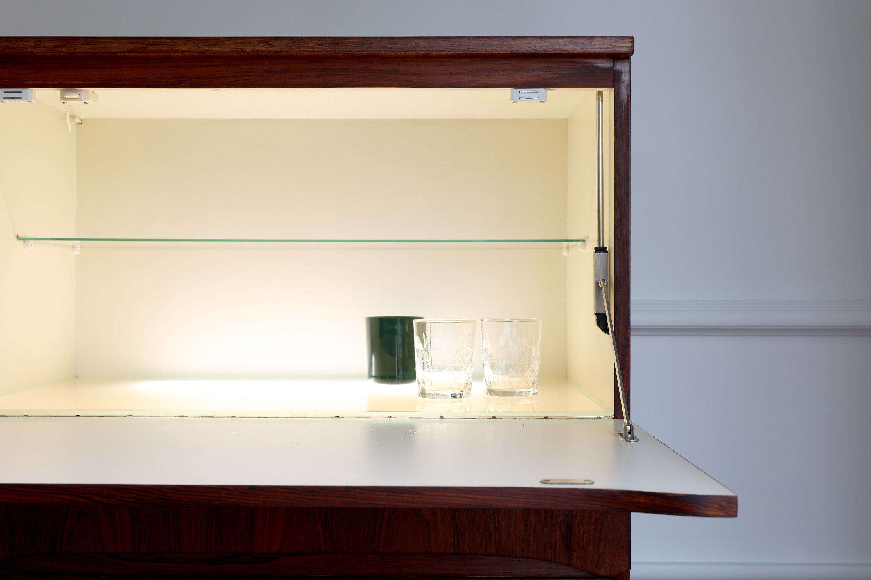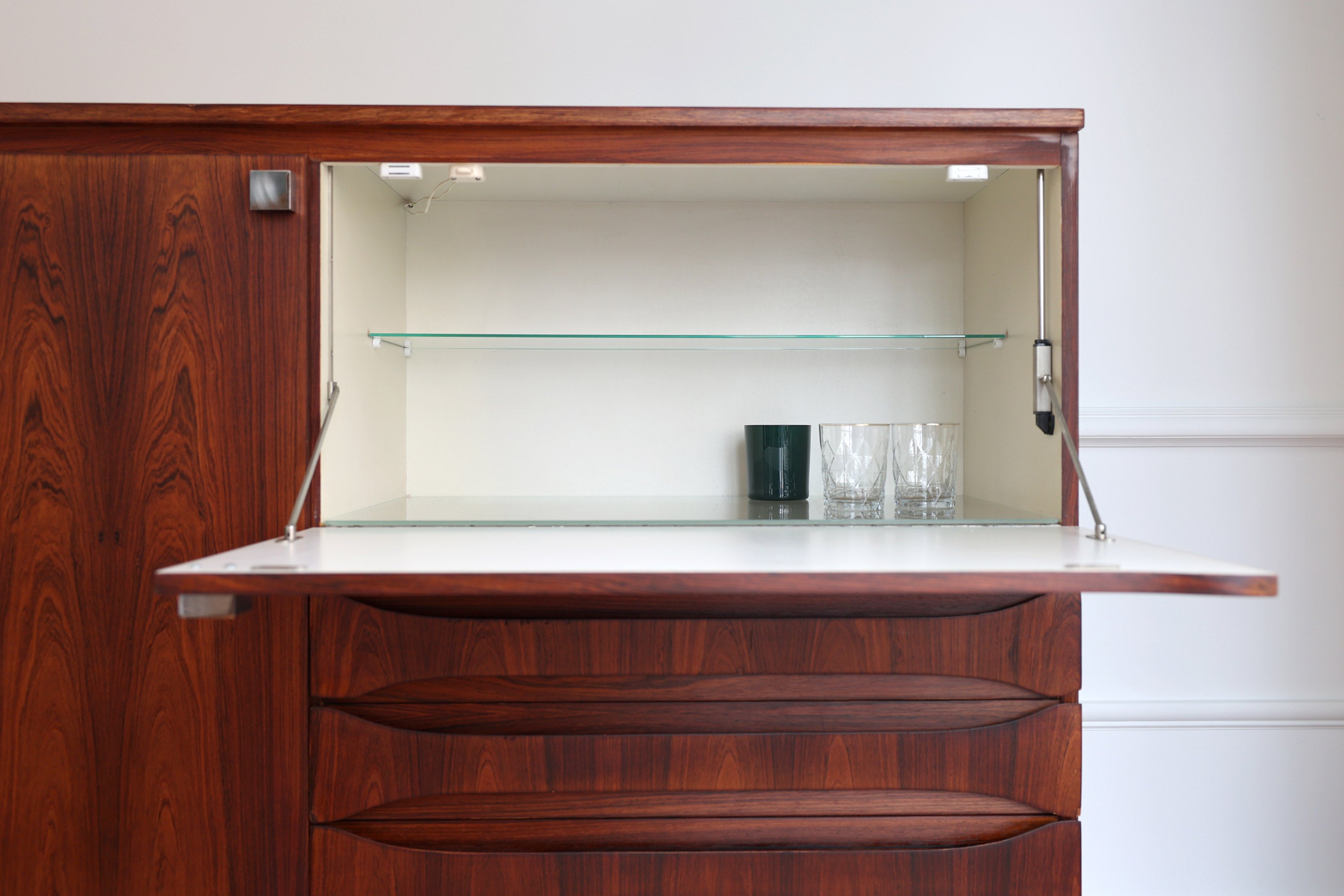 Aan de linkerkant bevindt zich een deur met scharnieren, terwijl de rechterkant een neerklapbaar barkastje met interne verlichting bevat. Daaronder zijn drie lades voorzien voor extra opbergruimte.