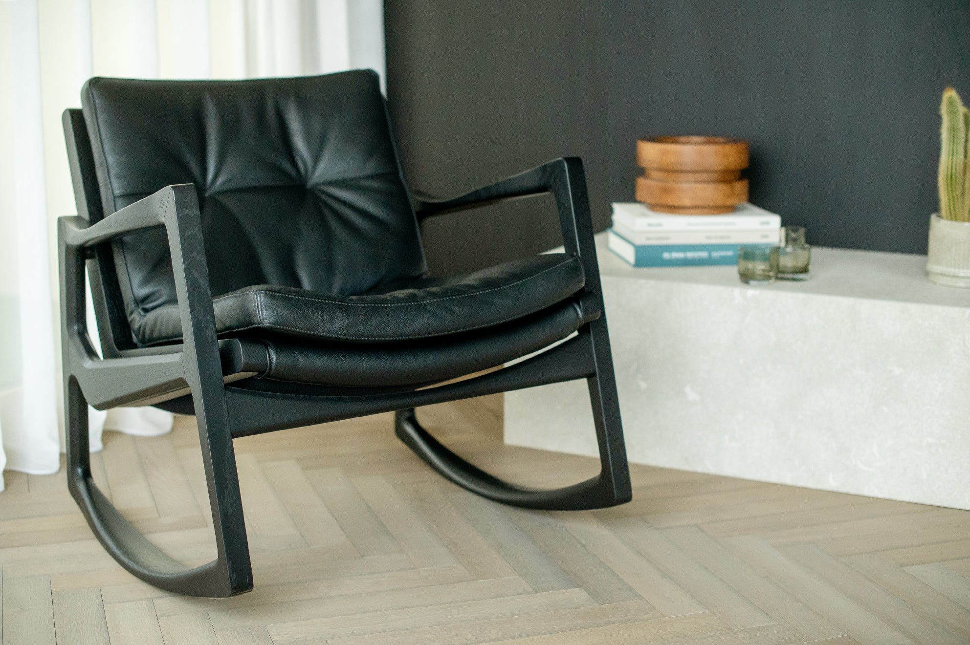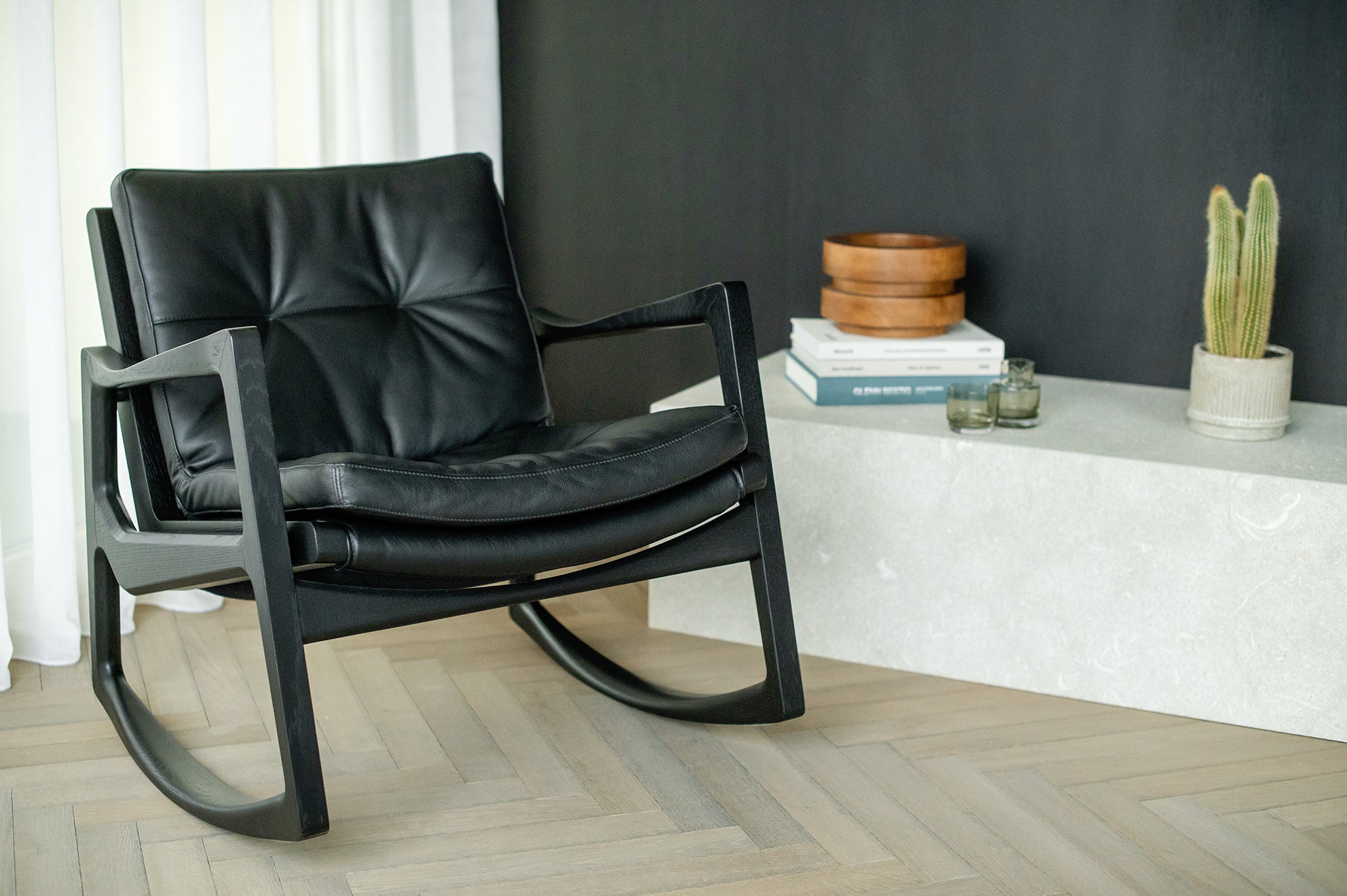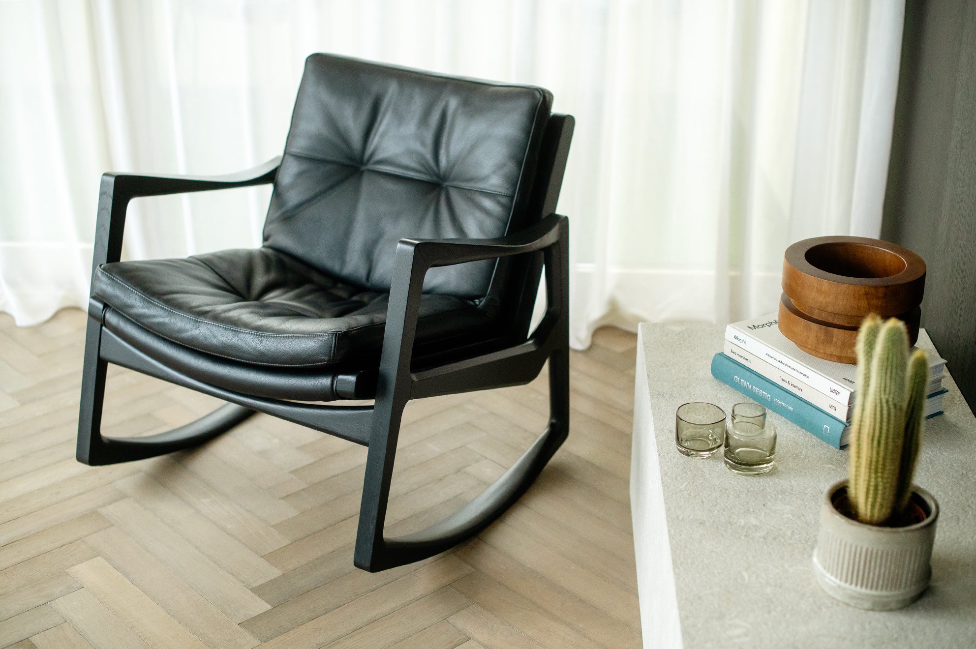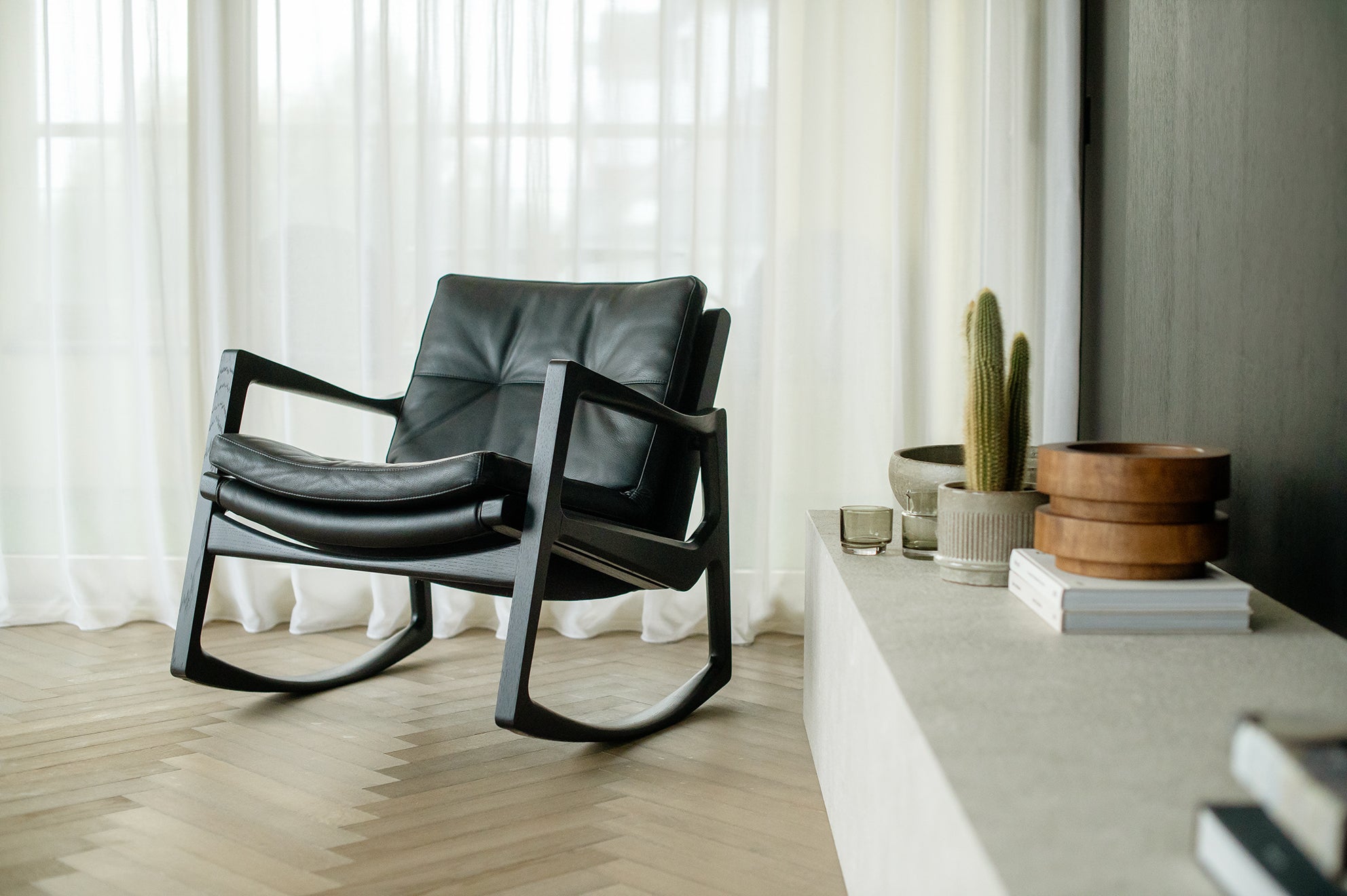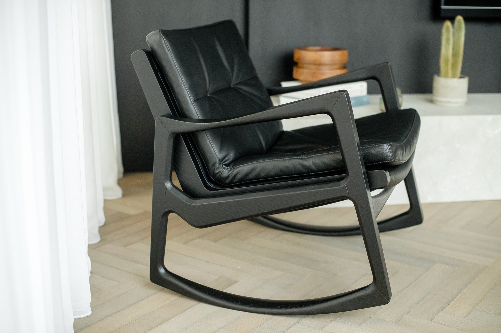 Met deze stoel combineert Almeida op meesterlijke wijze het comfort van een traditionele schommelstoel met de verfijning van een leren clubfauteuil. De strakke armleuningen van de stoel weerspiegelen de vloeiende lijnen van de schommelstoelen, wat een harmonieus ontwerp creëert dat evenwichtig en dynamisch aanvoelt.