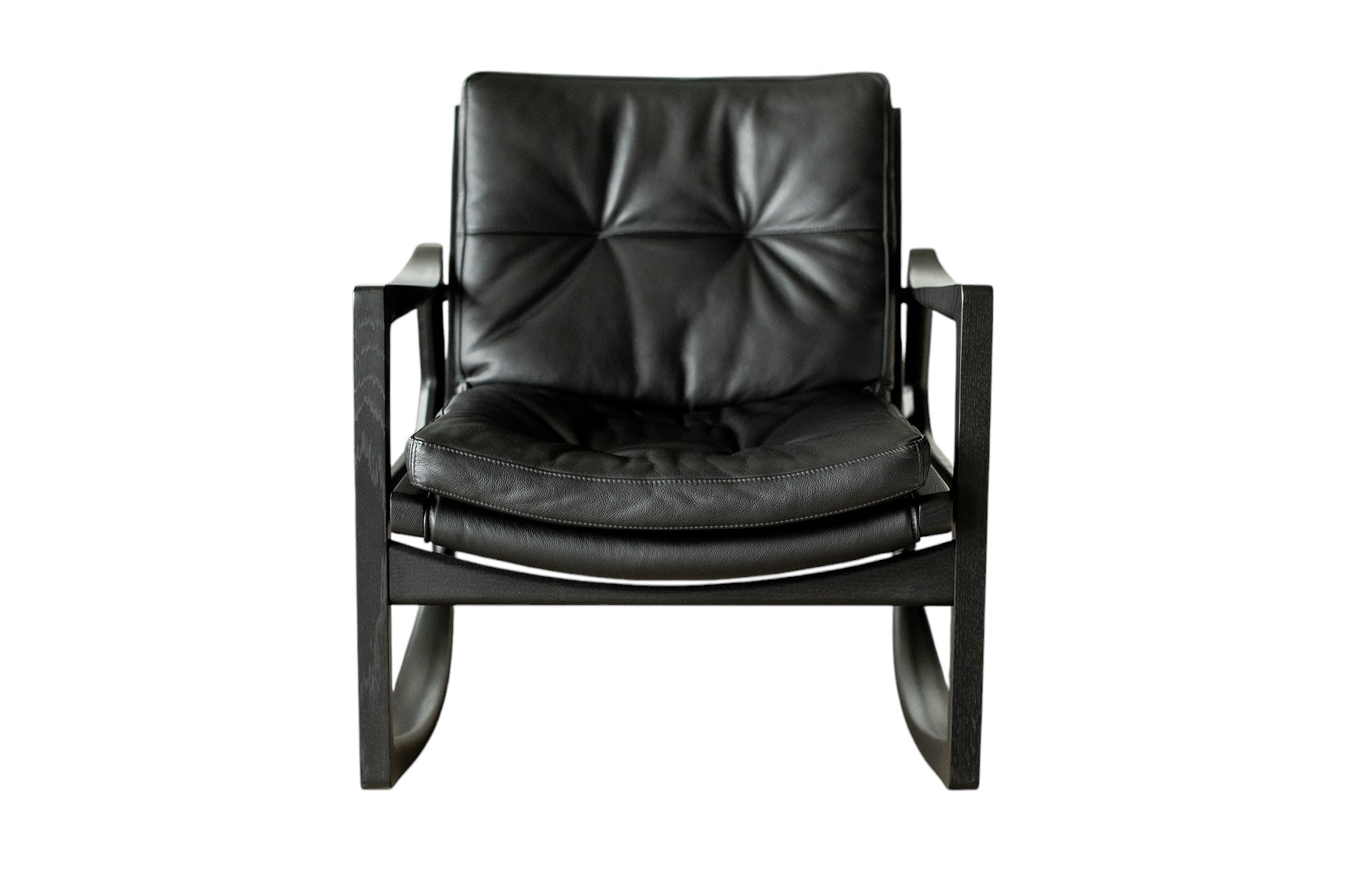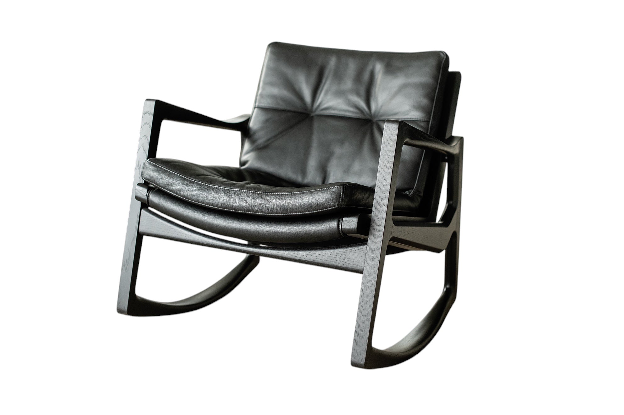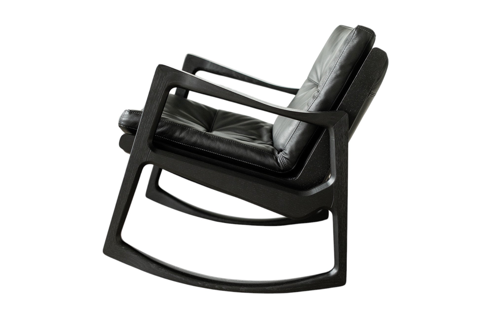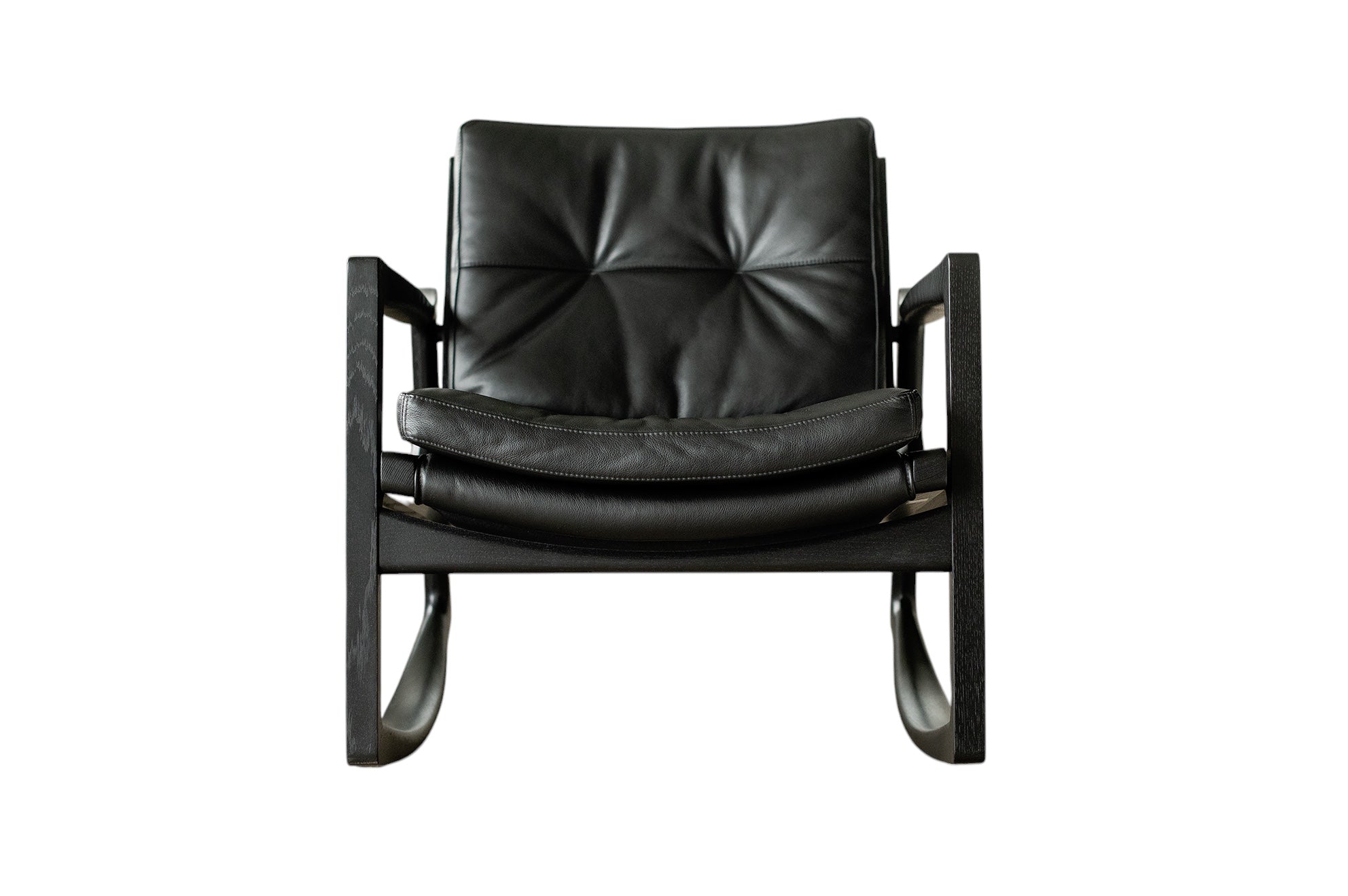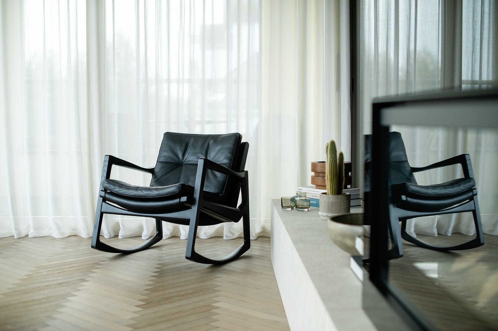 Met deze stoel combineert Almeida op meesterlijke wijze het comfort van een traditionele schommelstoel met de verfijning van een leren clubfauteuil. De strakke armleuningen van de stoel weerspiegelen de vloeiende lijnen van de schommelstoelen, wat een harmonieus ontwerp creëert dat evenwichtig en dynamisch aanvoelt.