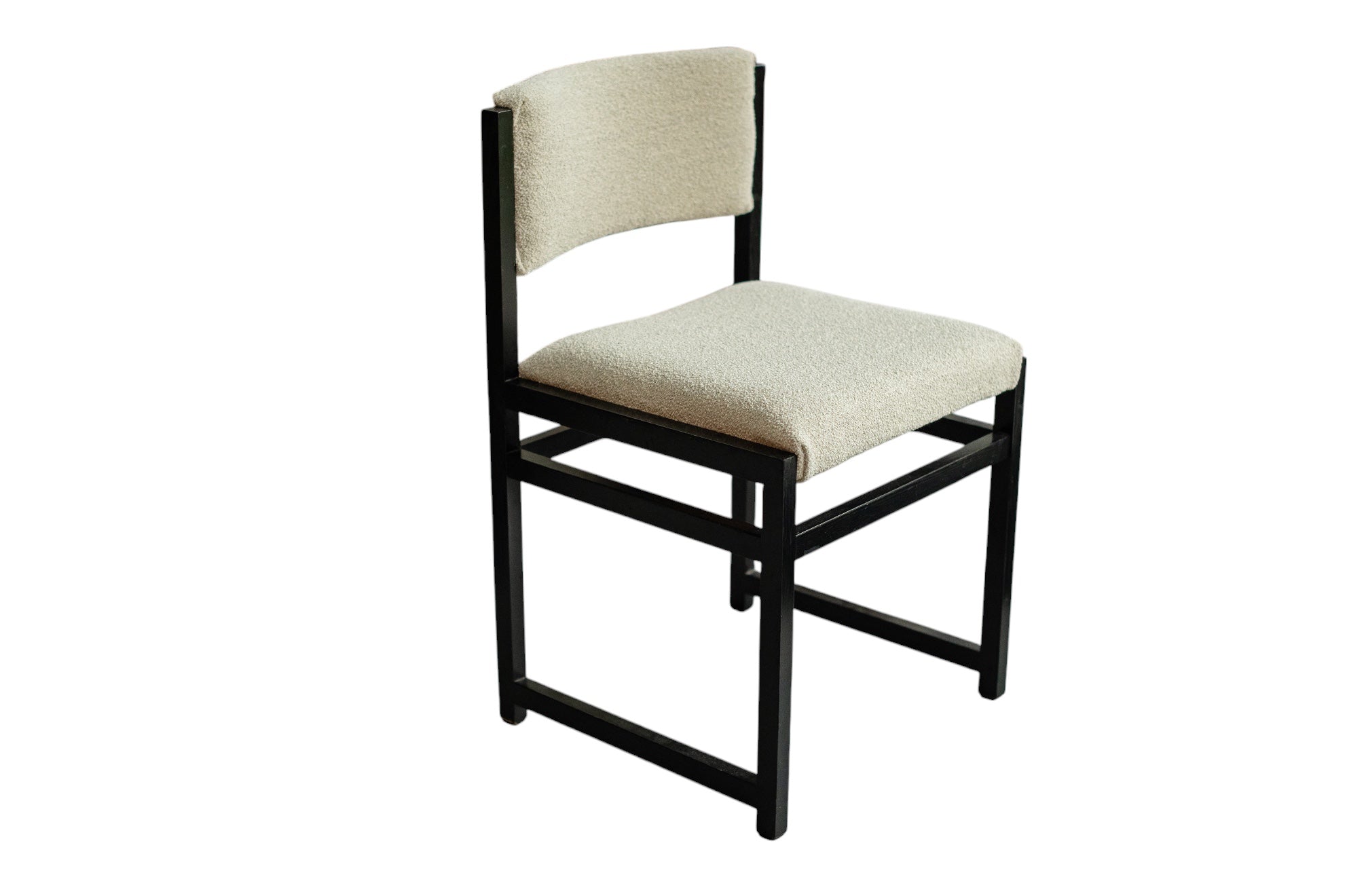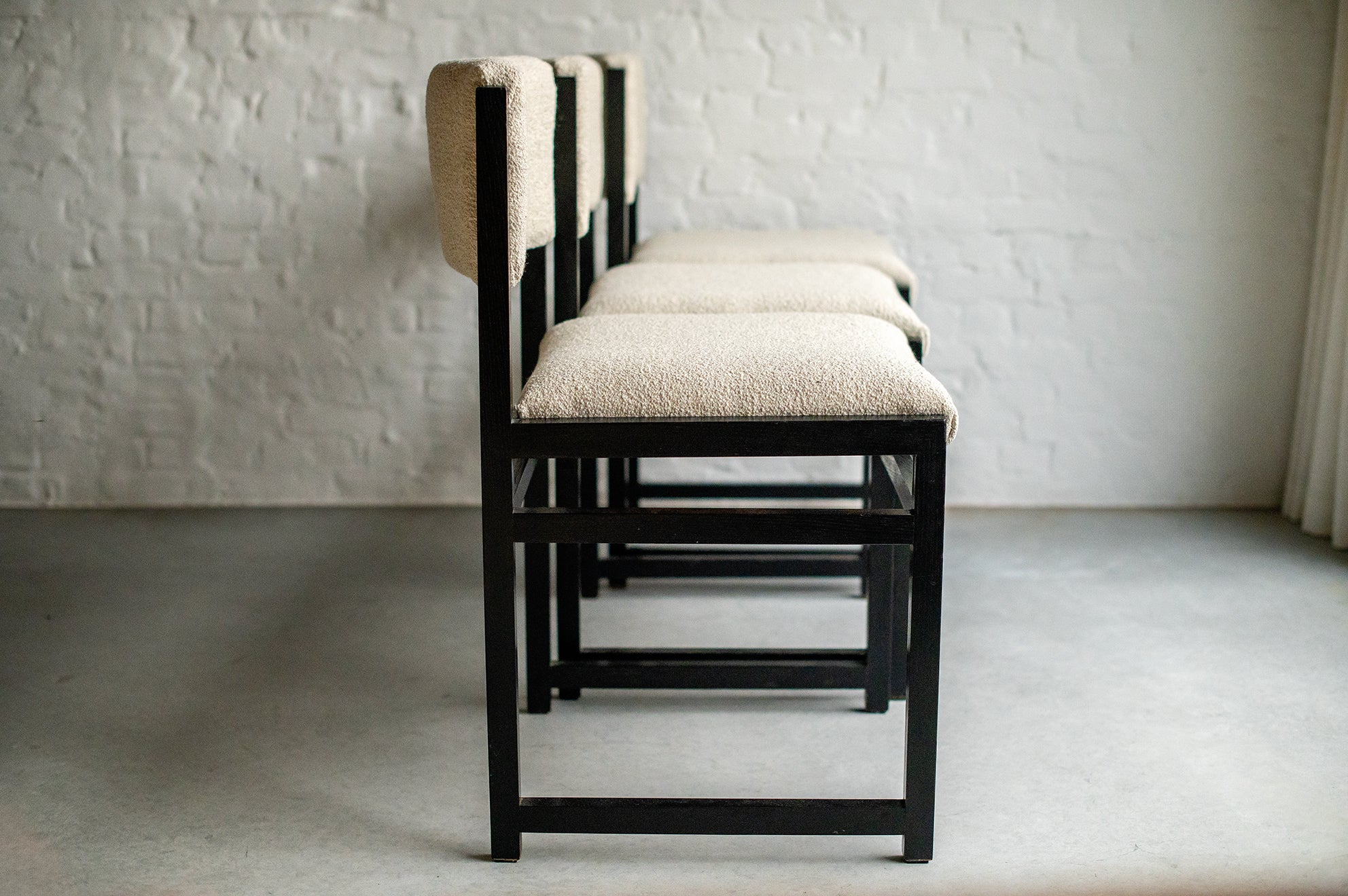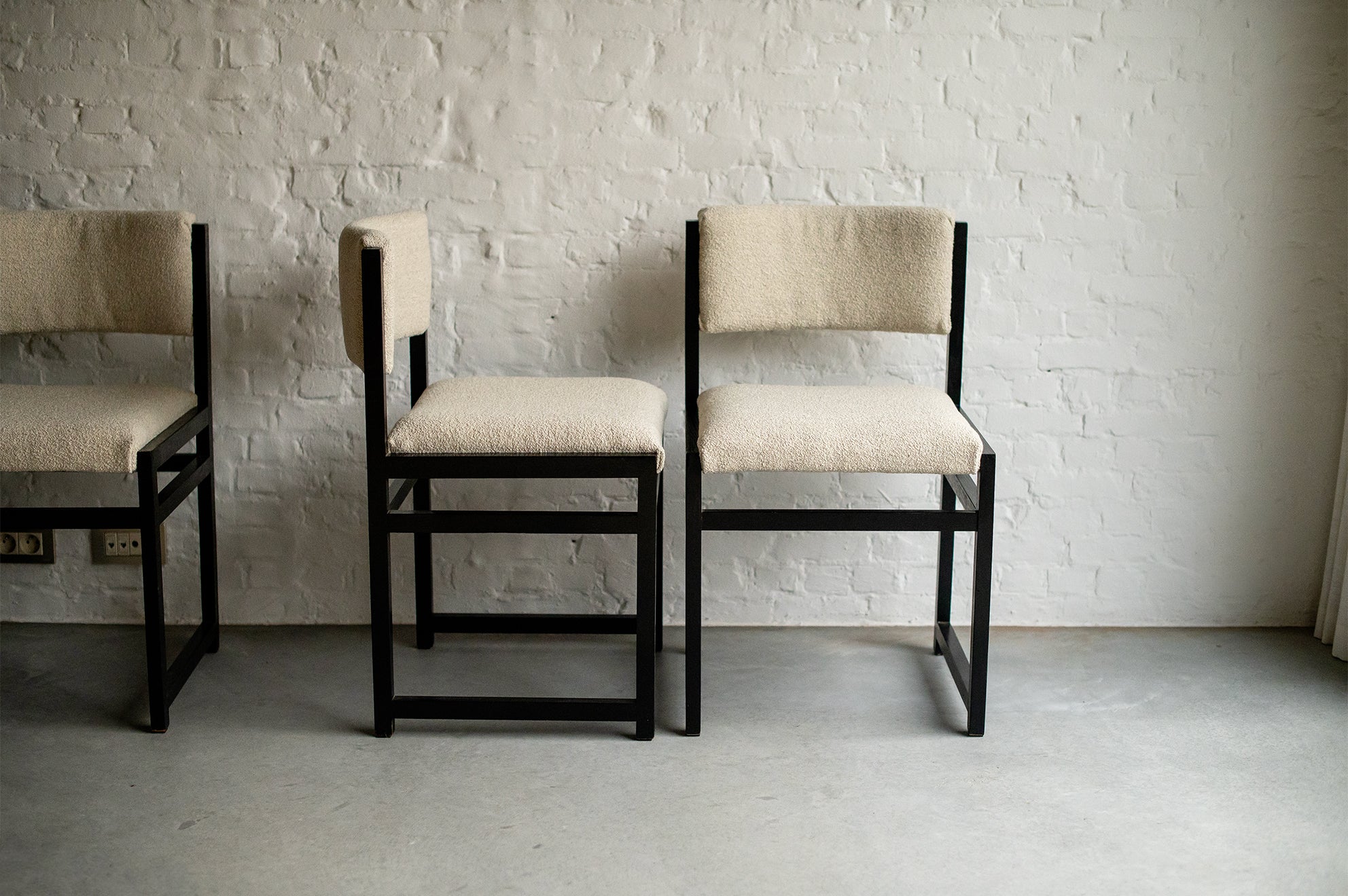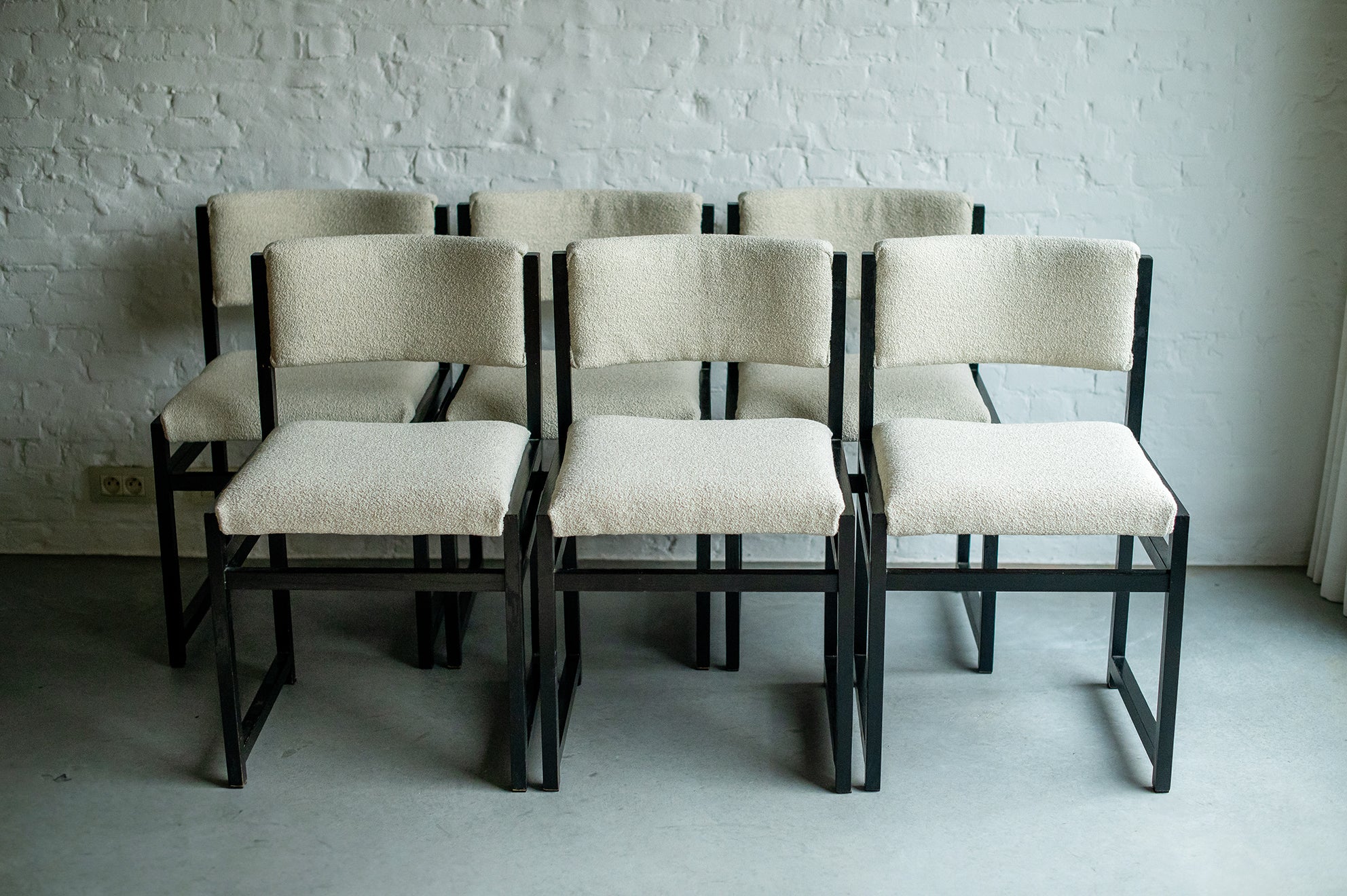 De uitschuifbare tafel heeft strakke lijnen en een minimalistisch design. De zes eetkamerstoelen, opnieuw bekleed met boucléstof die kenmerkend is voor de jaren 70, bieden zowel comfort als stijl. De luxueuze textuur van de stof voegt warmte en diepte toe aan de set, en complementeert de tijdloze schoonheid van het geëboniseerde eikenhout. Defours aandacht voor detail is duidelijk zichtbaar in het vakmanschap van deze eetkamerset, van de stevige constructie tot de nauwkeurige houten inlegwerkjes.