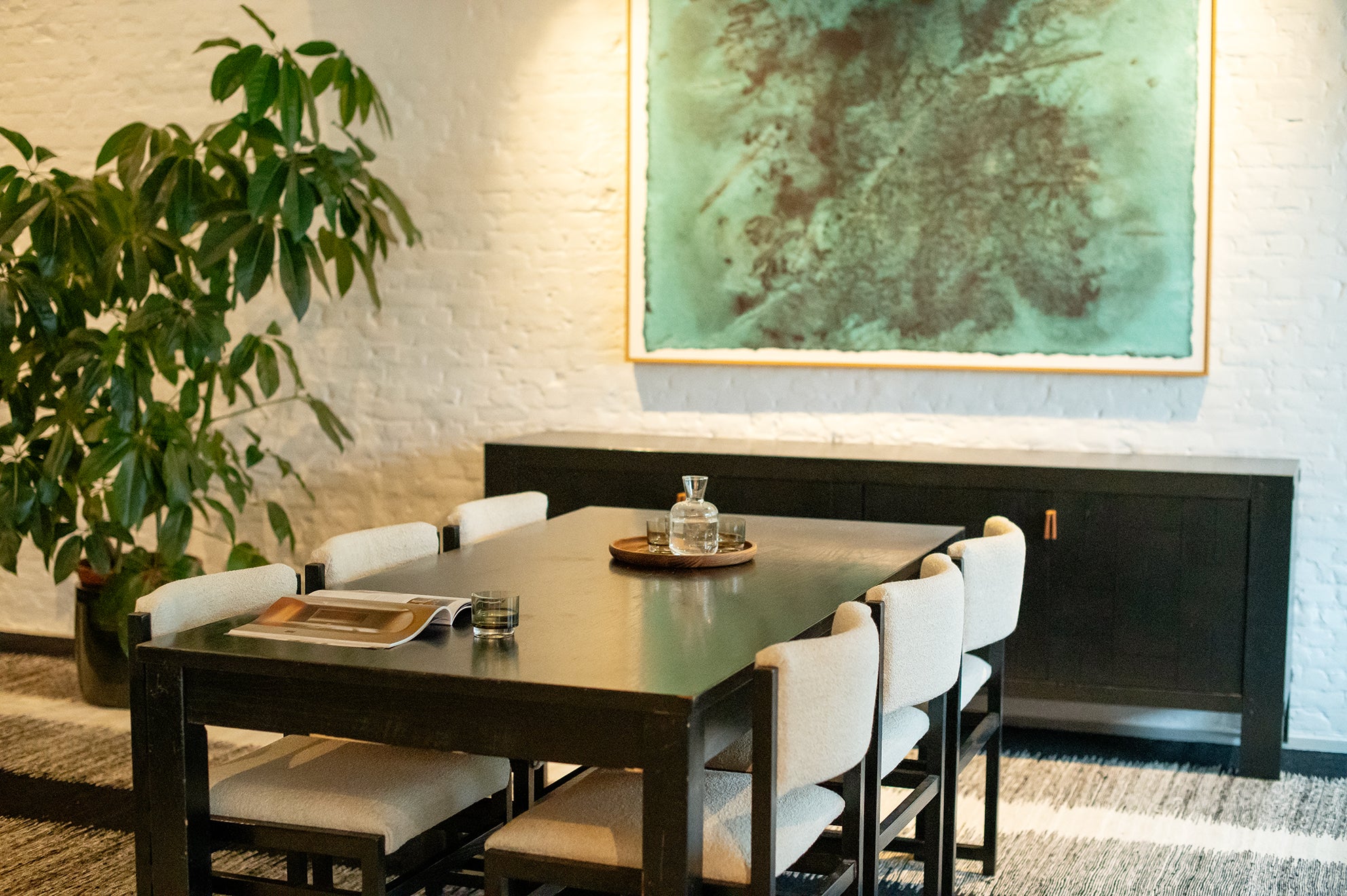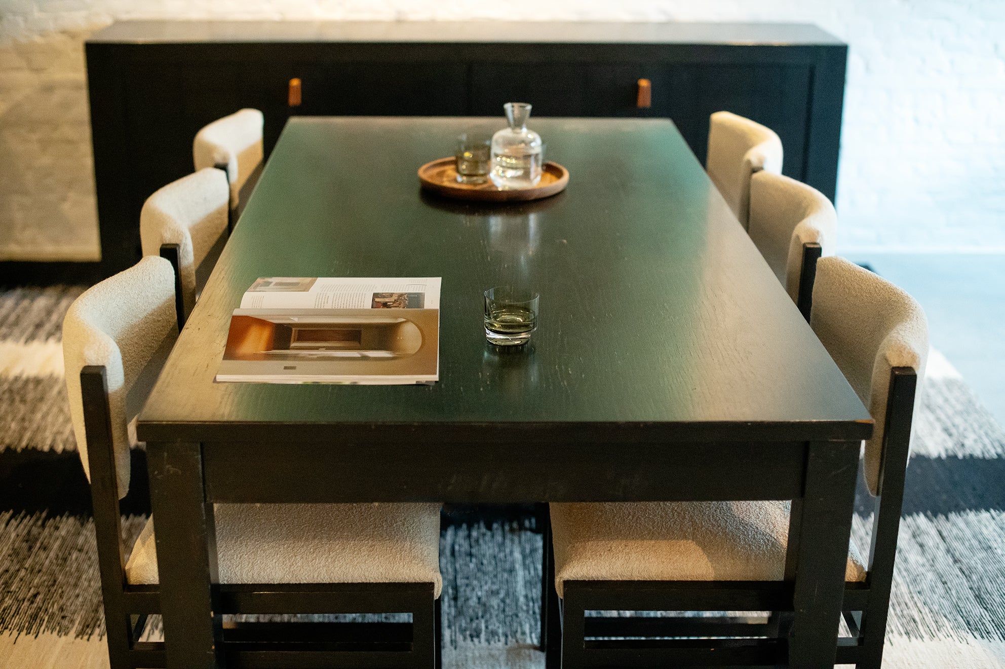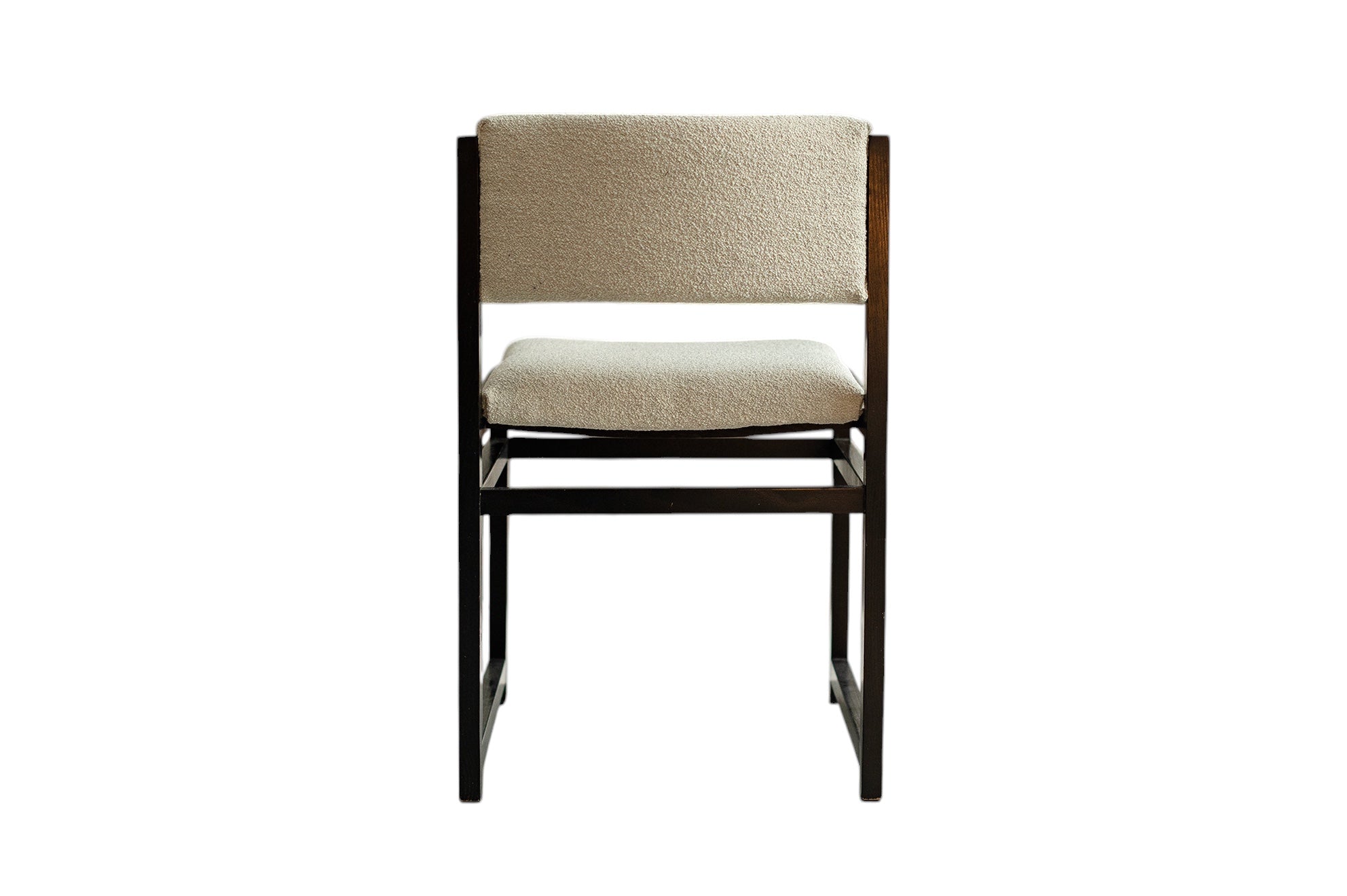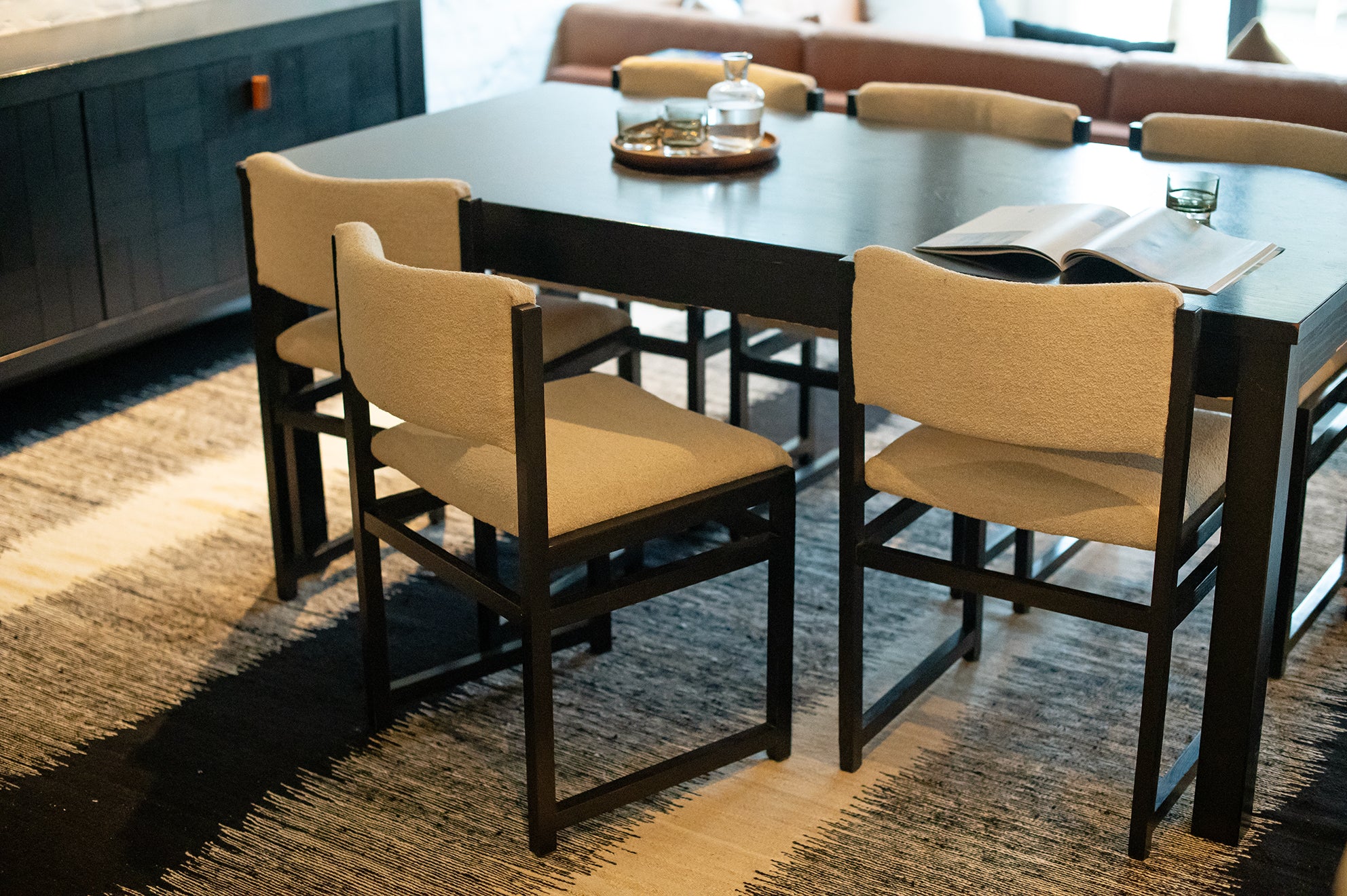 De uitschuifbare tafel heeft strakke lijnen en een minimalistisch design. De zes eetkamerstoelen, opnieuw bekleed met boucléstof die kenmerkend is voor de jaren 70, bieden zowel comfort als stijl. De luxueuze textuur van de stof voegt warmte en diepte toe aan de set, en complementeert de tijdloze schoonheid van het geëboniseerde eikenhout. Defours aandacht voor detail is duidelijk zichtbaar in het vakmanschap van deze eetkamerset, van de stevige constructie tot de nauwkeurige houten inlegwerkjes.