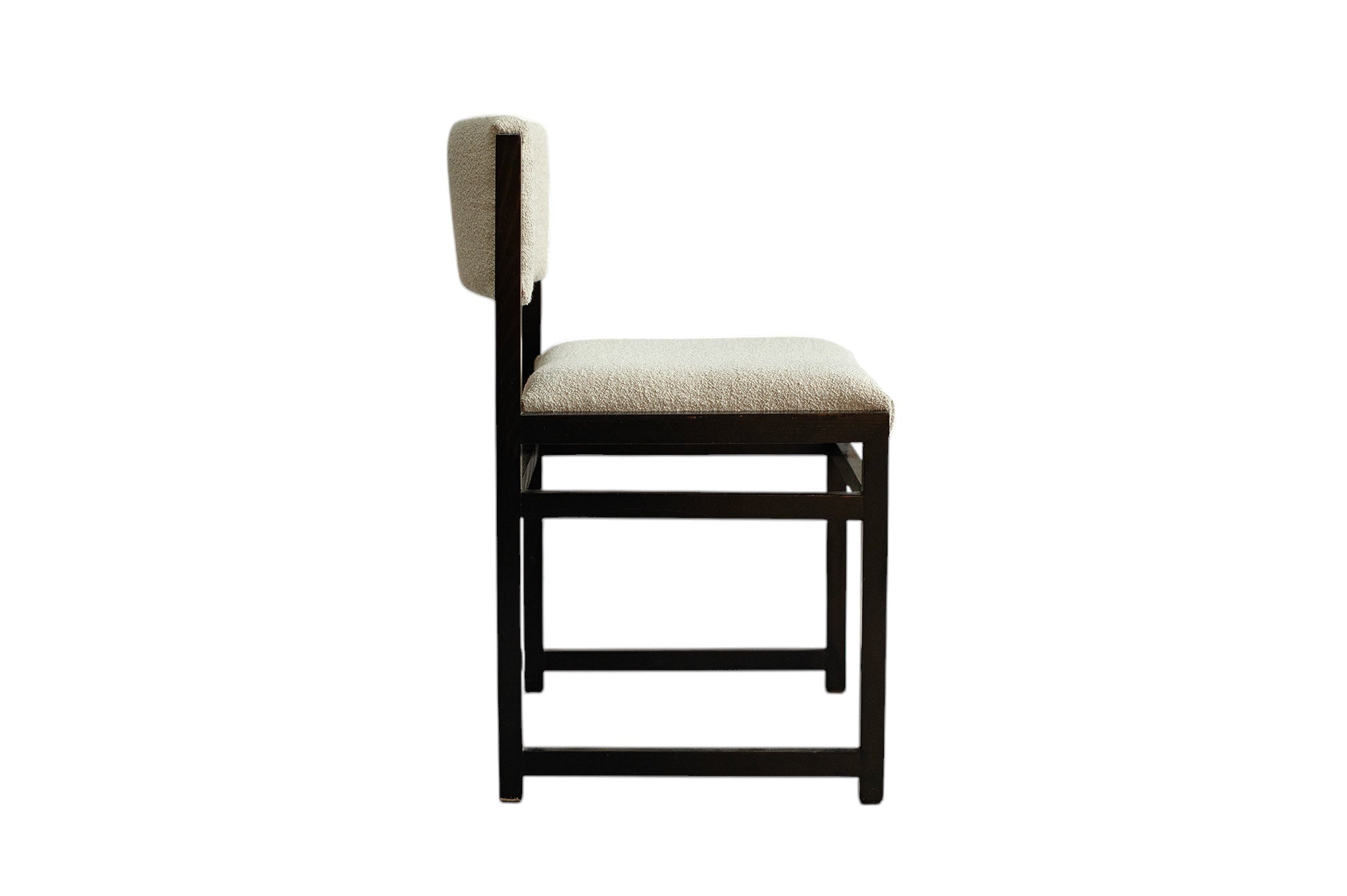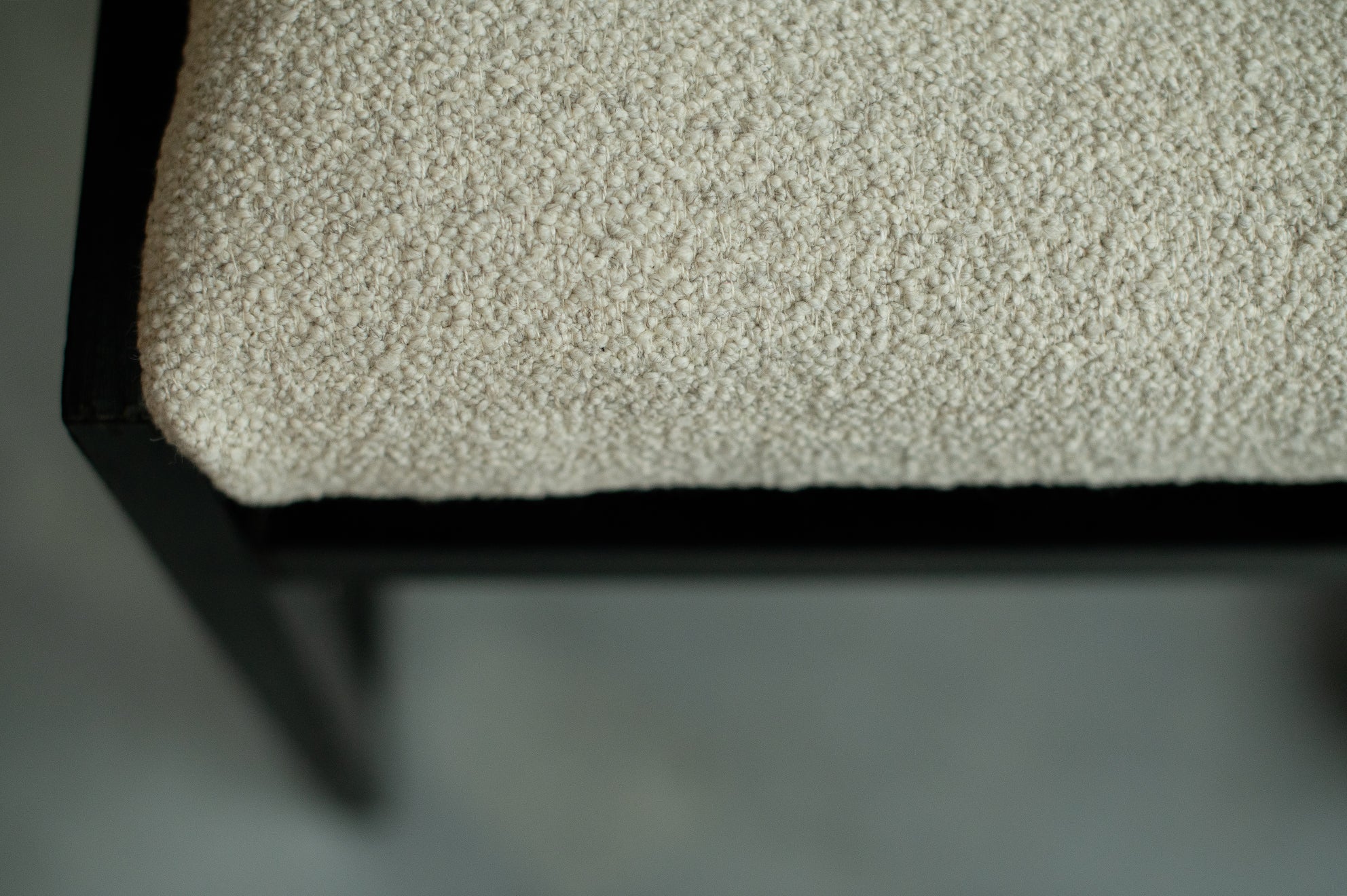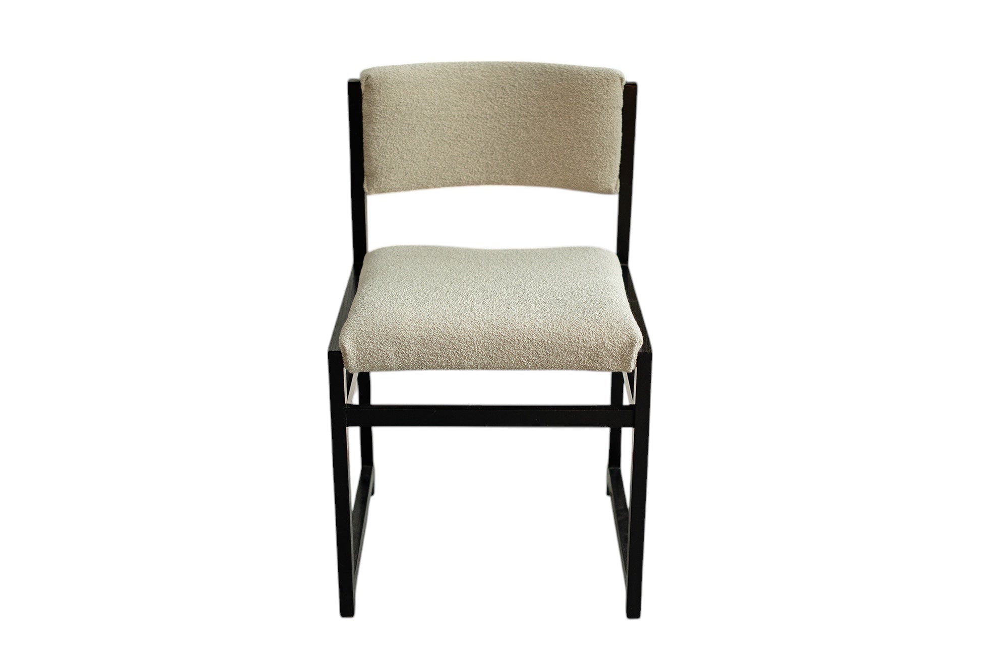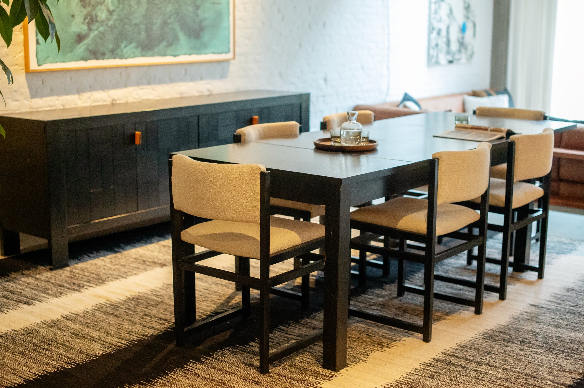 De uitschuifbare tafel heeft strakke lijnen en een minimalistisch design. De zes eetkamerstoelen, opnieuw bekleed met boucléstof die kenmerkend is voor de jaren 70, bieden zowel comfort als stijl. De luxueuze textuur van de stof voegt warmte en diepte toe aan de set, en complementeert de tijdloze schoonheid van het geëboniseerde eikenhout. Defours aandacht voor detail is duidelijk zichtbaar in het vakmanschap van deze eetkamerset, van de stevige constructie tot de nauwkeurige houten inlegwerkjes.