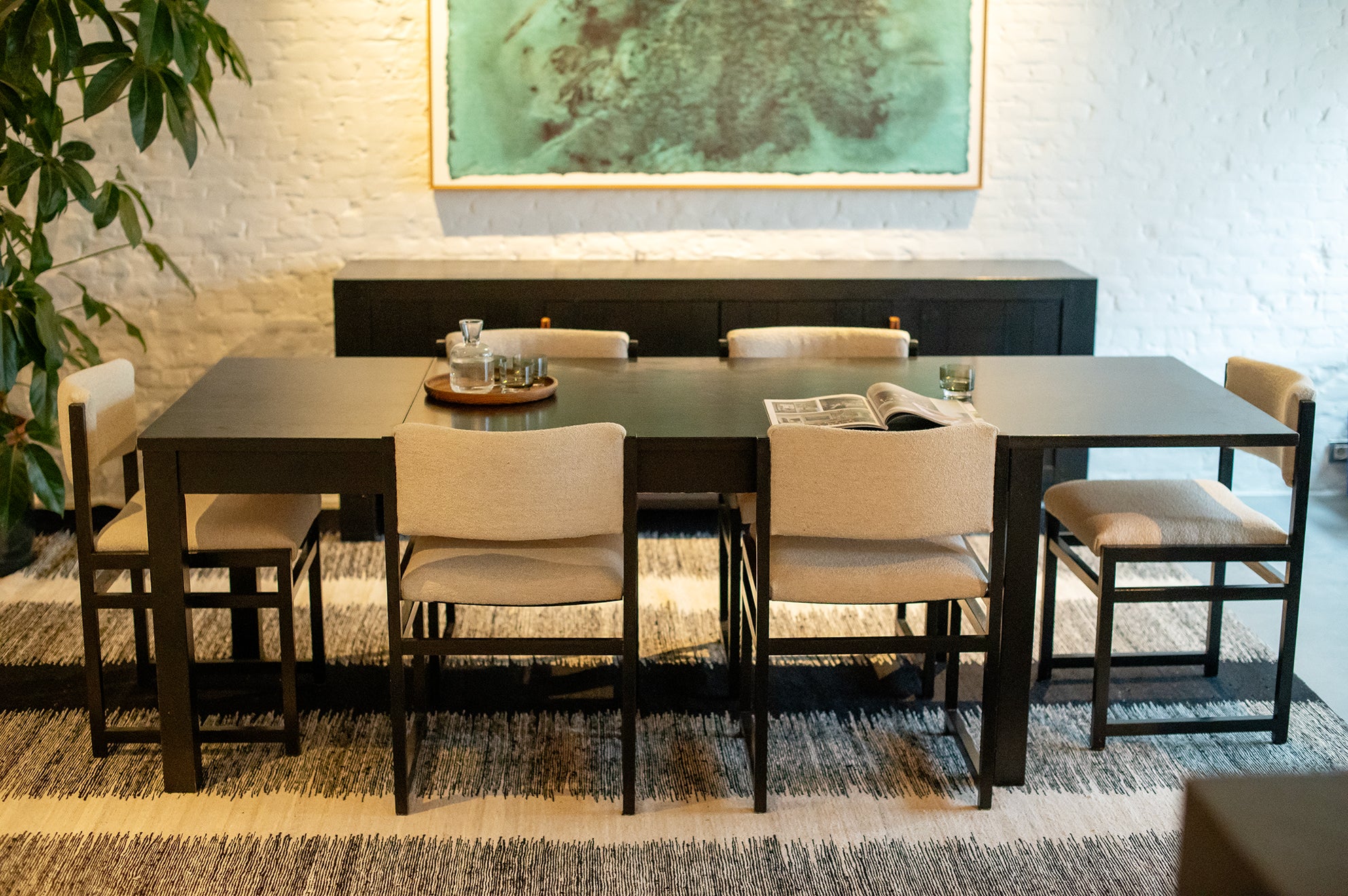 Deze eetkamerset verkeert in goede vintage staat en past perfect bij ons Defour Black Ebonized Oak dressoir uit de jaren 70.