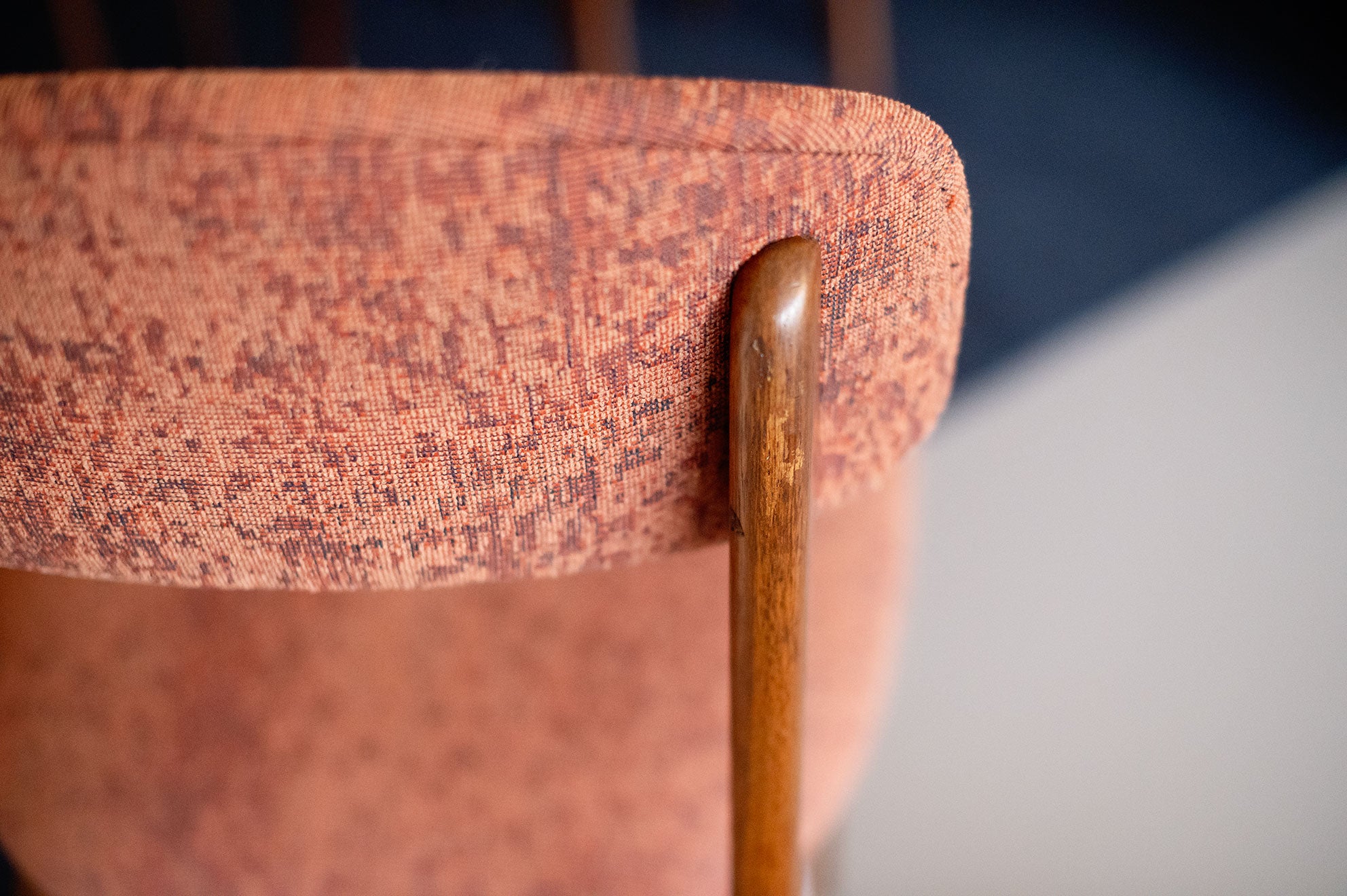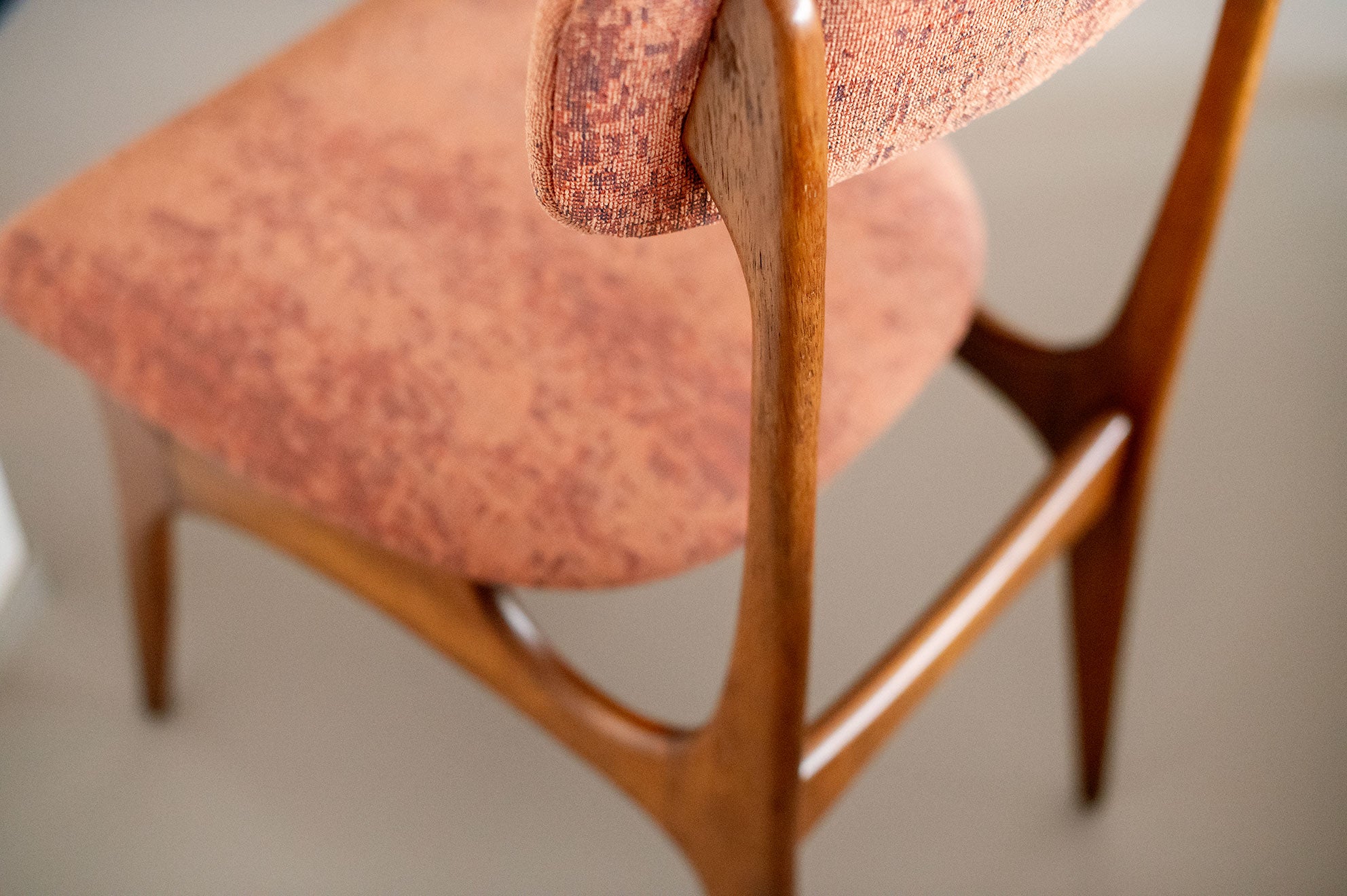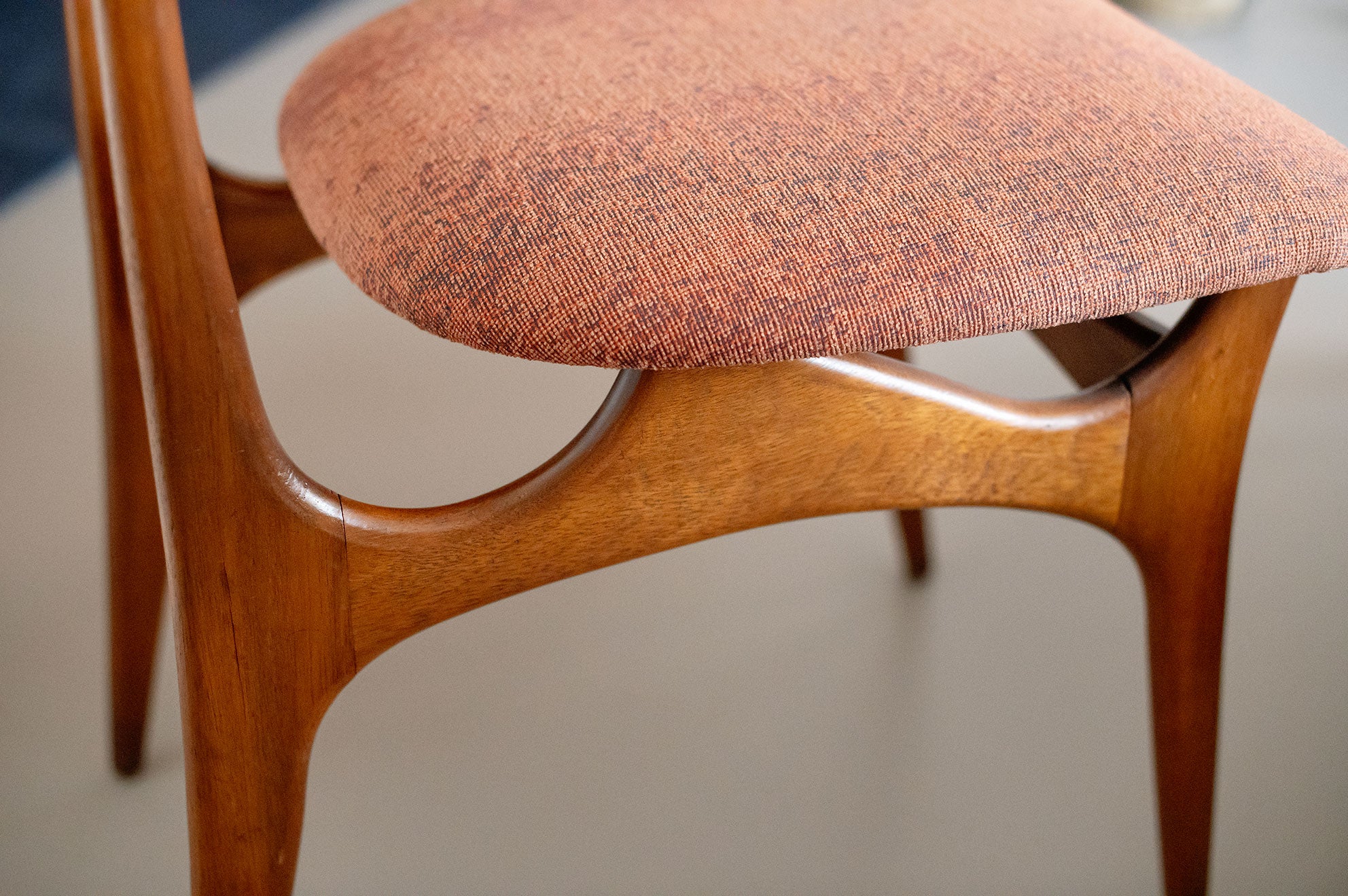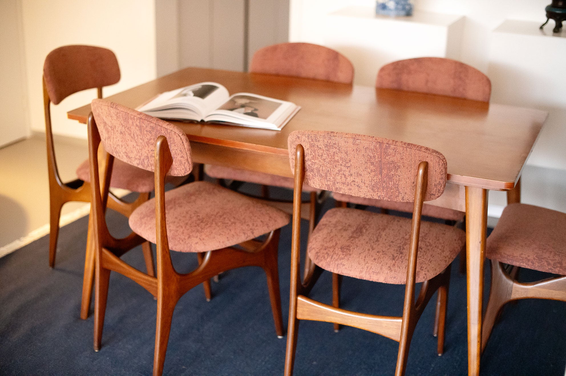 Verzamel rond de tafel met deze set van zes Louis Van Teeffelen eetkamerstoelen uit massief geolied teakhout. Deze tijdloze stoelen zijn onlangs in hun oorspronkelijke staat hersteld en bieden een tijdloos palet van verfijnde elegantie. De stof is nieuw en is ontworpen door Patricia Urquiola, de bekende Spaanse architecte en ontwerpster. Het heeft een levendige structuur en is gemaakt van uitstekende kwaliteit. Deze stoelen zijn voorzien van een knap design en zijn de perfecte keuze voor het hosten van uw volgende etentje.