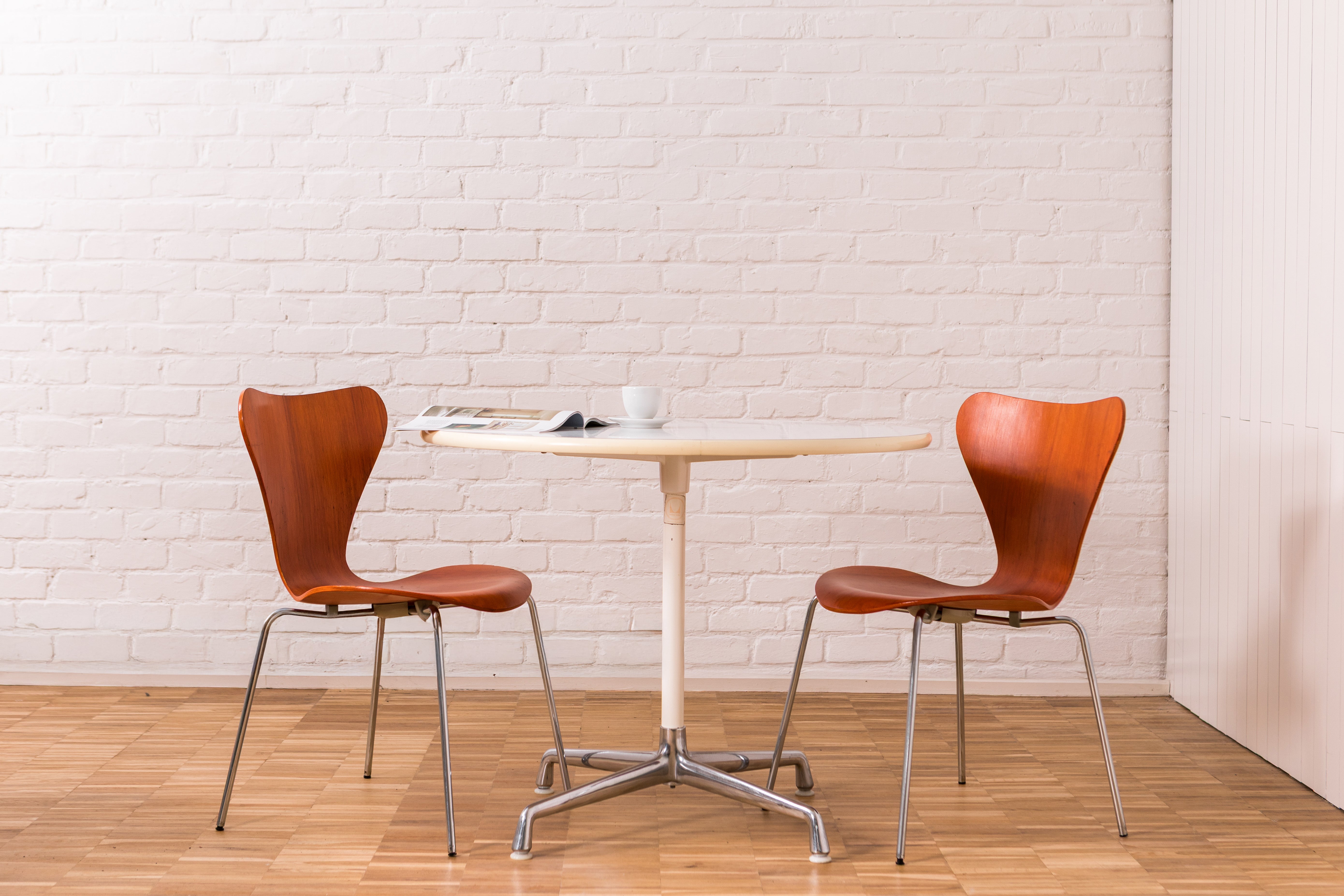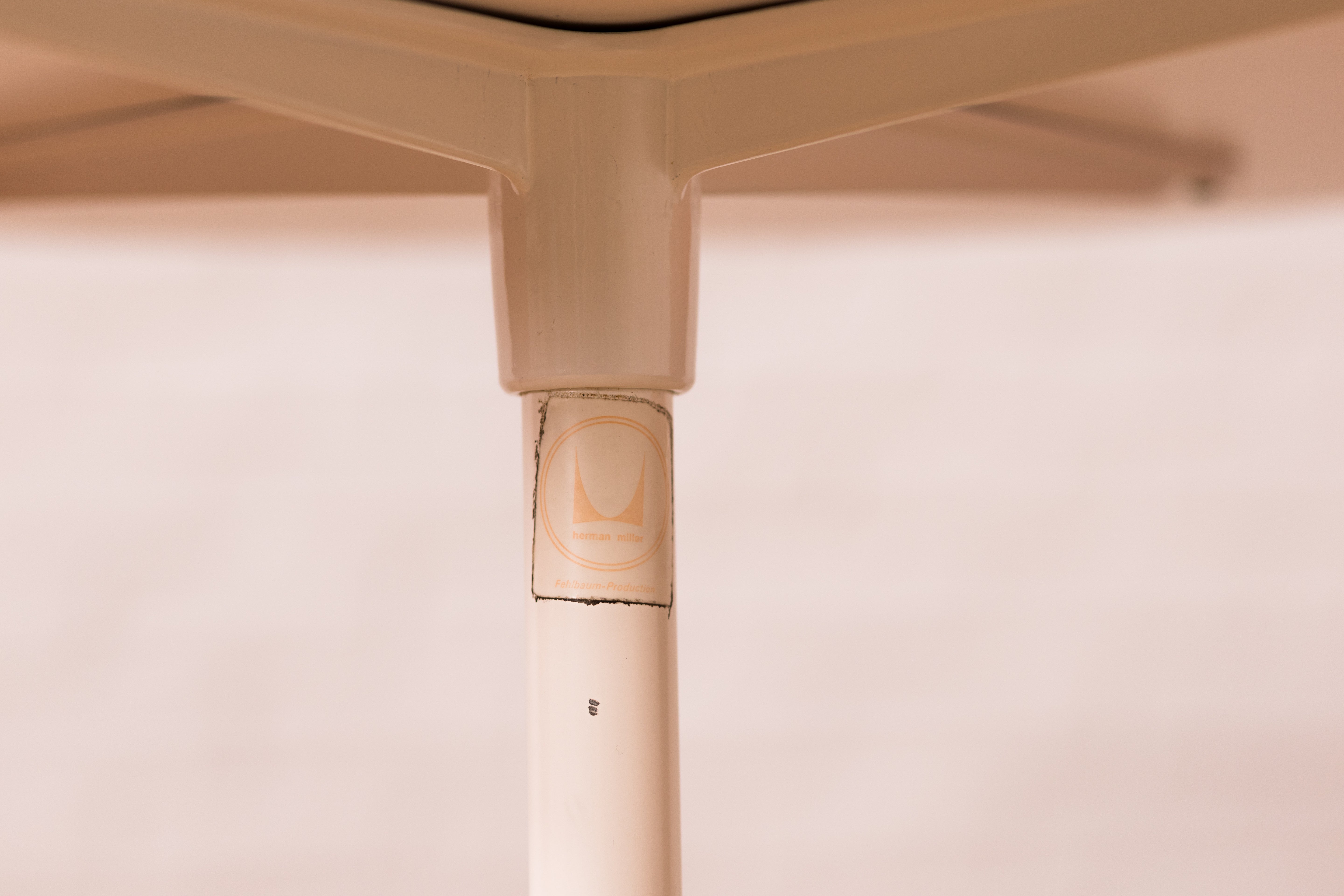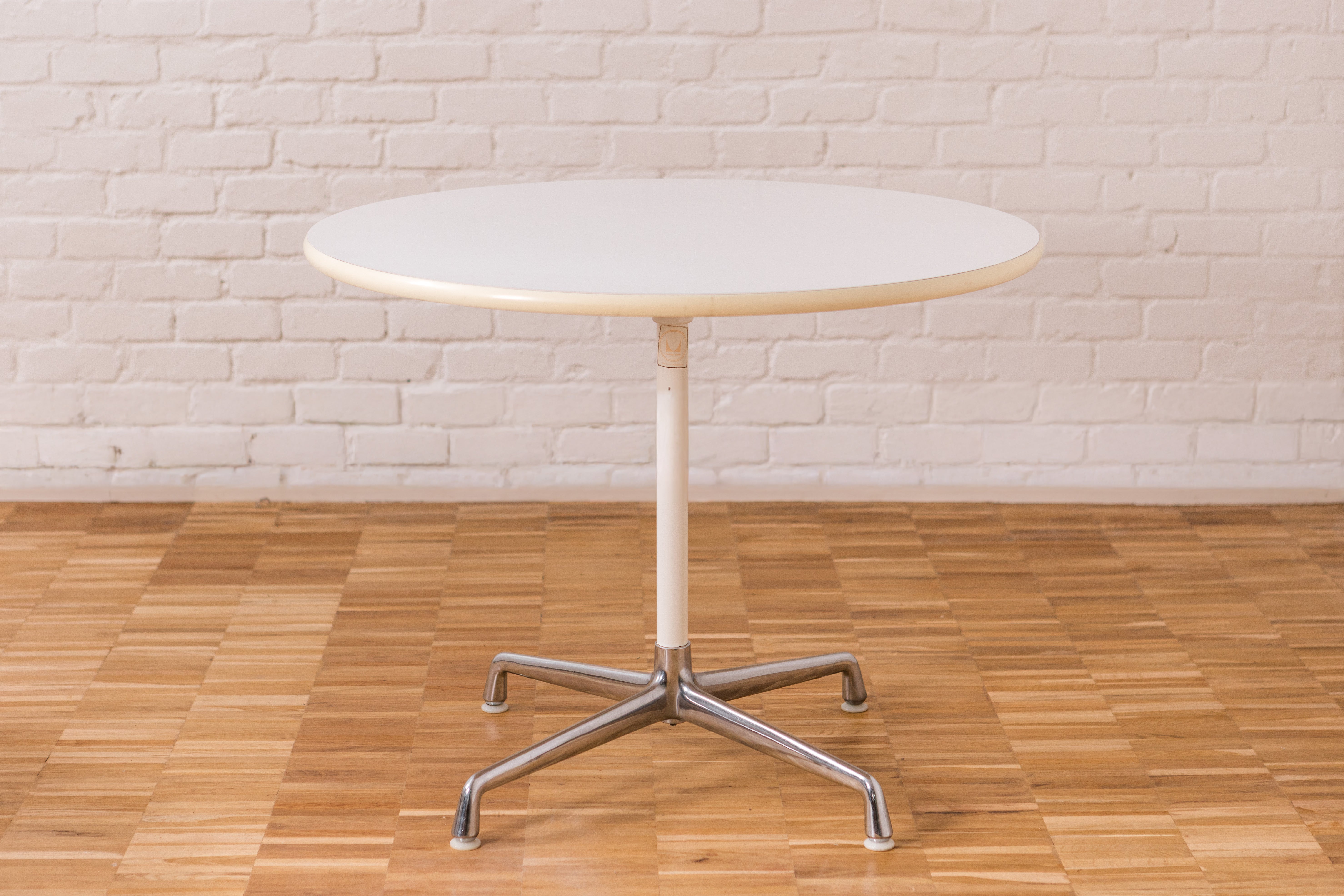 Deze originele Herman Miller-tafel, ontworpen door Charles en Ray Eames, is een tijdloos voorbeeld van mid-century design. Het originele en authentieke Herman Miller-label onderstreept de herkomst en originaliteit van de tafel. Met zijn strakke lijnen en uitgebalanceerde proporties past hij moeiteloos in zowel moderne als klassieke interieurs. De tafel heeft een diameter van 90 cm, waardoor hij ideaal is als eettafel voor kleinere ruimtes of als ruime vergader- of werktafel.