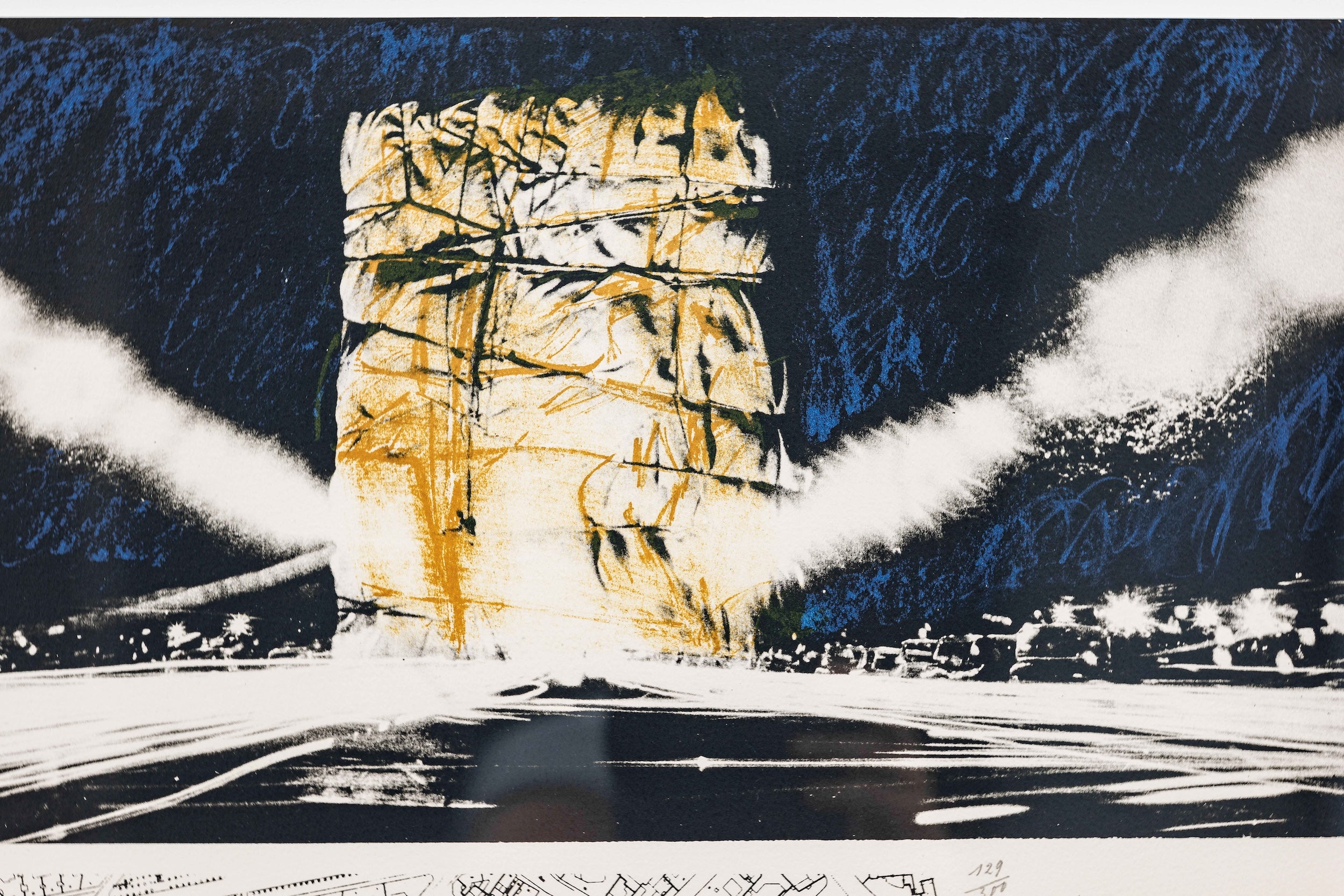 This rare, signed, limited-edition color lithograph on handmade Arches paper by renowned artist Christo presents one of his earliest conceptual designs for the wrapping of the Arc de Triomphe. The work incorporates an authentic piece of fabric, lending it both tactile depth and notable historical resonance. The piece measures 65 × 50 cm and has a depth of 3.5 cm.