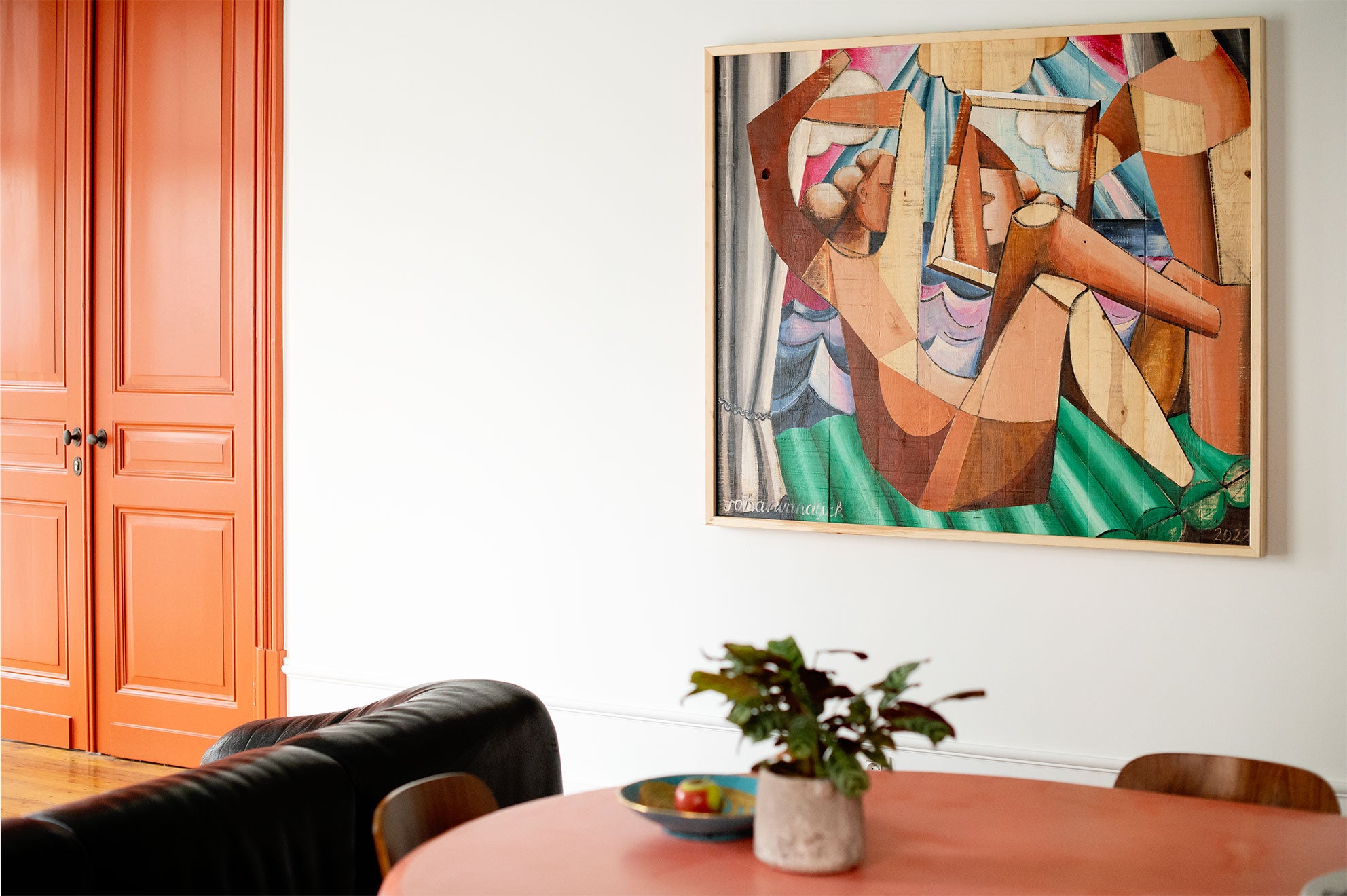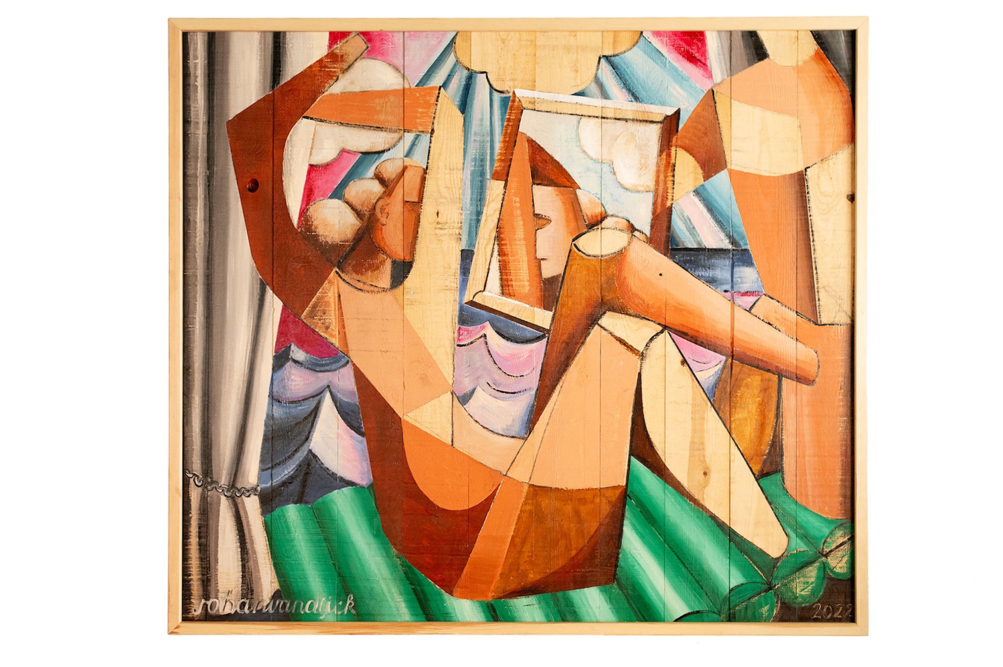 The constructivist approach to form and design, in image and painting, recalls the work of old masters. A reinterpretation of a universal theme, paradisiacal longing, through an architectural construction and formal language.