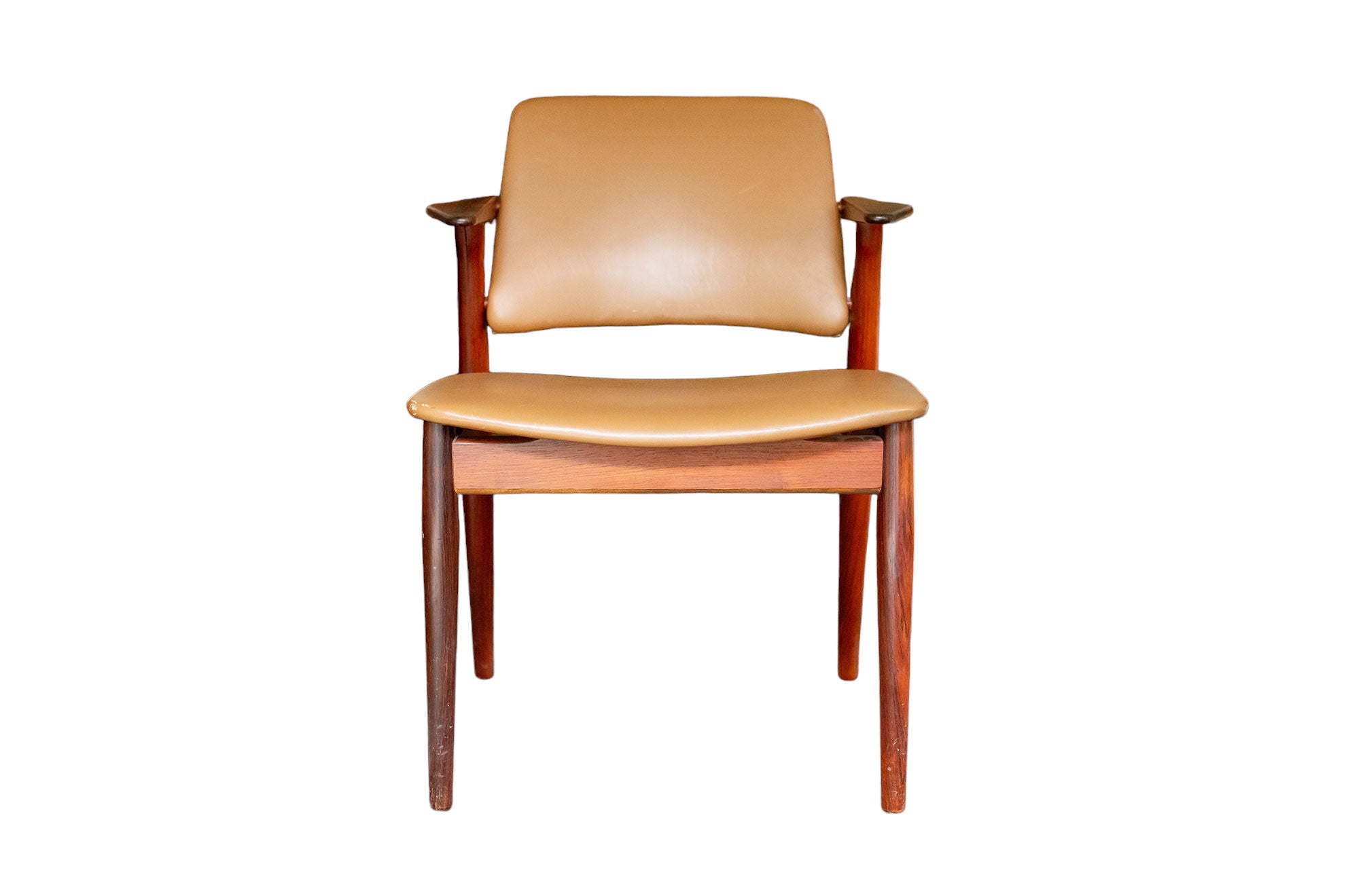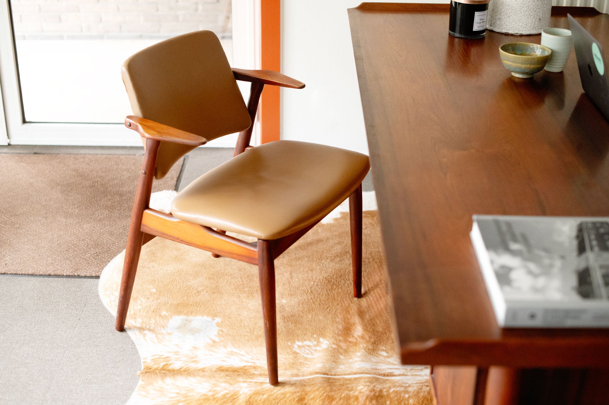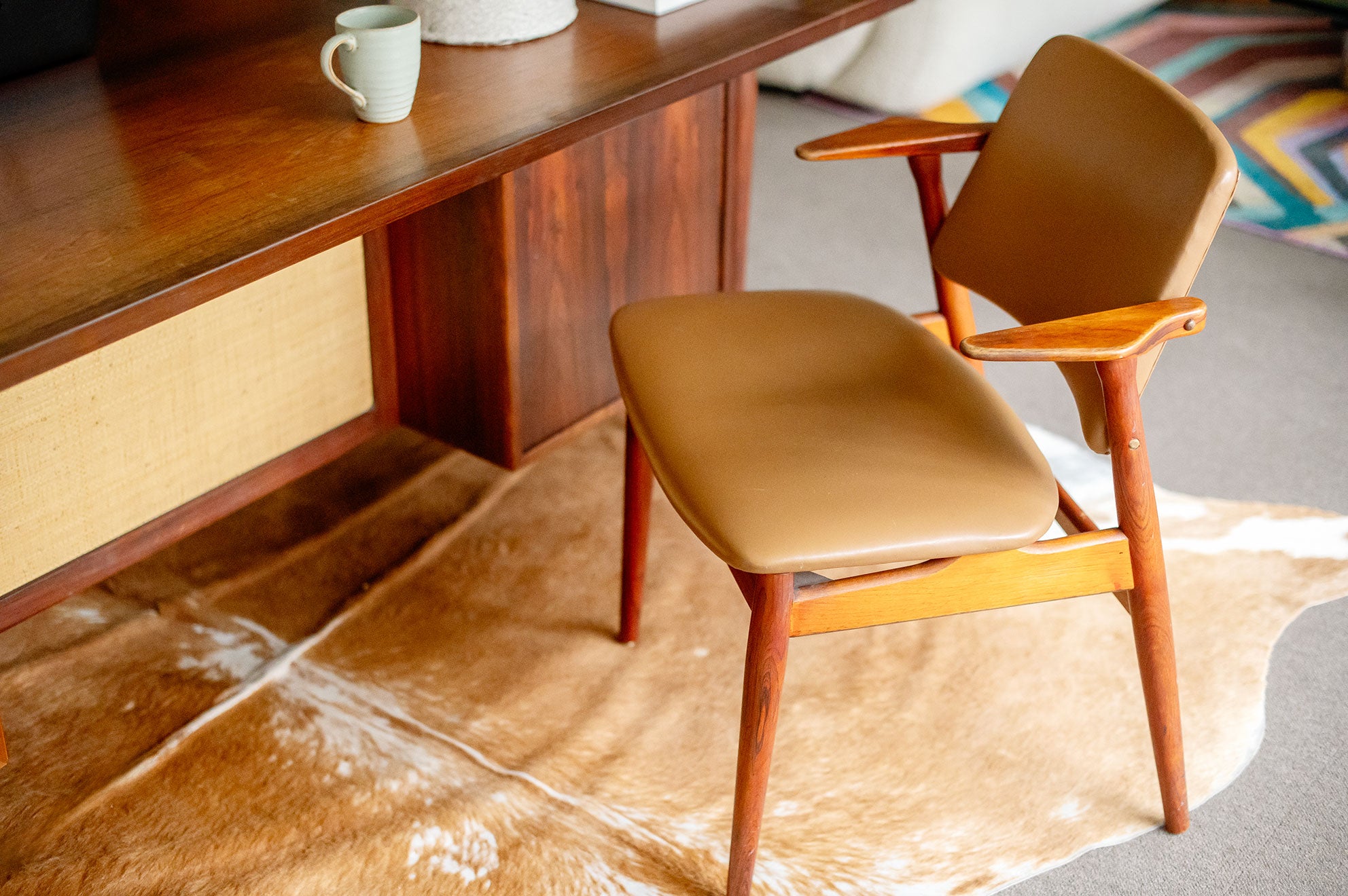 Experience luxury and comfort with this elegant office chair by Danish designer Arne Vodder. Designed for Sibast, this chair features light brown skai leather and elegant framework. Some traces of use but in good solid condition.