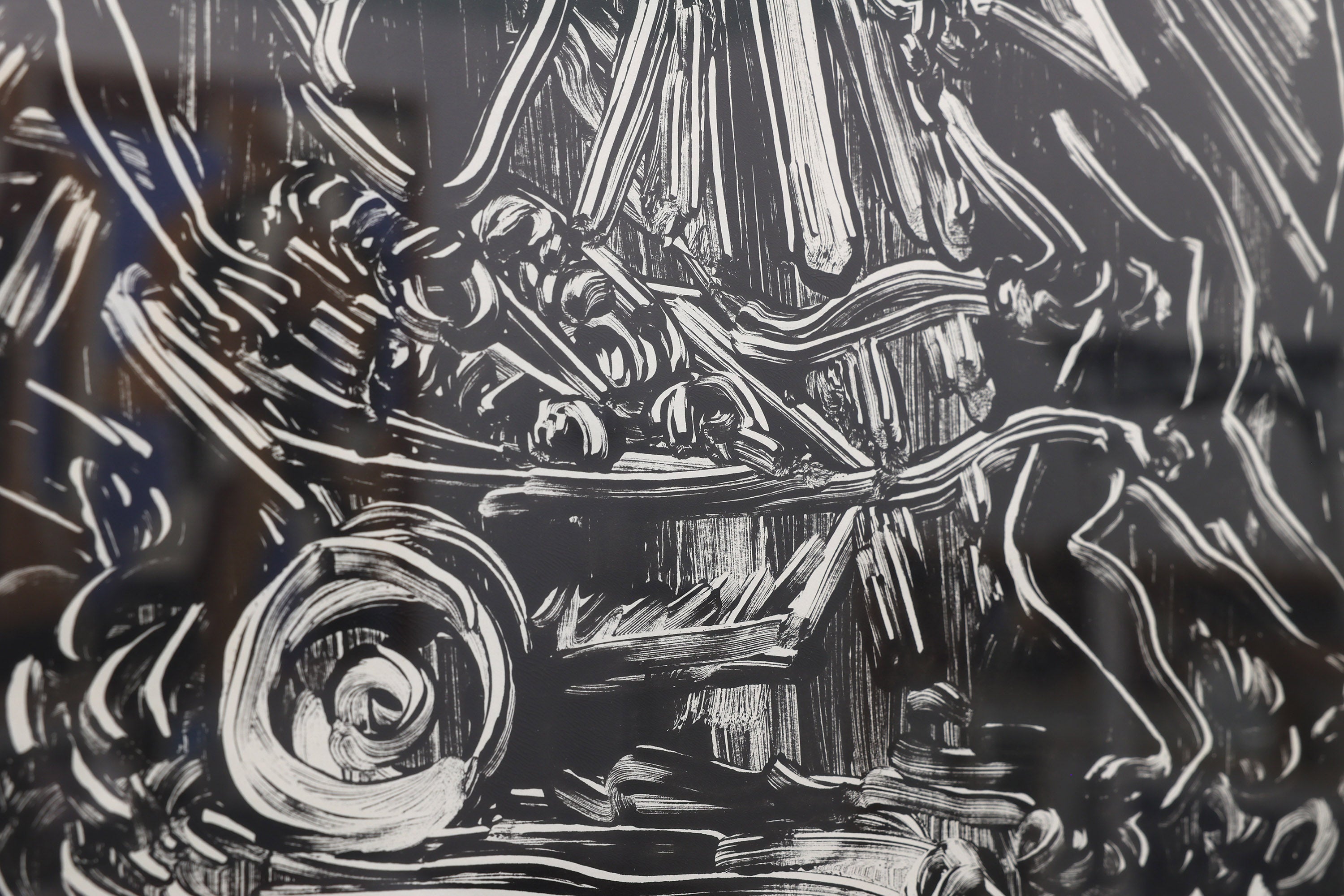 The constructivist approach to form and design, in image and painting, recalls the work of old masters. A reinterpretation of a universal theme, paradisiacal longing, through an architectural construction and formal language.