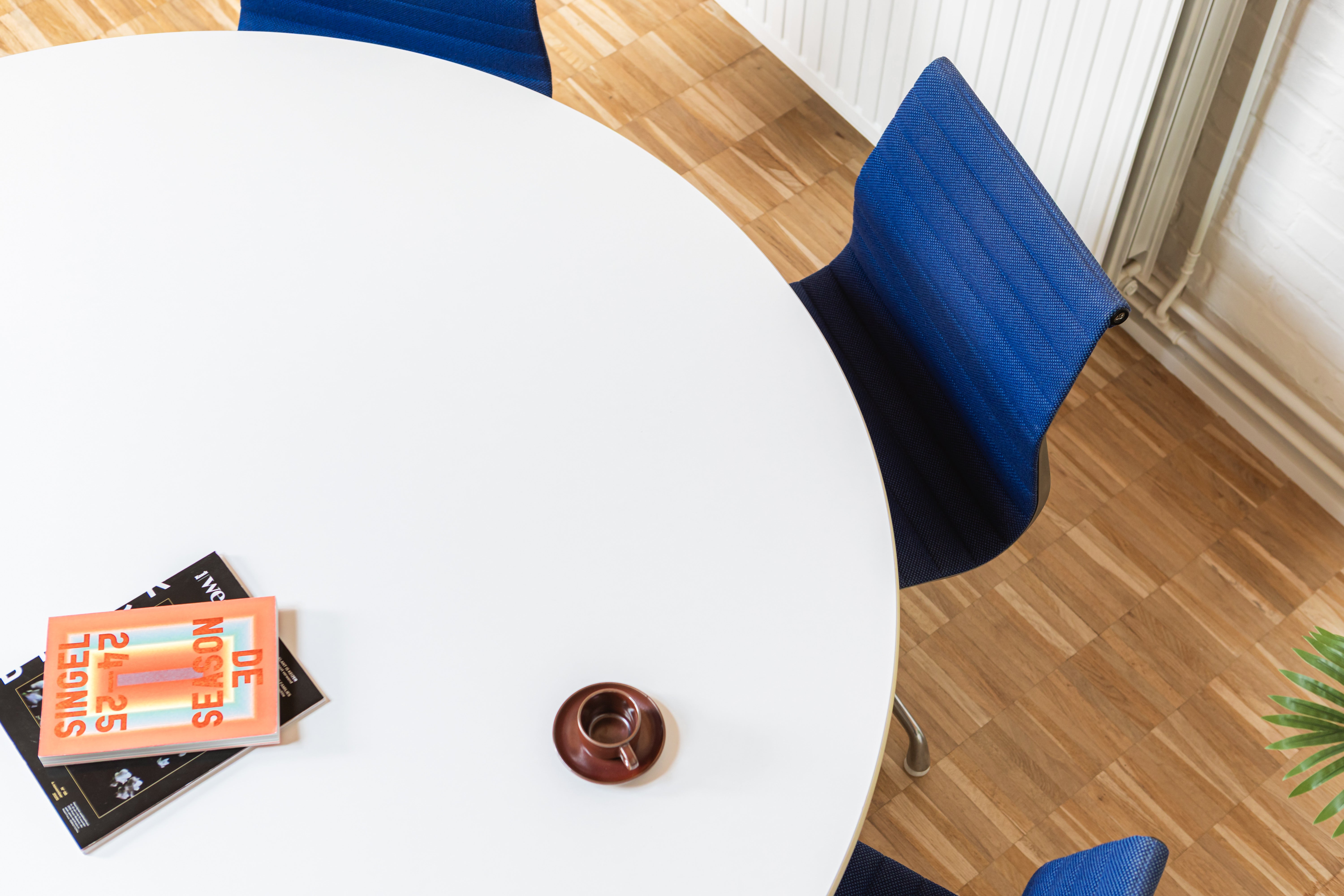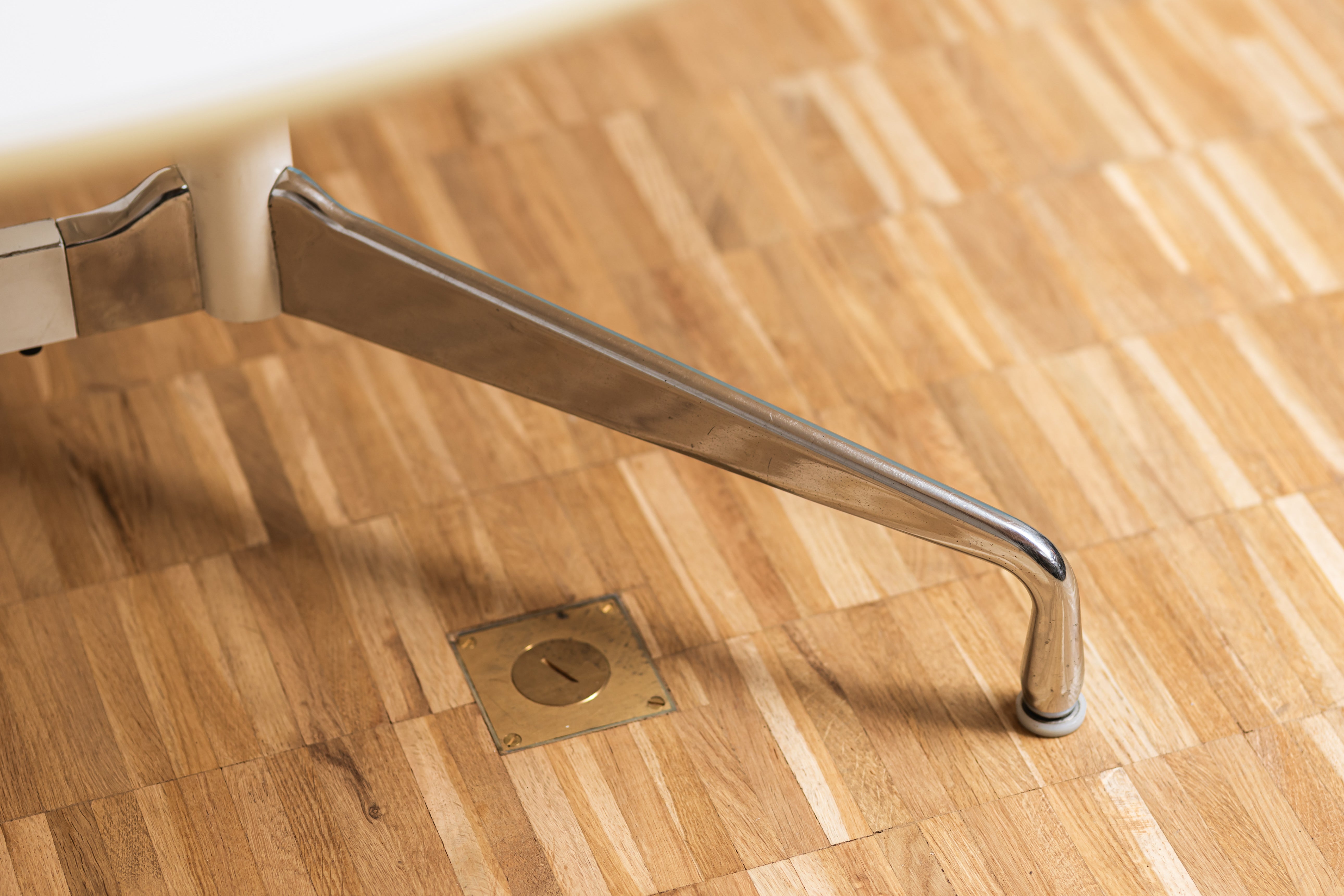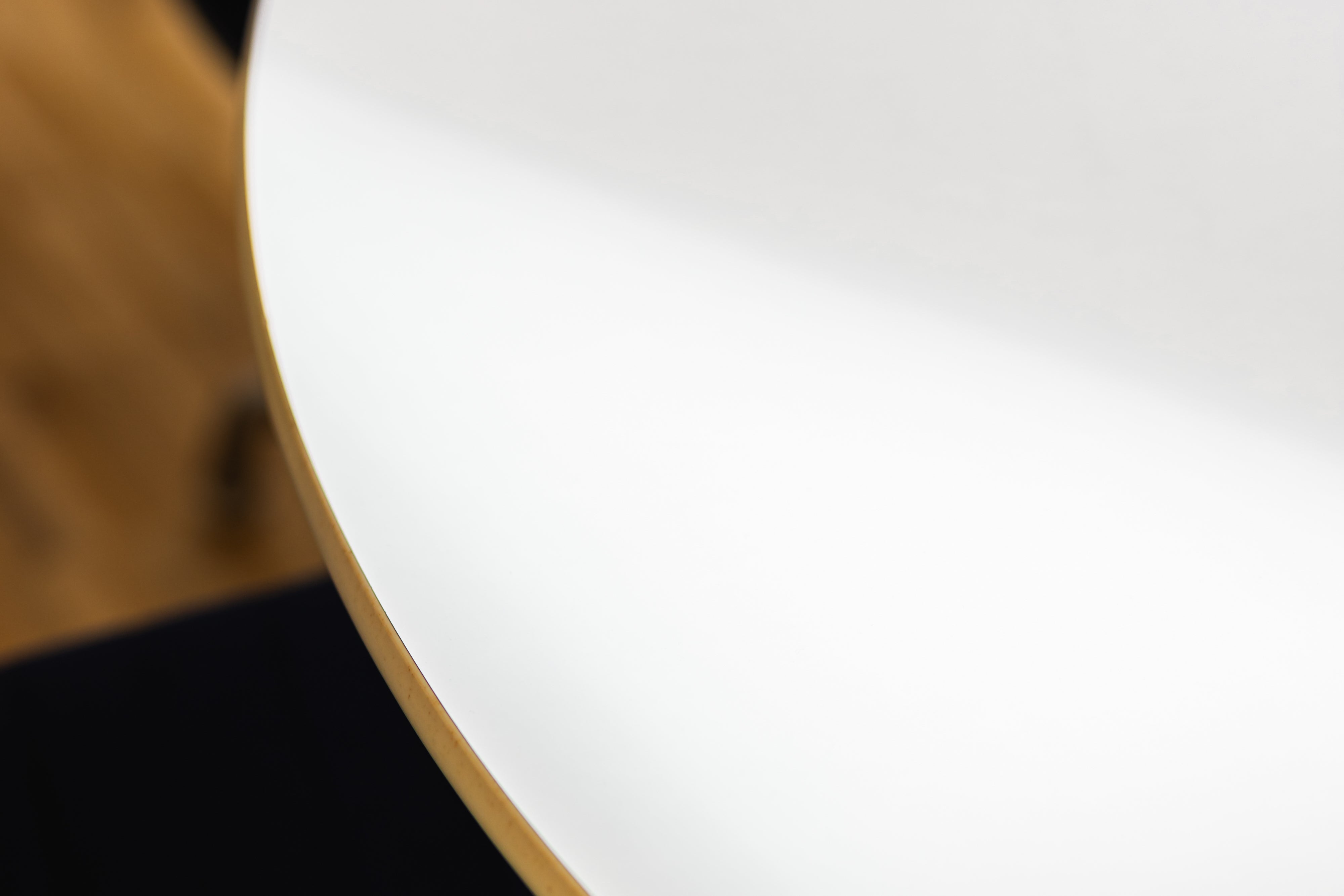 Executed with a white tabletop measuring 170 cm in diameter and a chromed base, this example reflects the original design intent with a crisp, modern finish. Its clean lines and carefully considered proportions make the table equally suited for dining rooms, meeting spaces, and creative work environments.