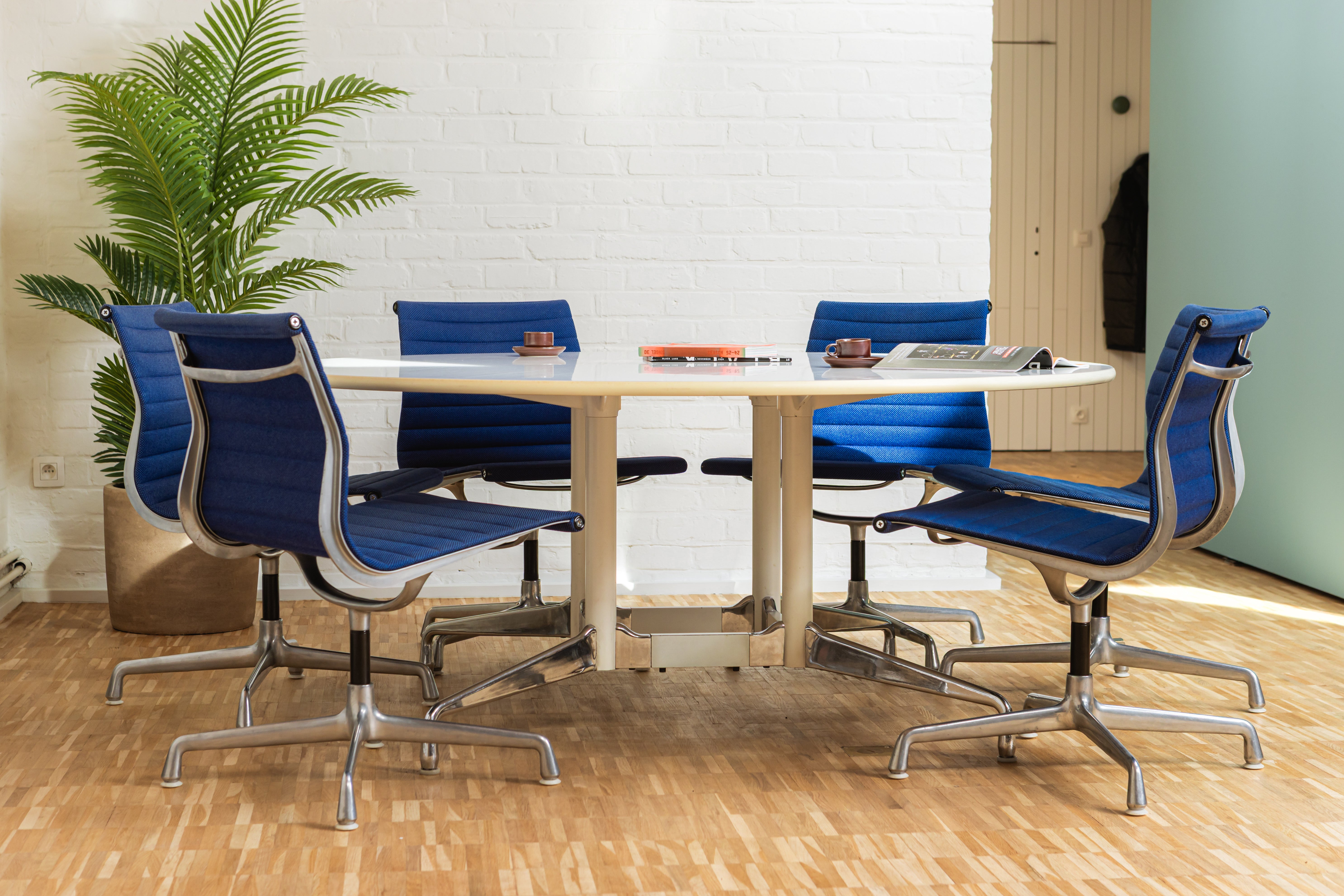 It can form a complete set with the six matching EA 105 Aluminium Swivel Chairs by Charles & Ray Eames for Herman Miller, all crafted to complement each other as a cohesive ensemble.