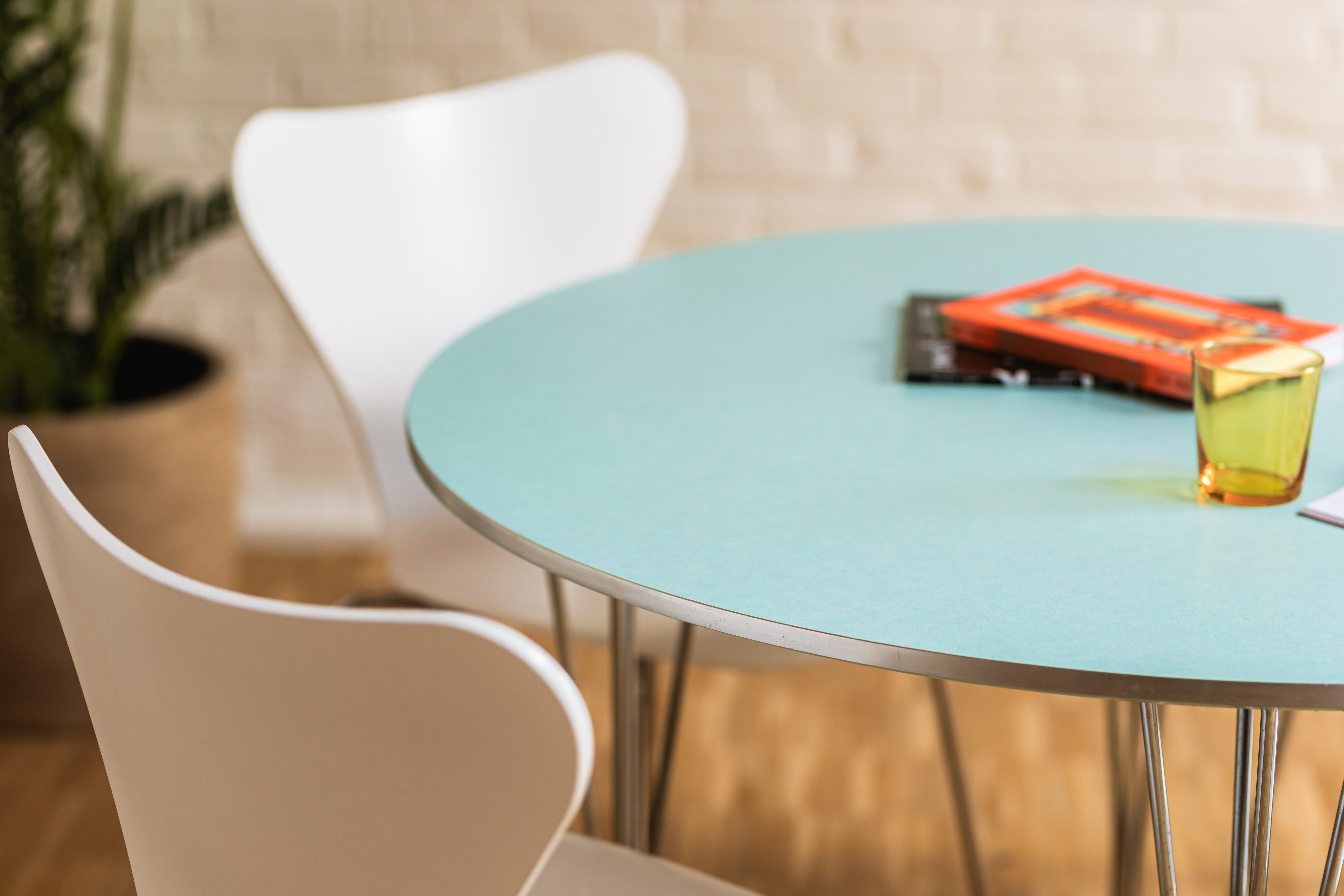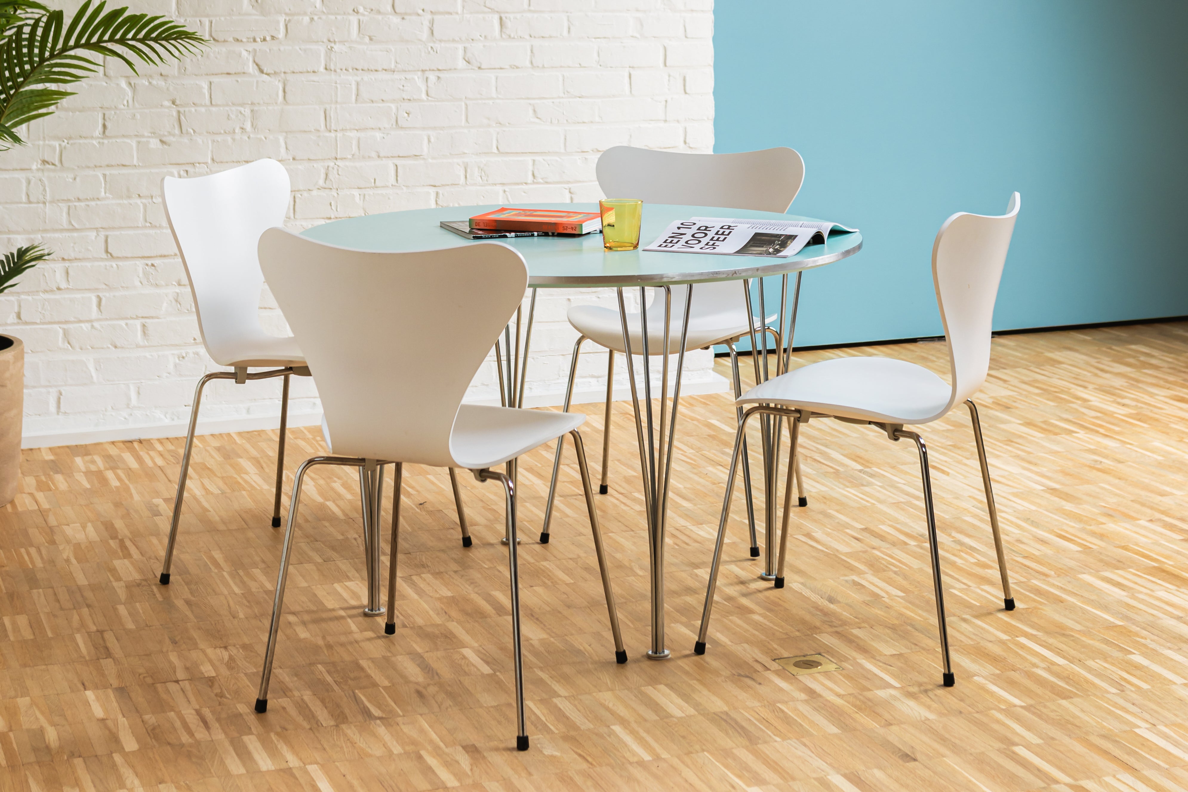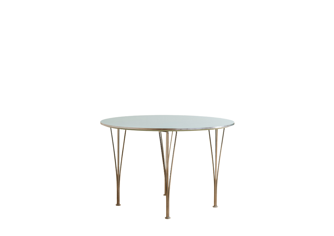 This timeless dining set brings together three Scandinavian designers in one refined composition. The Supercircular dining table (model B603), designed by Piet Hein and Bruno Mathsson, is paired with the iconic Butterfly chairs by Arne Jacobsen, all produced by Fritz Hansen.