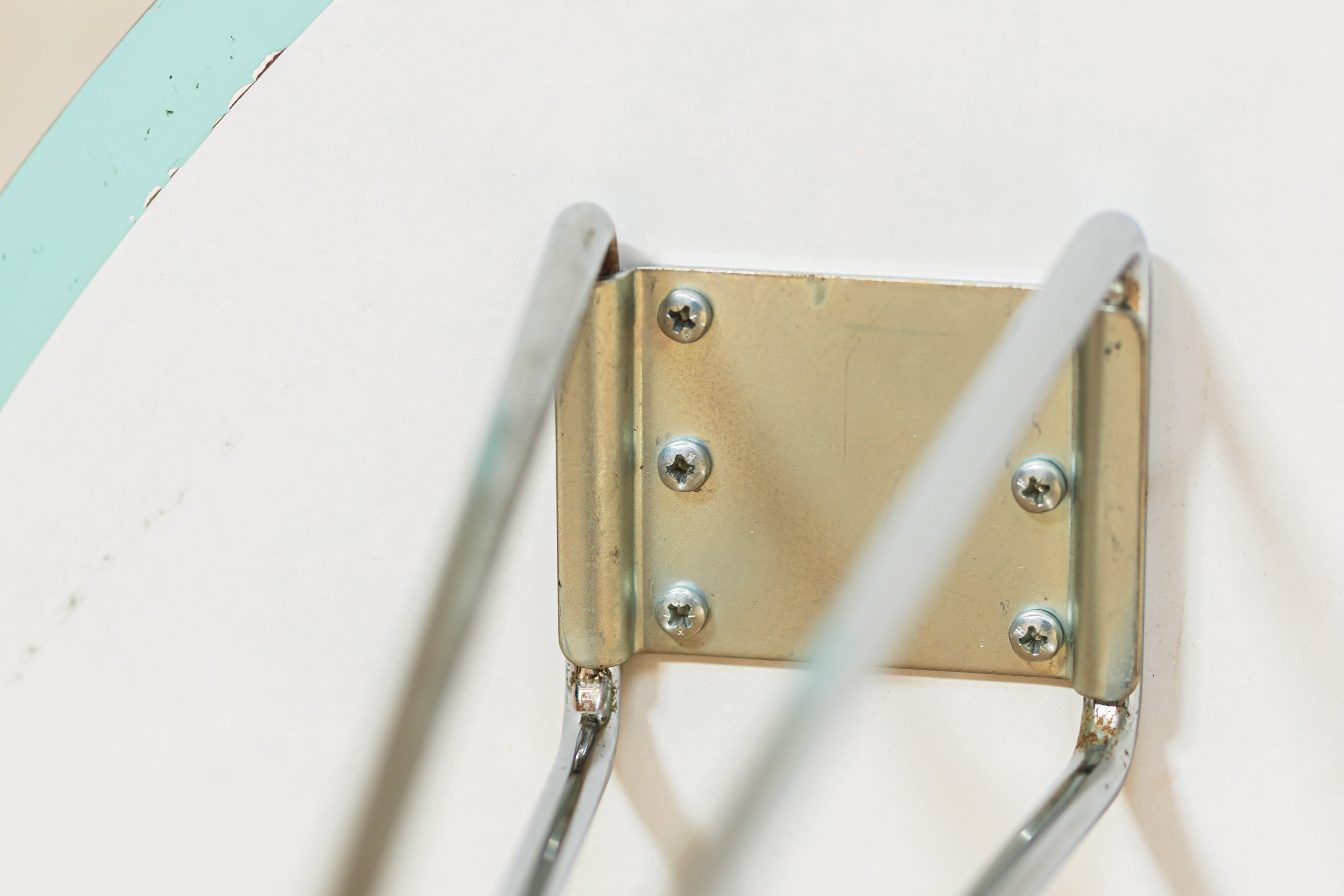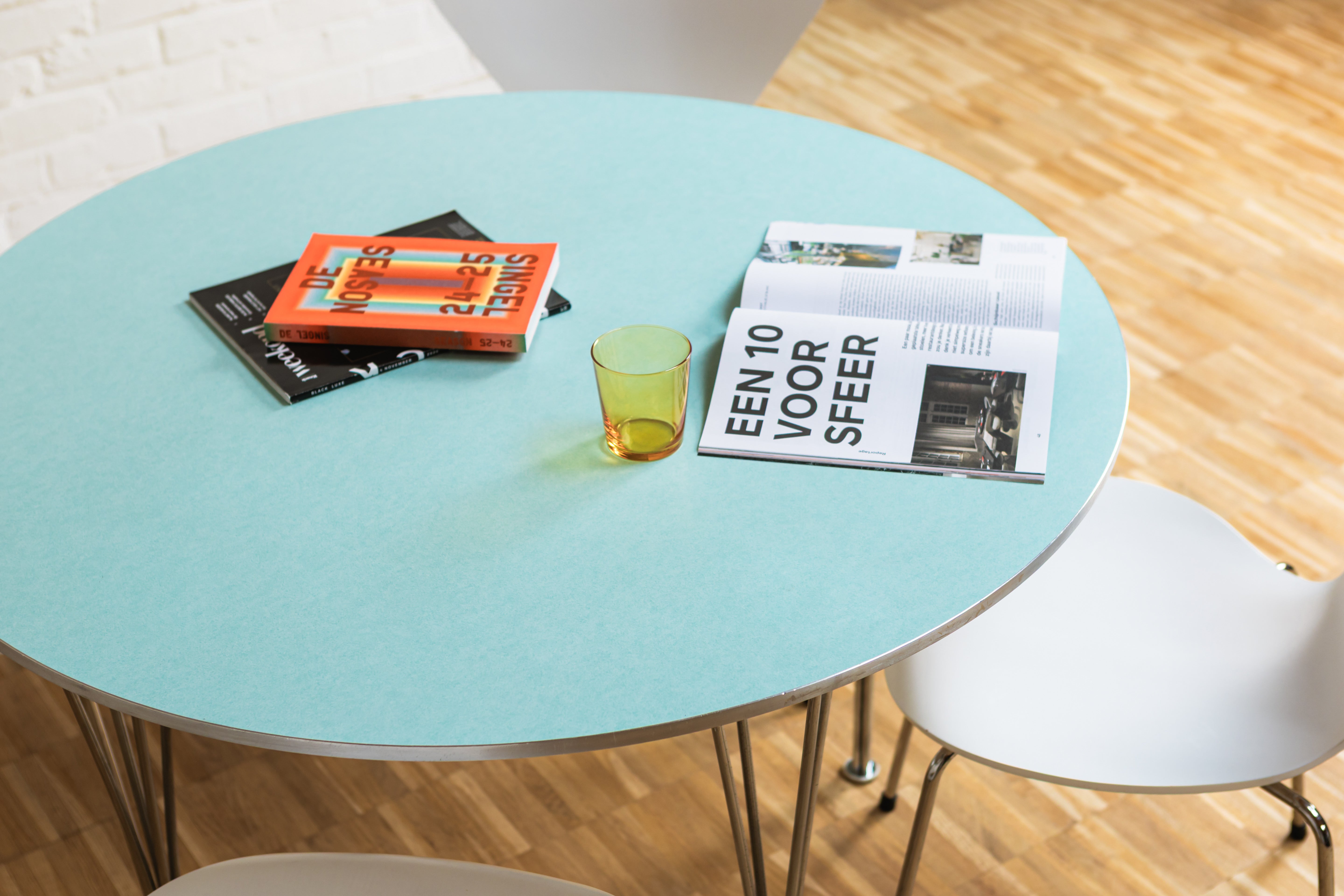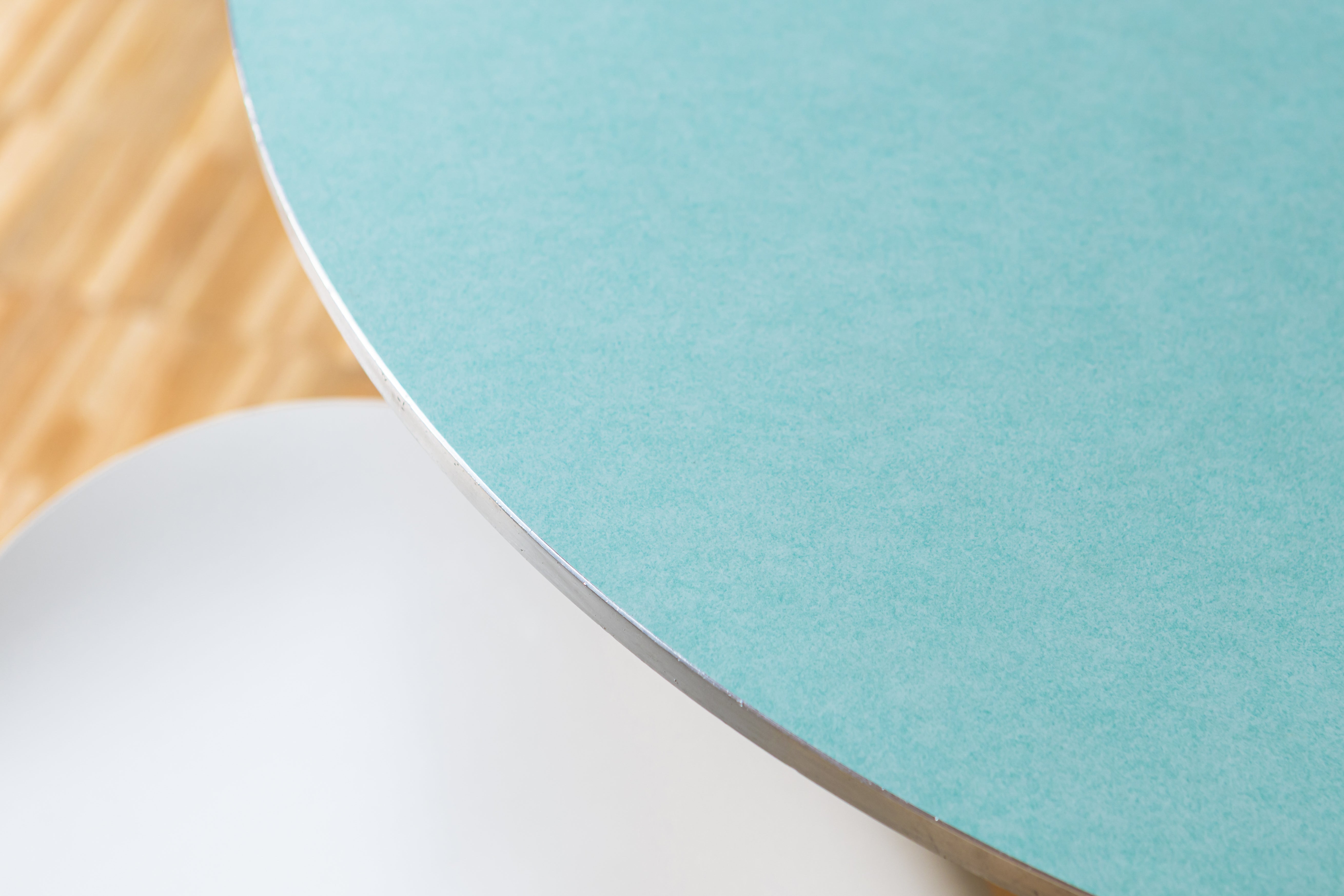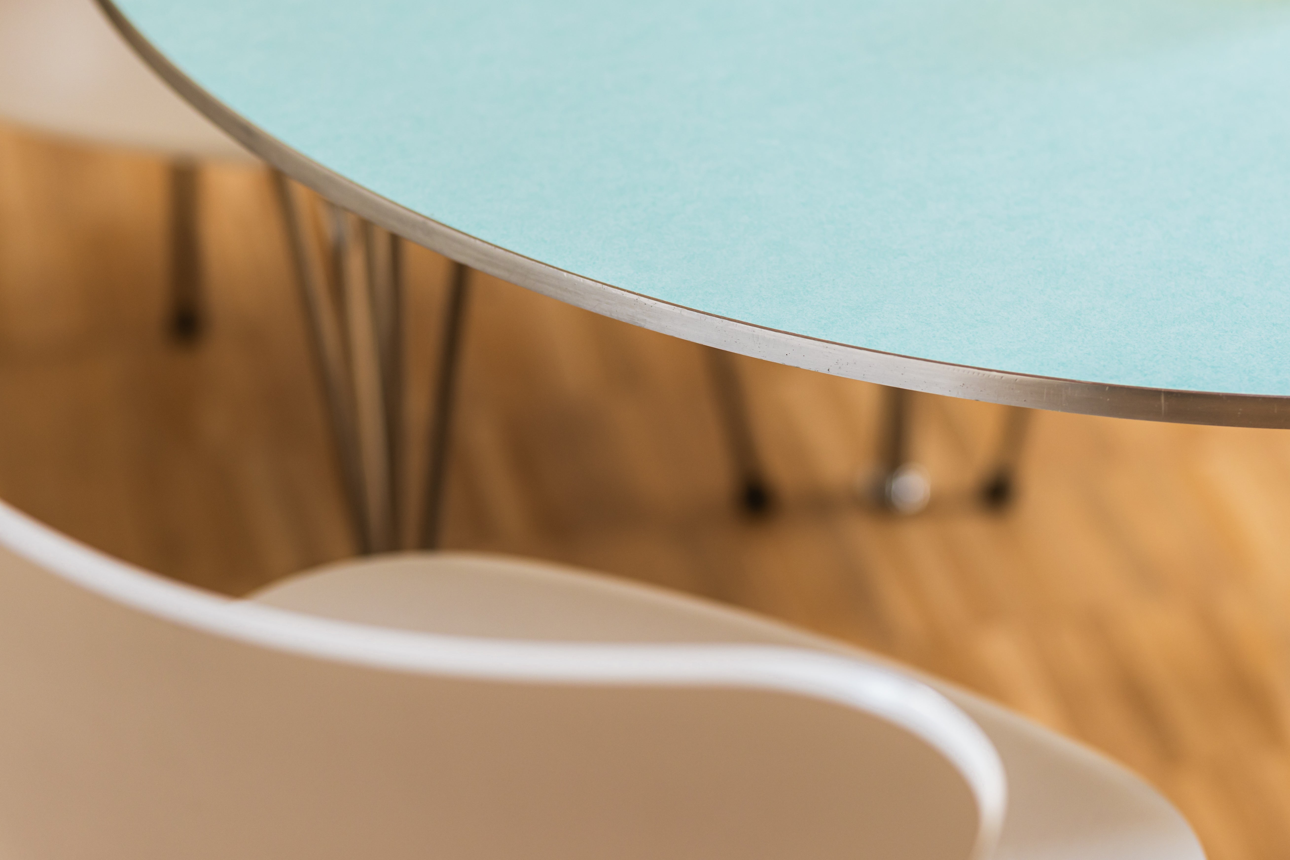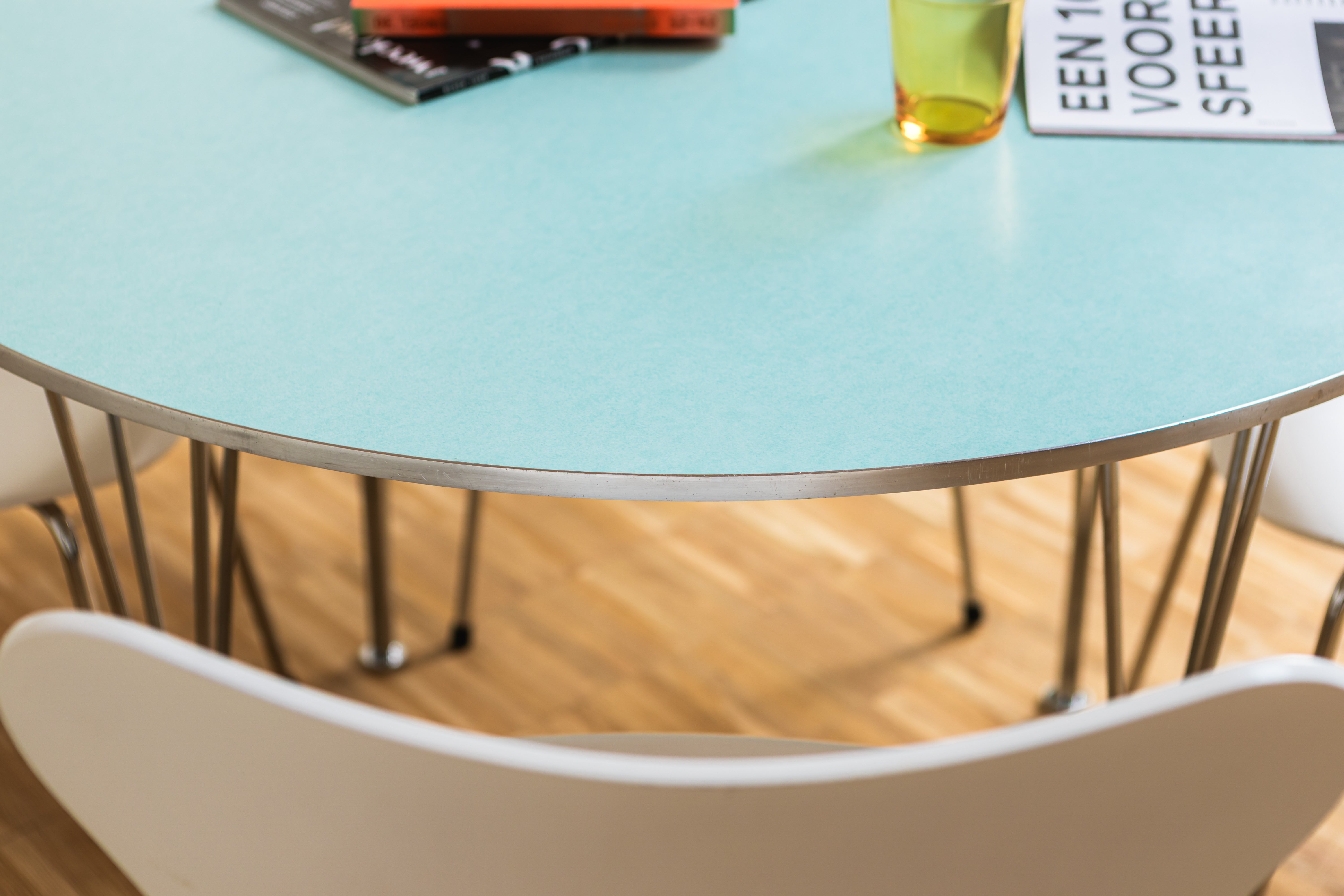 The table features a sleek blue-green Fenix tabletop, known for its ultra-matte, soft-touch surface and high resistance to fingerprints and scratches. A refined brushed matte aluminium edge subtly frames the tabletop, while the elegant chromed steel base adds a bright, architectural contrast and ensures excellent stability.