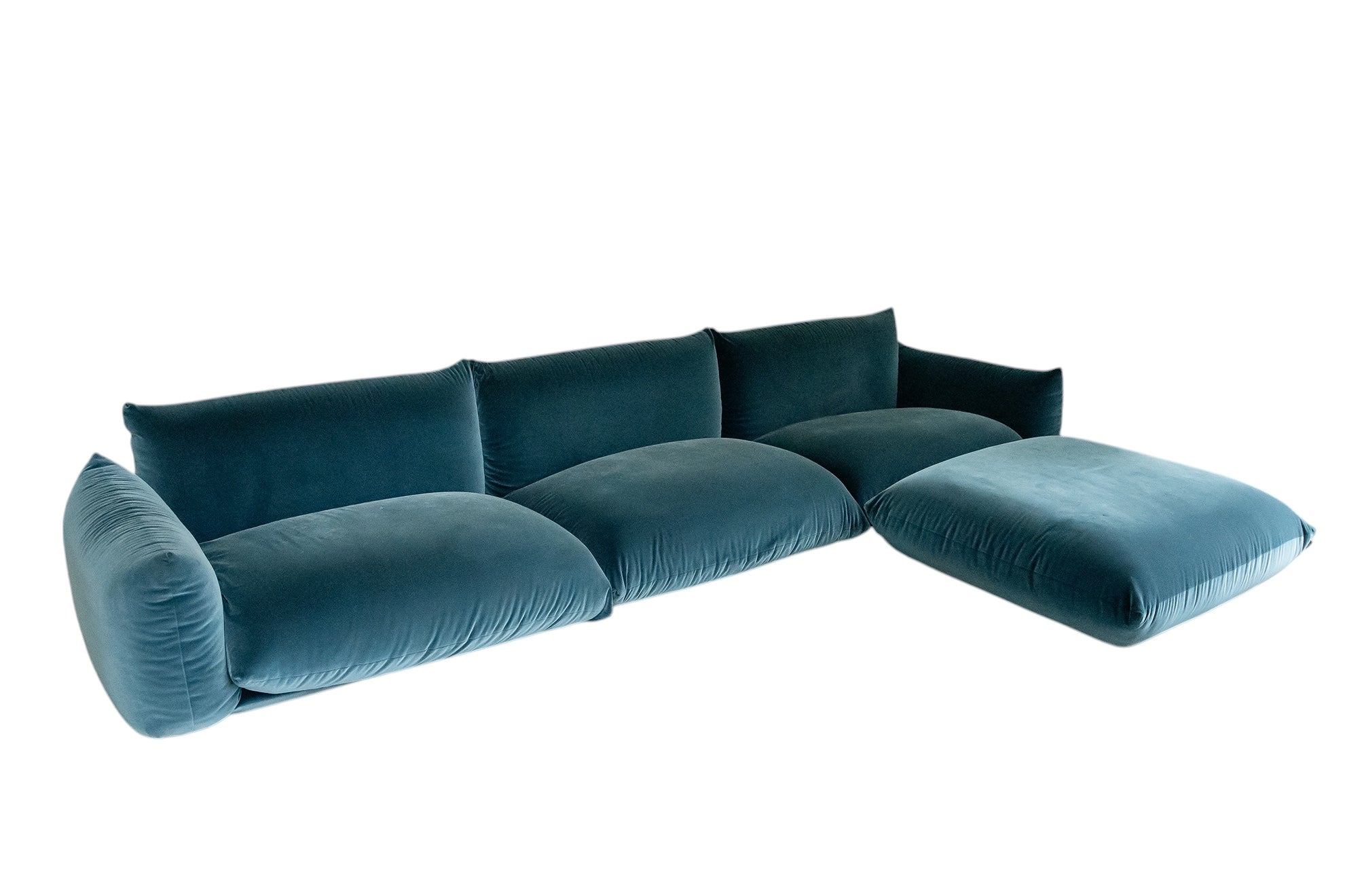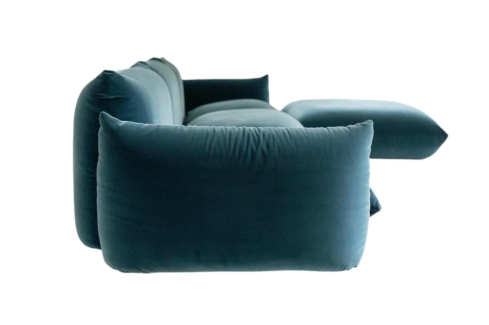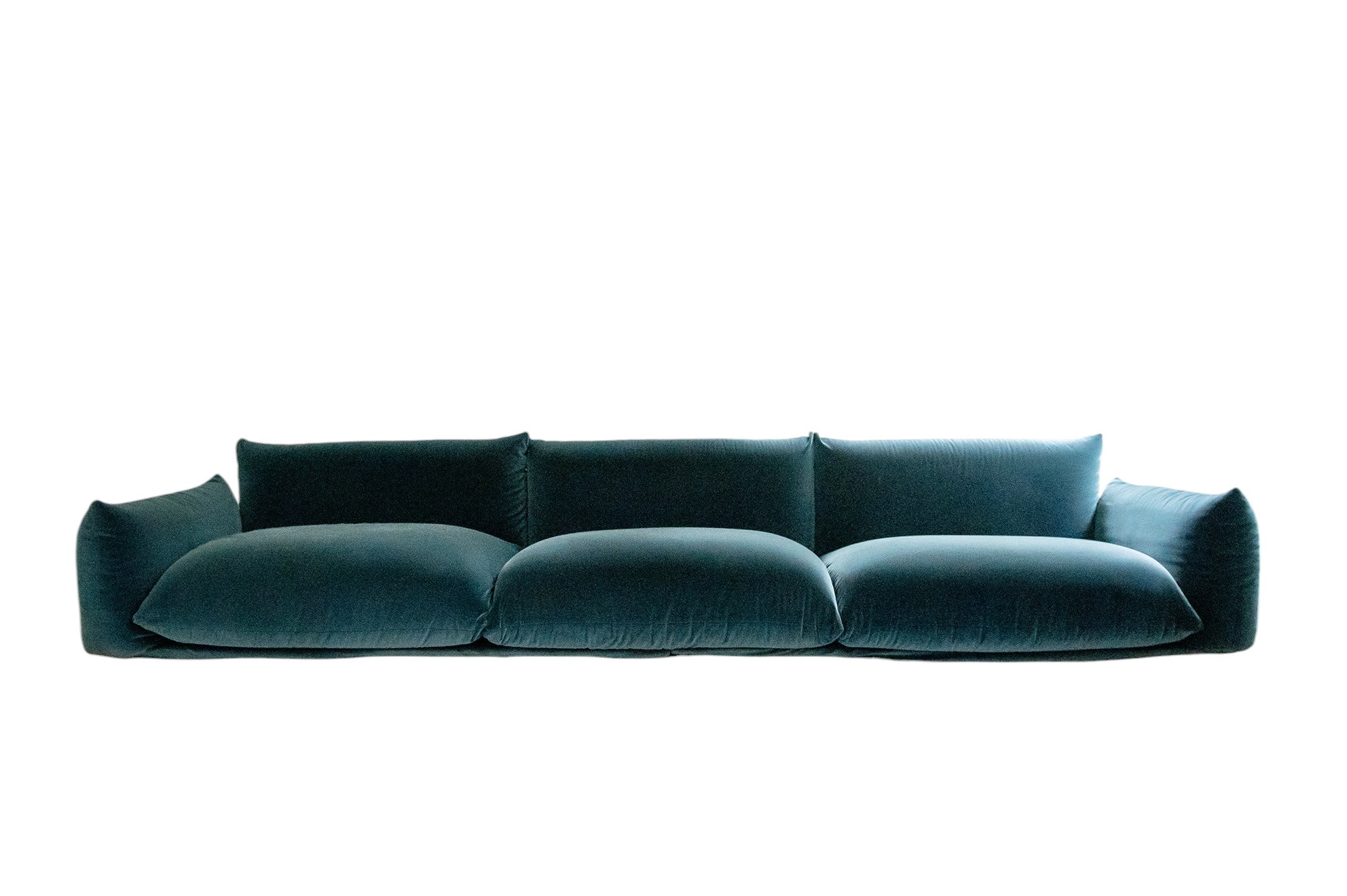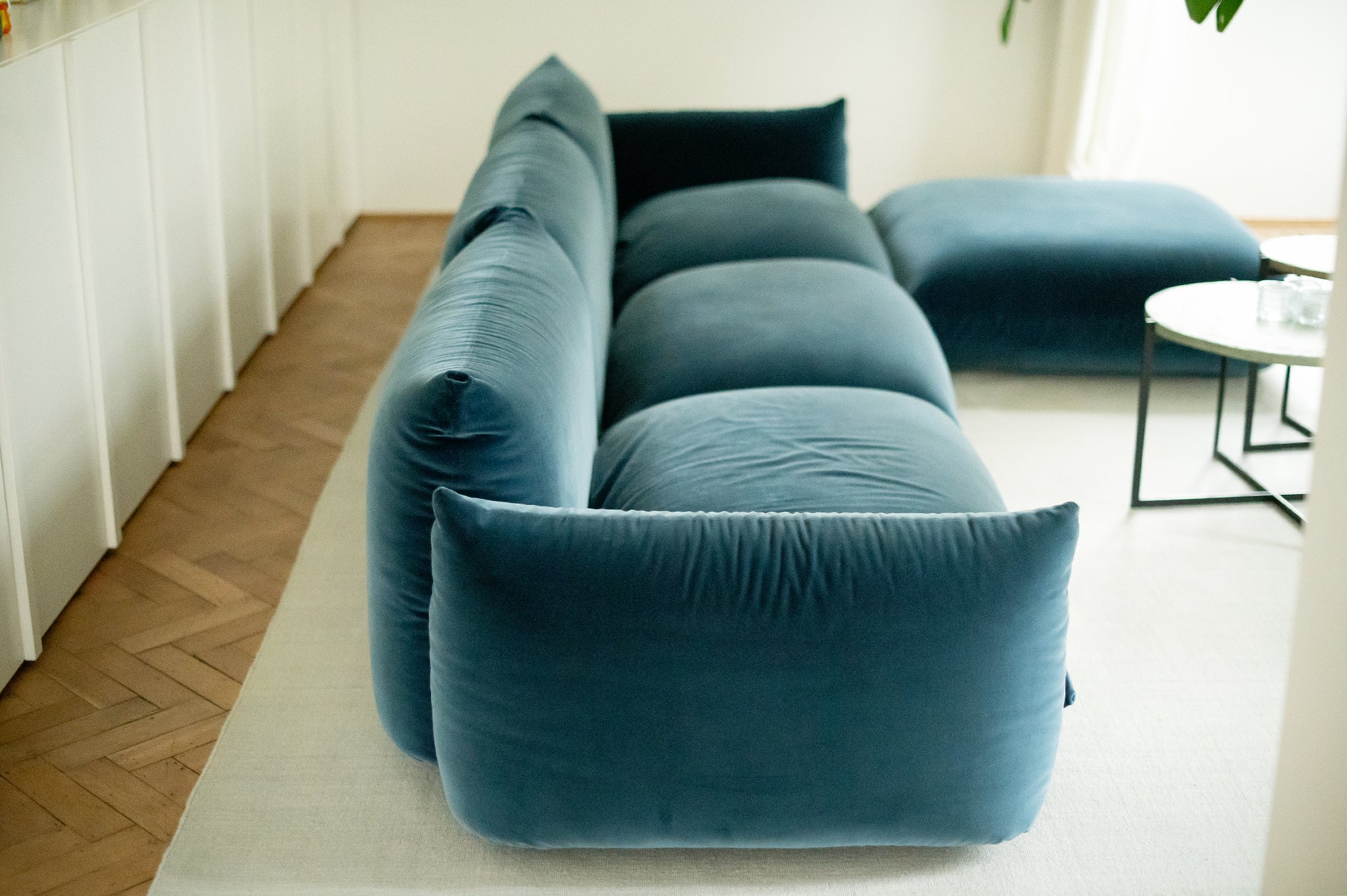 The iconic design and wide modularity make the Marenco sofa a true standout, especially in this vibrant blue velvet. Designed by Mario Marenco in 1970, it remains a classic of Italian design. Featuring large, rounded cushions, the Marenco sofa beautifully combines both strength and comfort. This one has an exceptional length of 354 cm and comes with a pouf.
