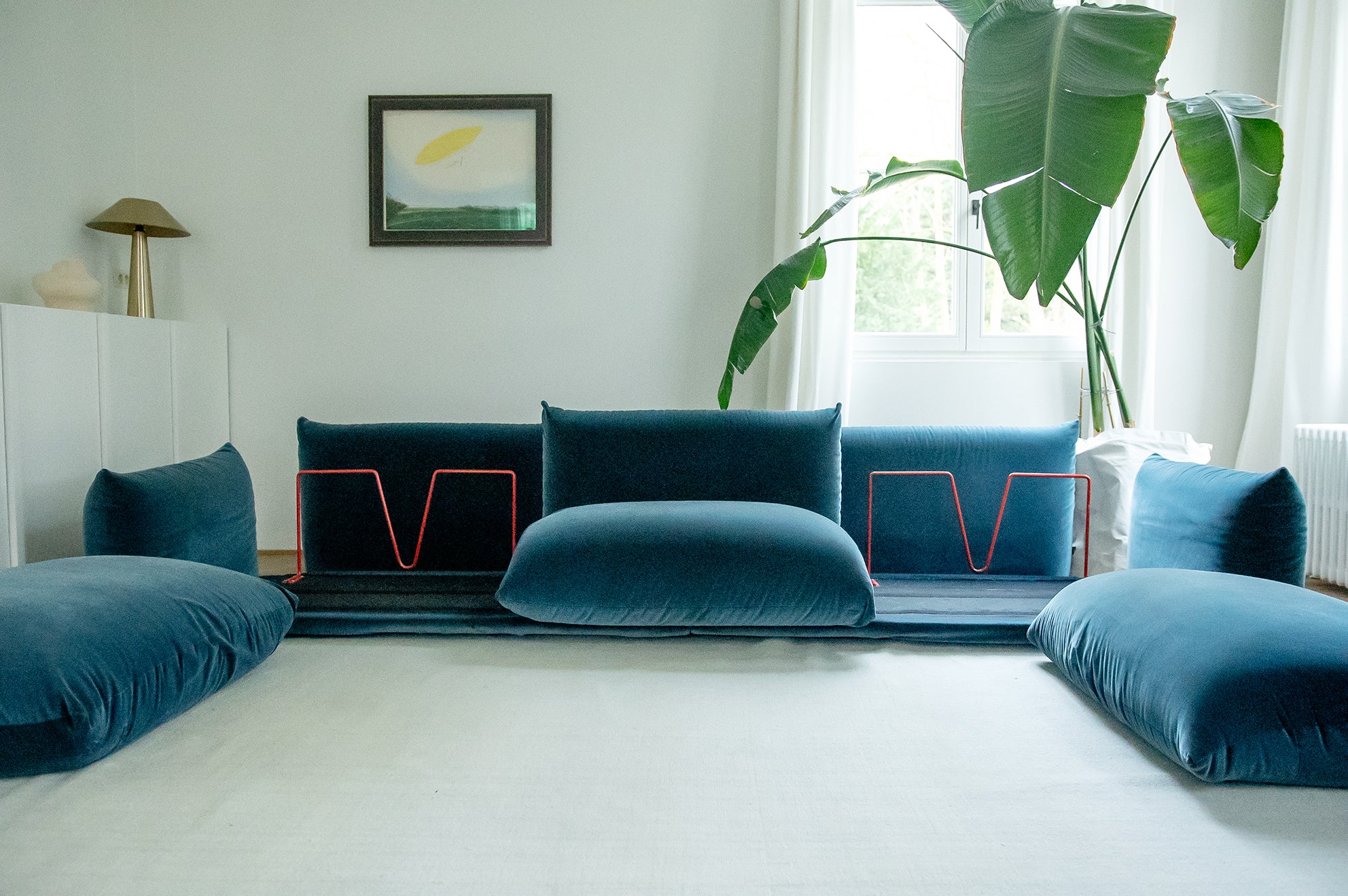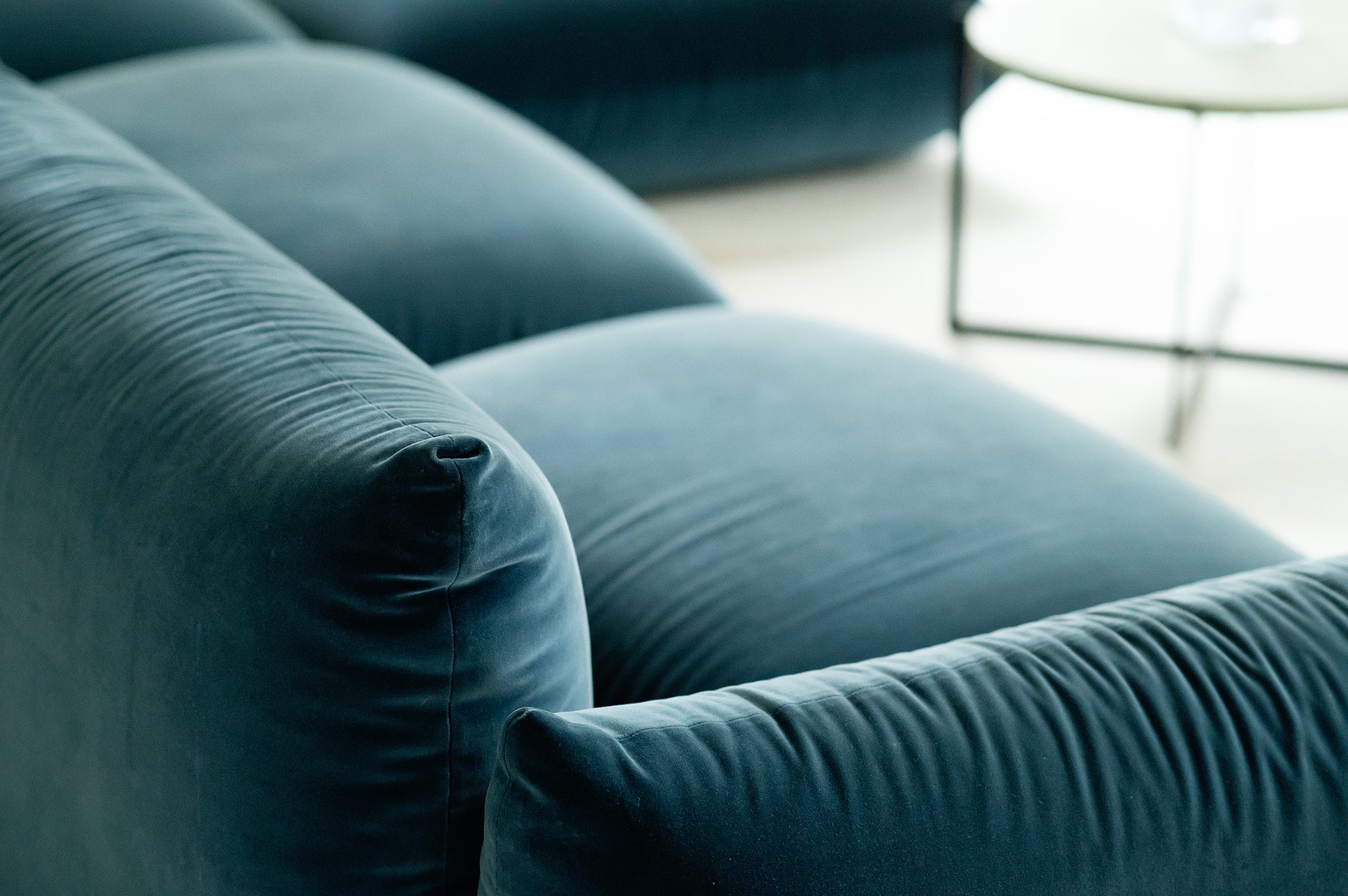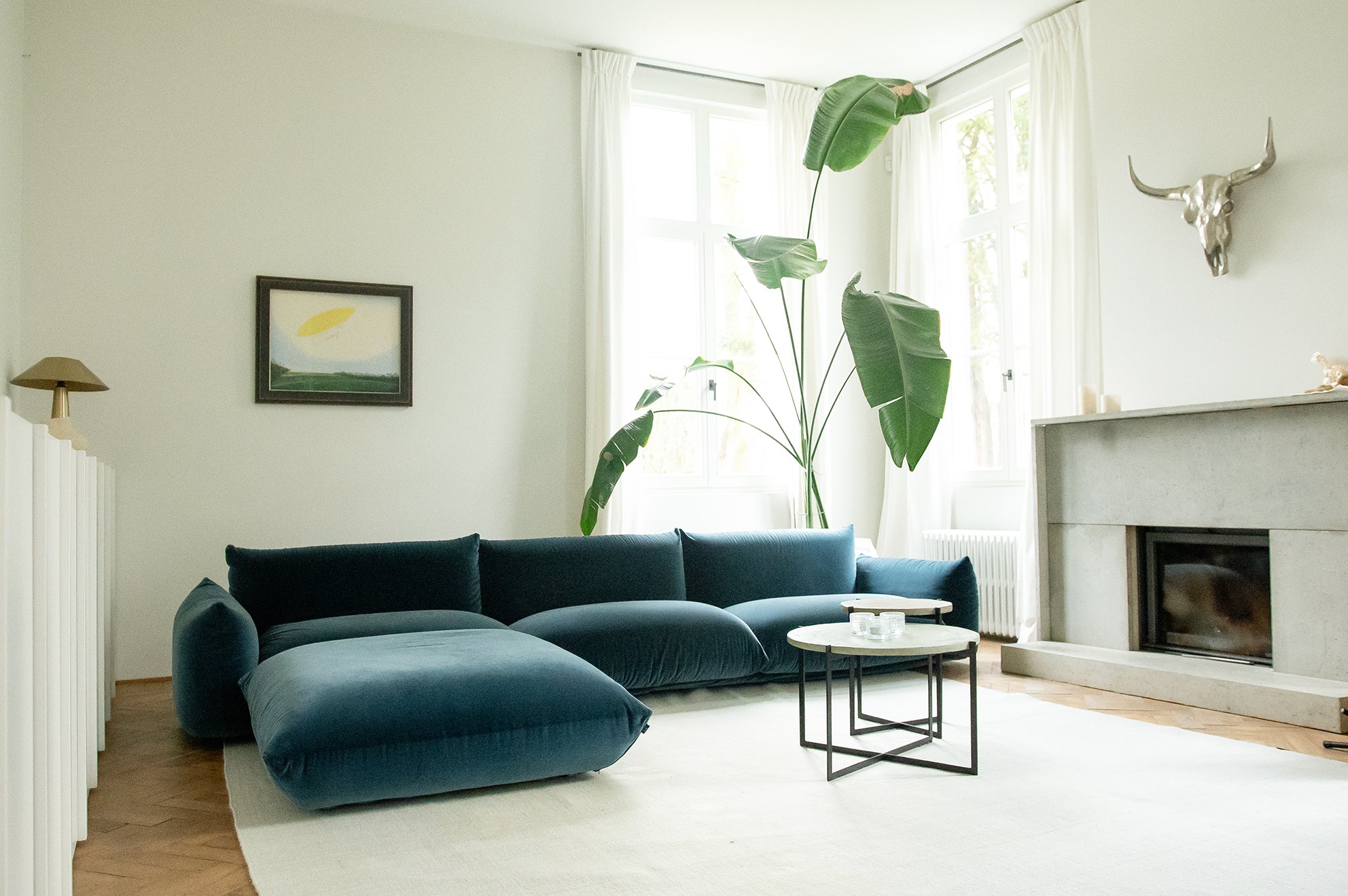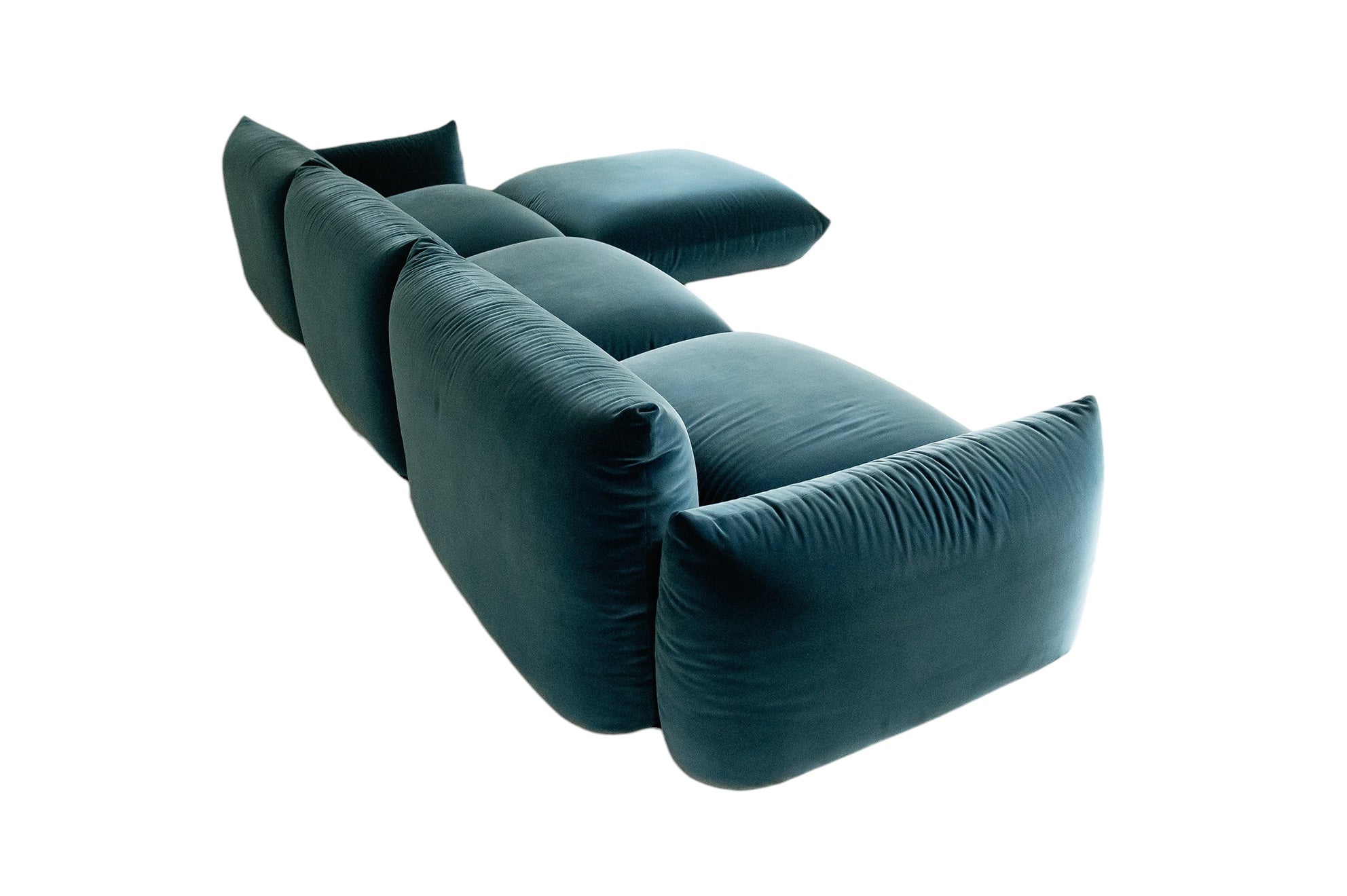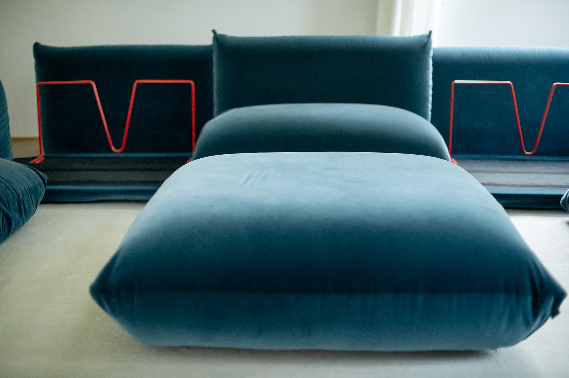 The iconic design and wide modularity make the Marenco sofa a true standout, especially in this vibrant blue velvet. Designed by Mario Marenco in 1970, it remains a classic of Italian design. Featuring large, rounded cushions, the Marenco sofa beautifully combines both strength and comfort. This one has an exceptional length of 354 cm and comes with a pouf.